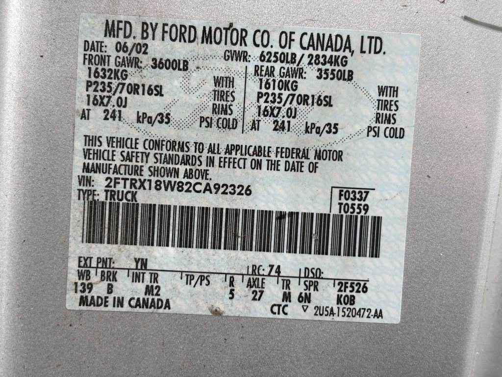 Location: Eugene OR ***End-User Consignment*** VIN: 2FTRX18W82CA92326 Engine: Triton 4.6L 8cyl Gas Transmission: 5 Speed *Clutch does not engage - Per seller motor runs* Leer canopy, tow package, side steps, power windows, power mirrors, power locks, cruise control, A/C, AM/FM/CD, spring suspension, 235/70R16 tires.*This item is located in Eugene, Oregon and can be viewed by appointment only. To schedule a preview or to ask questions about this item call 888-230-8840 * Miles: 171,552