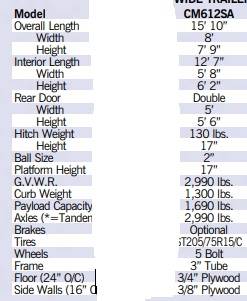2002 Forest River Cargo Mate Silver Crown Series Trailer, GVWR 2,990 lbs., Capacity 1,690 lbs., Interior dimensions12'7" x 5'8" x 6'2" (l x w x h), Exterior dimensions 15'10" x 8' x 7'9", Curb wt 1,300 lbs., 3/4" plywood floor, 2" ball connector