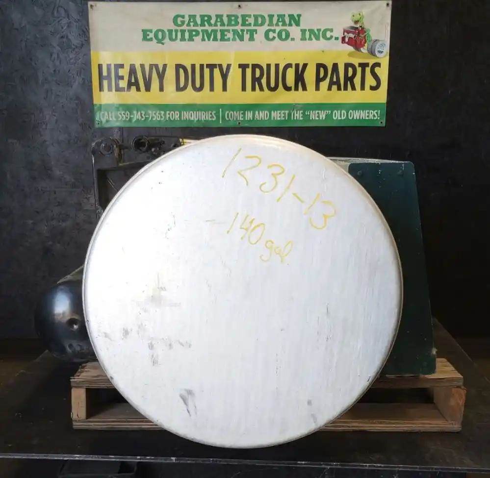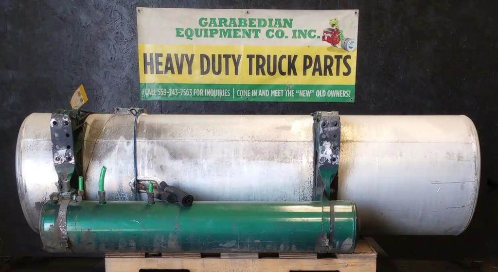 Passenger Side Fuel Tank, 82"L x 23"Dia, P/N A03-27240-181, 140 gallon Capacity, Front Fill, w/ Steps, Brackets and Air Tank. Vertical Step Bracket Slightly Bent.