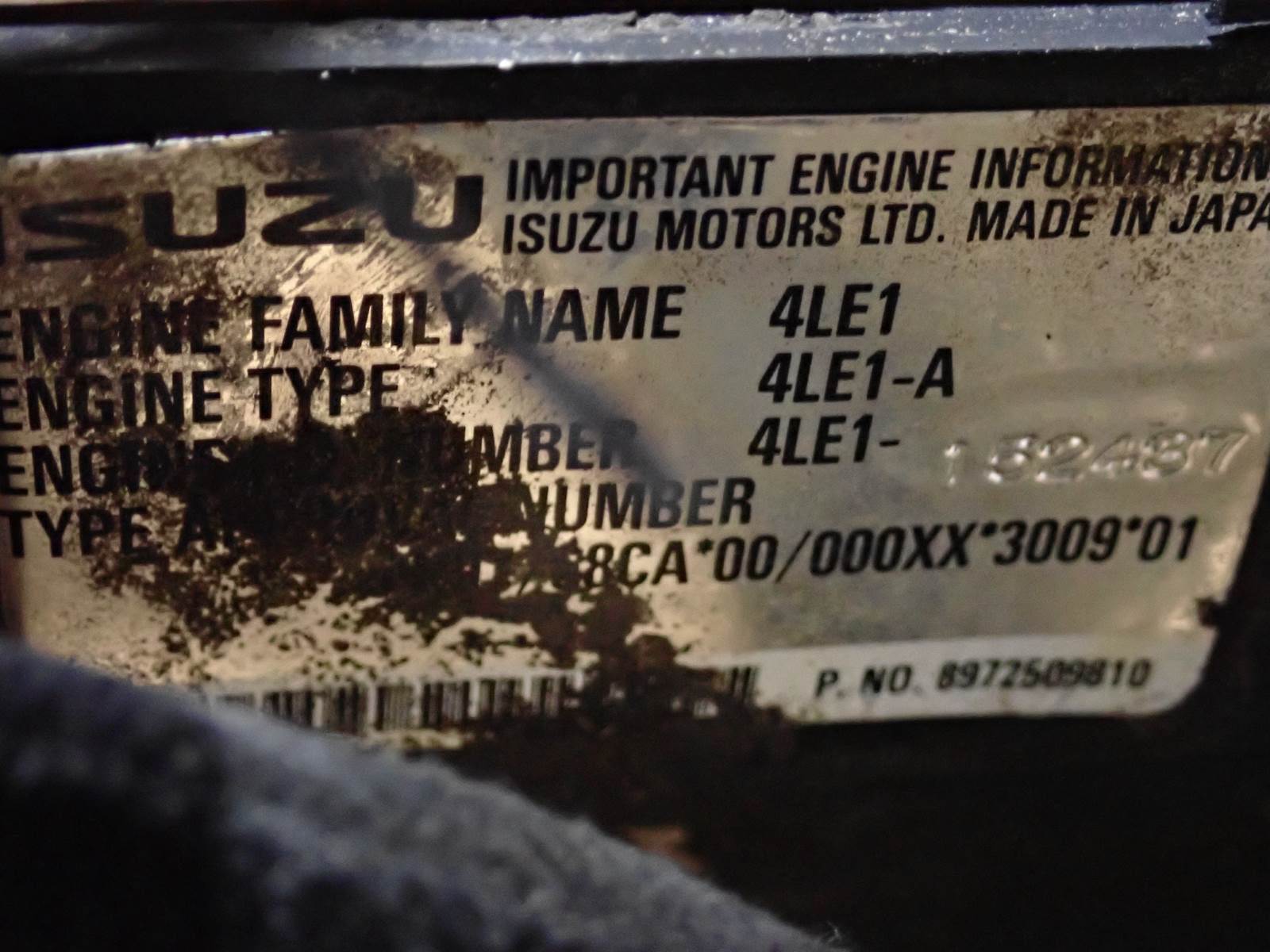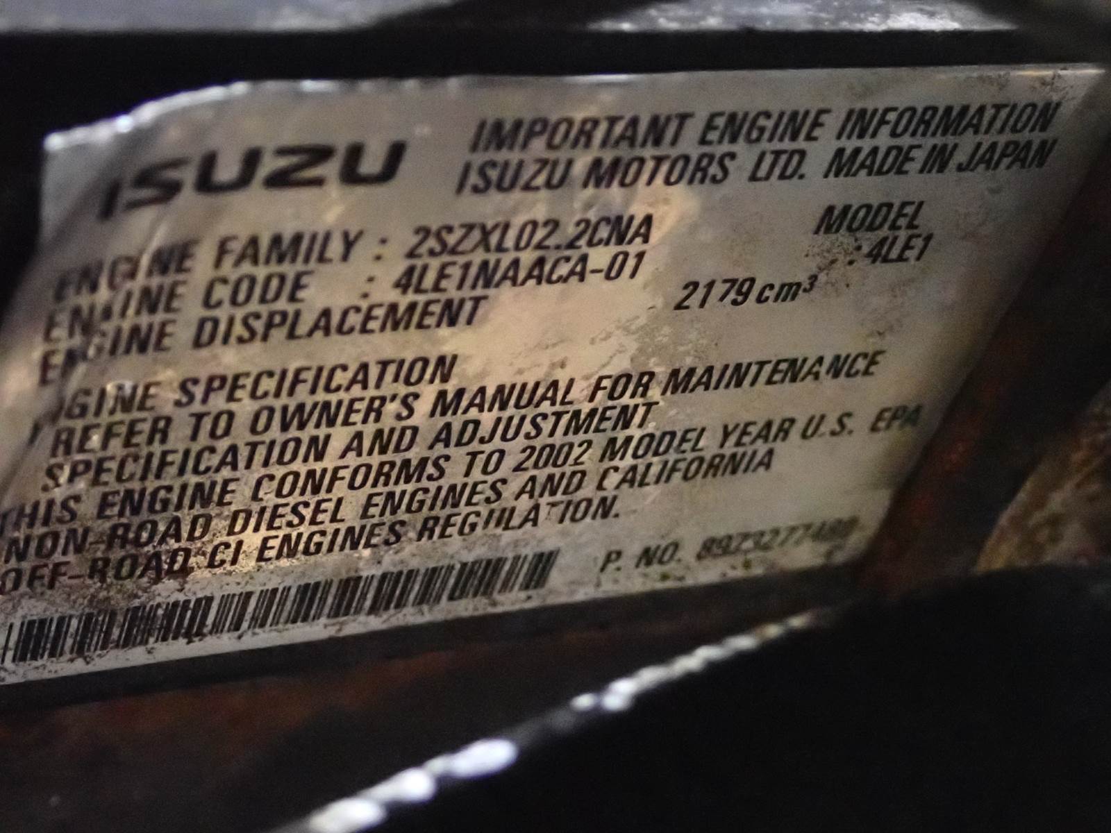 2002 Isuzu 4LE1NAACA-01 diesel engine, mechanical fuel system, naturally aspirated, unit pump injection, complete power unit w/ radiator as pictured, EPA family @ 2SZXL02.2CNA, approximately 35 HP rating. TEST RAN CLEAN, GOOD RUNNER. SEE VIDEO. NO SMOKE OR BLOWBY NOTED. GOOD CLEAN UNIT. GOOD OIL PRESSURE DURING COLD TEST RUN, SHOWING ONLY 176 HOURS ON METER.