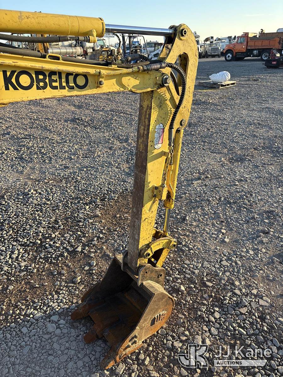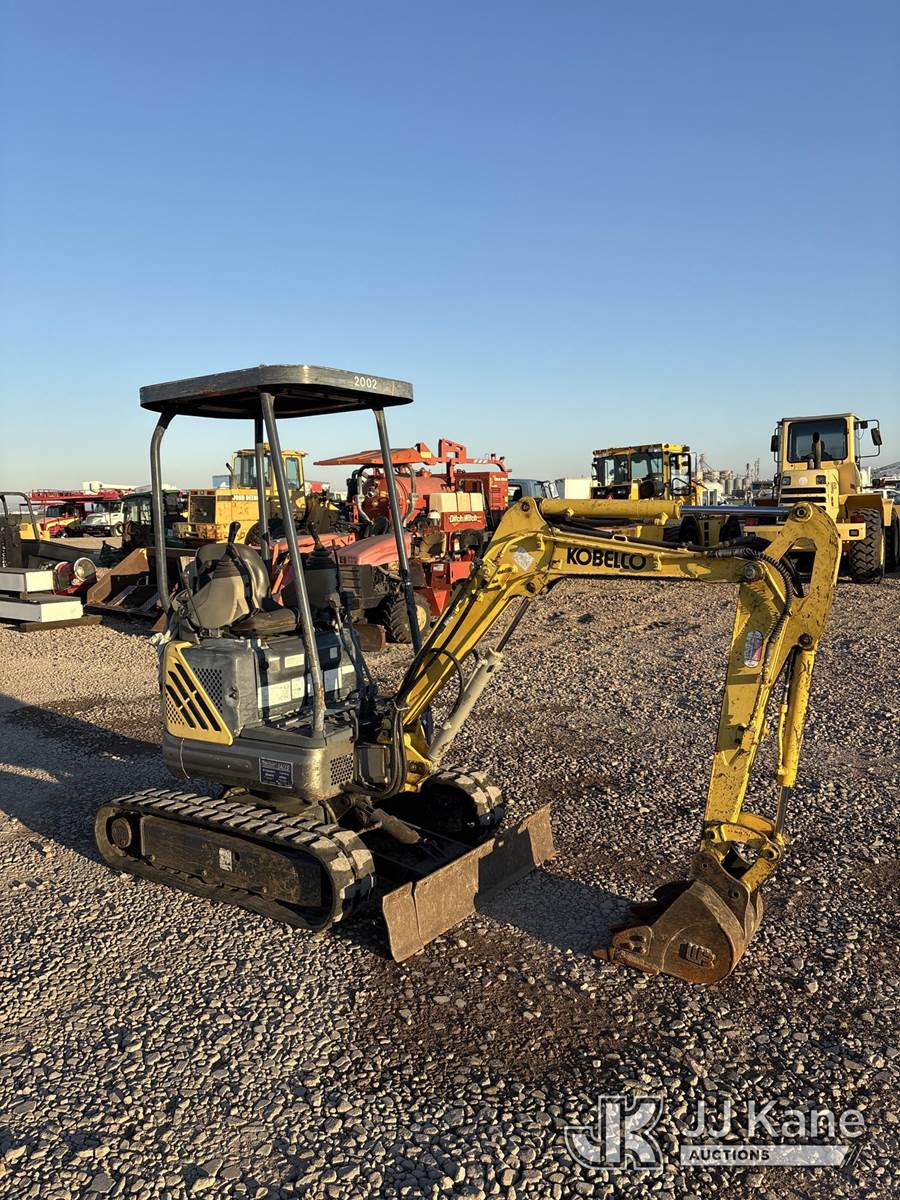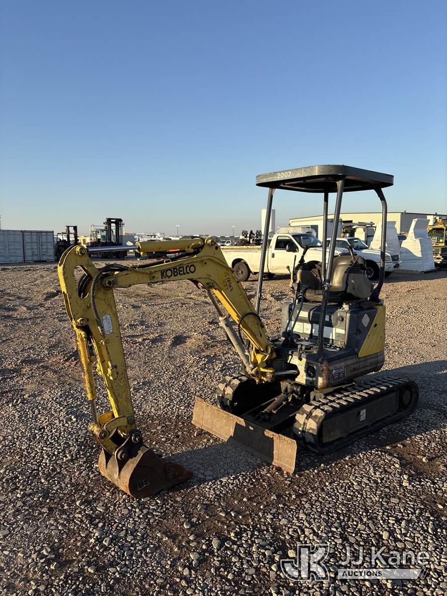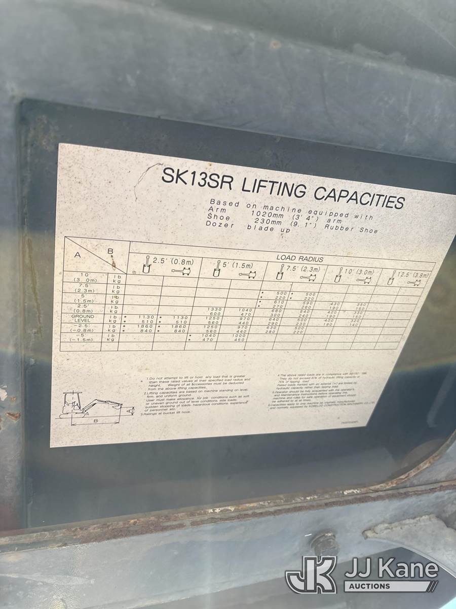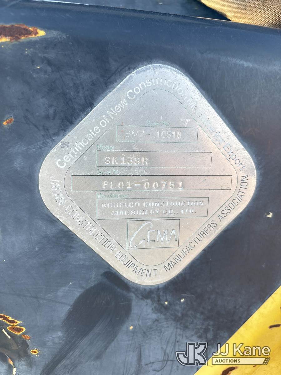 2002 Kobelco SK13SR Mini Hydraulic Excavator, s/n PE0100751, 3-cyl Shuttle, diesel, with rubber tracks, backfill blade & ROPS, (Runs, Moves & Operates) (Reads 1,307 hours) NOTE: This unit is being sold AS IS/WHERE IS via Timed Auction and is located in Dixon, CA. Inspection & preview days for this unit are the 2 business days prior to the first day of items closing for this auction, item is located at 8668 Sparling Ln Dixon, CA 95620 and hours of operations are 8a-4p. For pre-sale questions, please contact JJ Kane Staff at (707) 678-8060 (dixon@jjkane.com). Dealer License Number 45696. (Buyer is responsible for removal. Assistance by consignor or JJ Kane Auctions is not assured.)