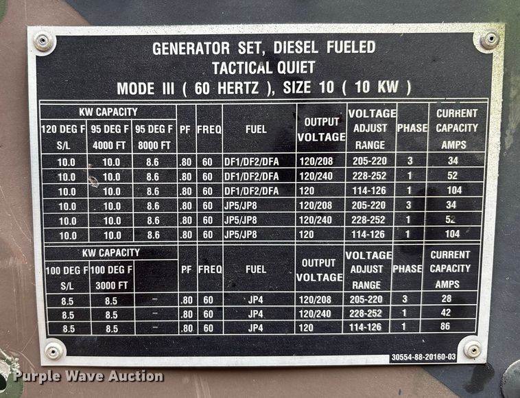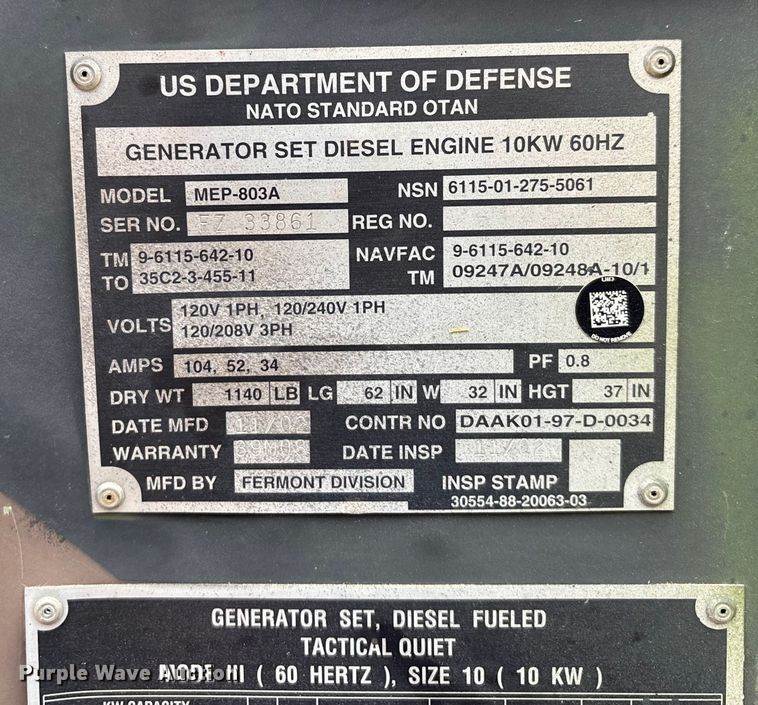 2003 MEP-802A generator, Hours: 887 on meter, Serial: FZ05466, Engine, Cylinders: 4, Fuel type: Diesel, Features, Generator, kW: 5, Phase:...