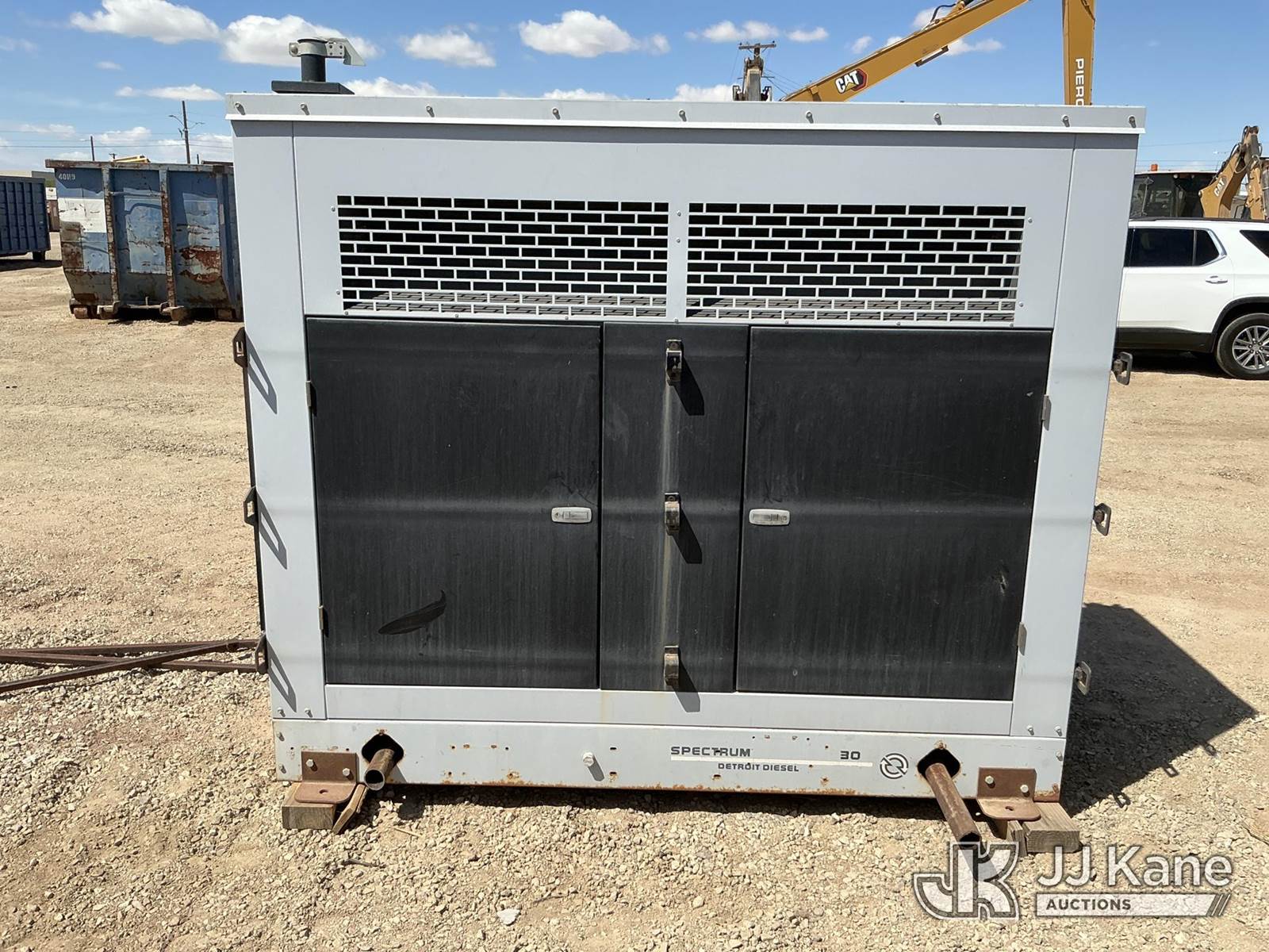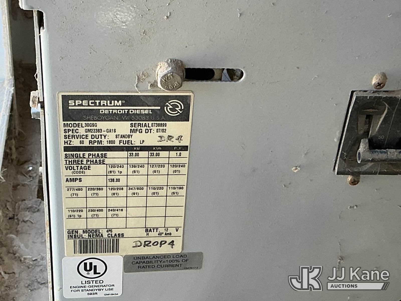 2002 Spectrum 30G8G Generator, s/n 0738899, Detroit diesel, 33KW, 60HZ, SINGLE PHASE, 120/240V (Condition Unknown, seller reported it ran before retired) NOTE: This unit is being sold AS IS/WHERE IS via Timed Auction and is located in Imperial, CA. For more information & removal arrangements please contact John Kaveney @ 949-212-4177. (Buyer is responsible for removal. Assistance by consignor or JJ Kane Auctions is not assured.)