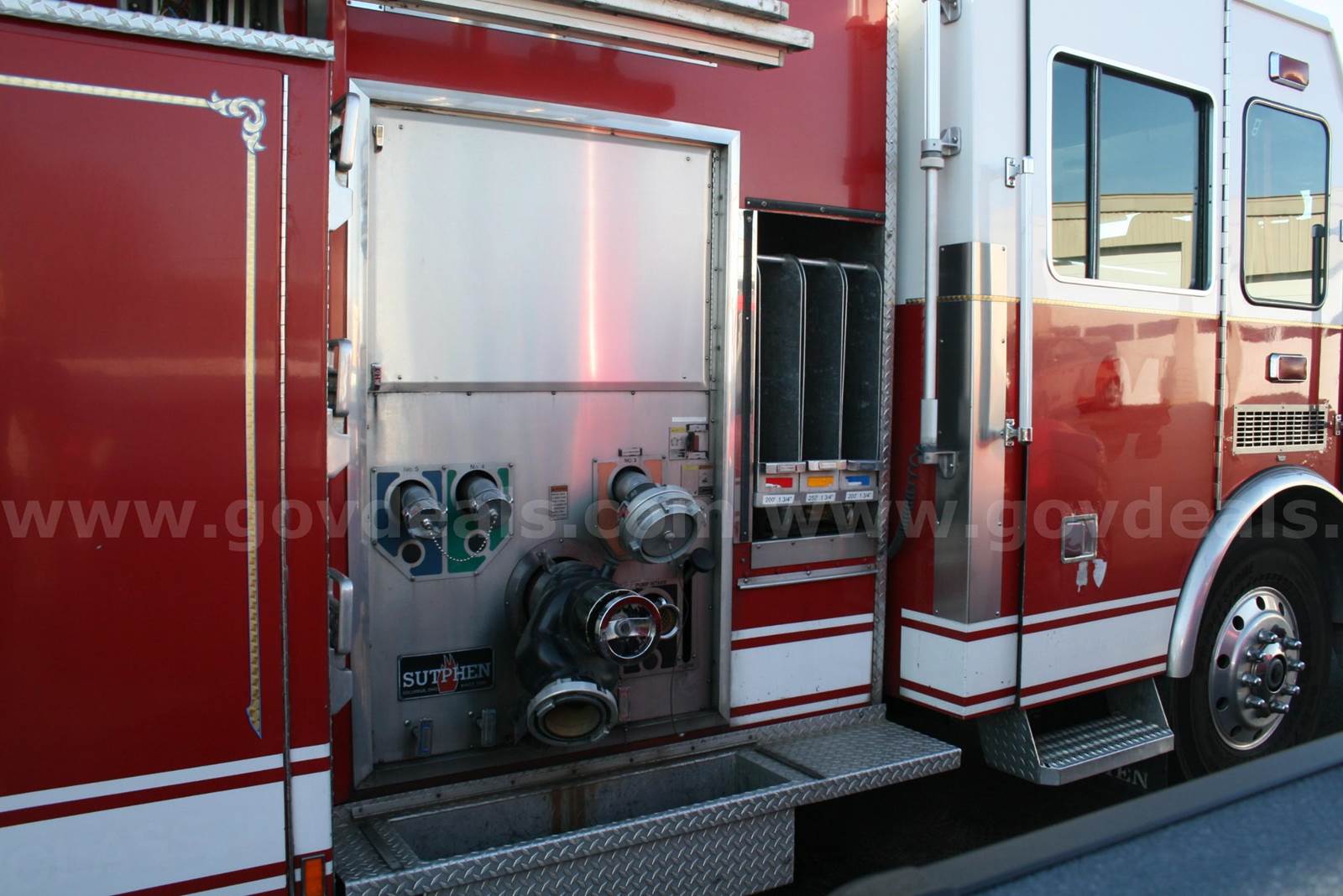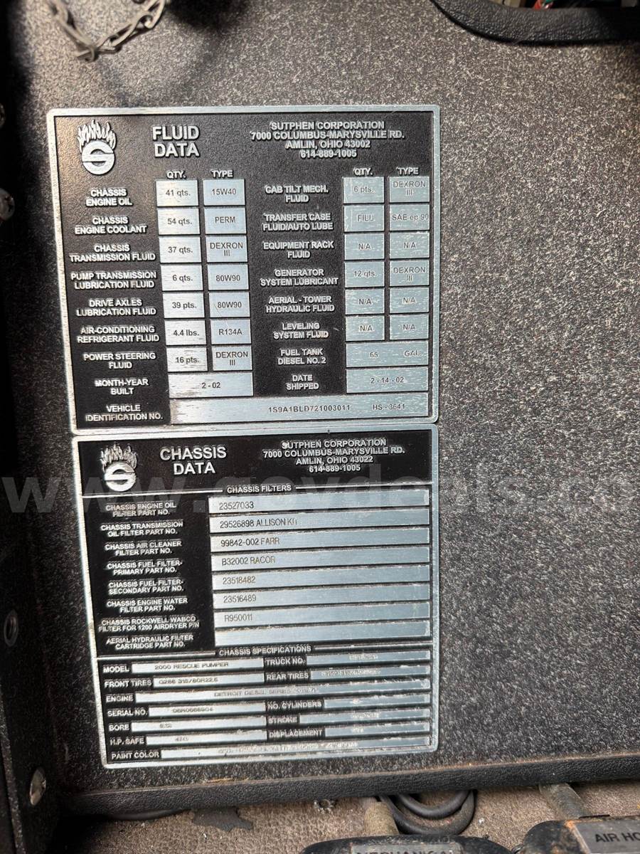 2002 Sutphen Engine. Truck was used as both a front line and reserve apparatus. Vehicle has a Detroit Series 60 motor with automatic Allison transmission 144,690 miles, and 4282 hours on motor. Vehicle is equipped with a Hale 1500 gpm pump, and Williams on - board foam system. Truck had a new fuel tank installed in 2024. Vehicle runs, drives, and pumps like it should. Truck has small cosmetic defects. All service has been maintained at manufacturer recommended service intervals. Sold as is.