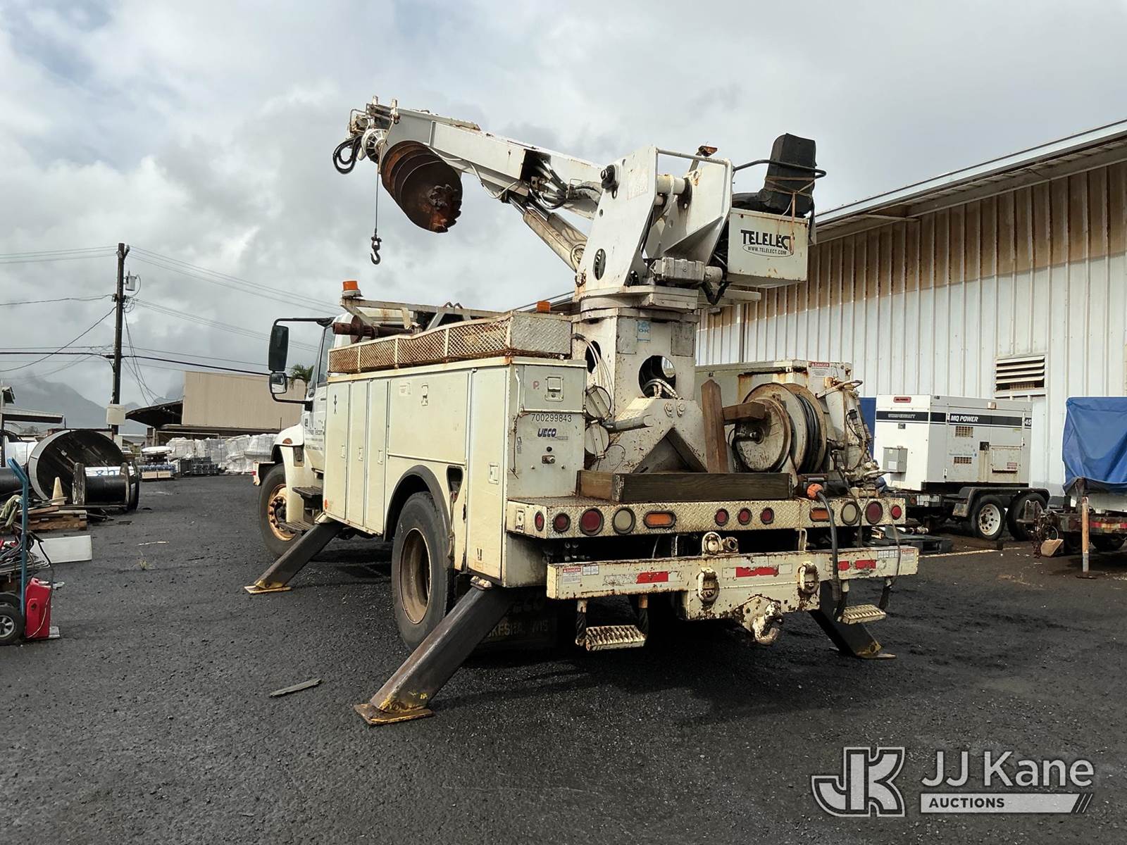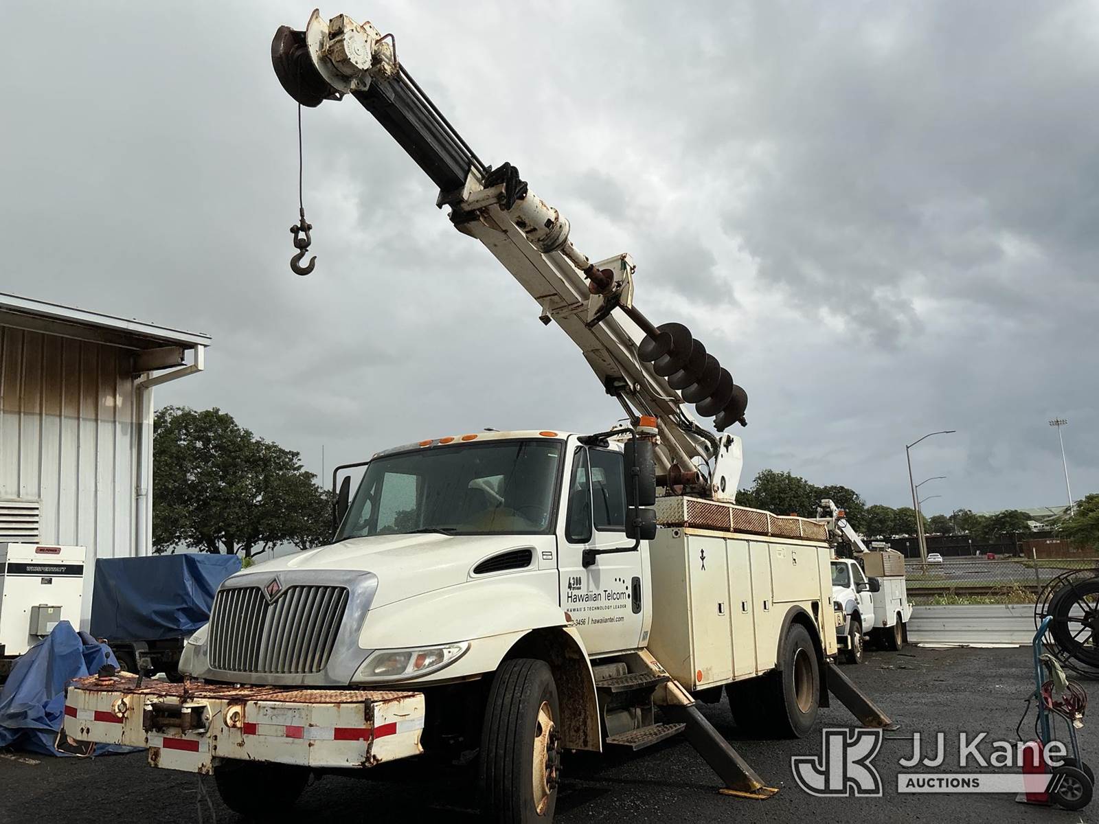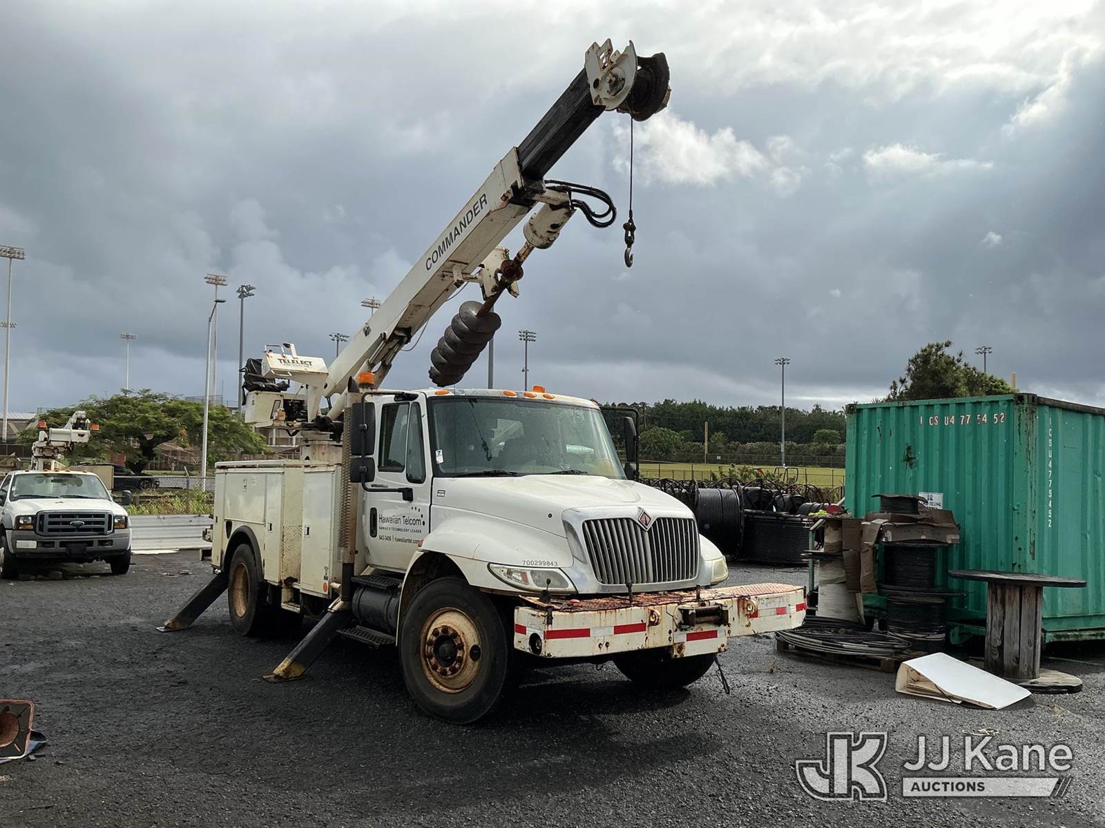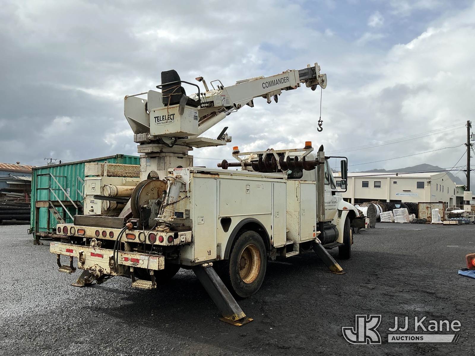 Telelect Commander 4045, 17,580 Lb Digger Derrick s/n 2010917931, with 33 FT sheave-height, two-spd. digger, boom tip winch, 2 stage boom, riding console, rear mounted on 2002 International 4300 Utility Truck, 7.6L L6 DIESEL Auto, 4X2, A/C, with front bumper winch, (Exempt from Odometer Disclosure - Reads 163,868 miles) (Runs, Moves, & Upper Operates) (Warn Engine Light On, ABS Light On, Rust Damage) (Reads 14,528 hours) This is a Titled Item NOTE: This unit is being sold AS IS/WHERE IS via Timed Auction and is located in Hilo, HI. PICKUP MUST BE SCHEDULED, PLEASE CONSIDER WHEN BIDDING. Contact John Kaveney @ (949) 212-4177 for more information. (Missing manuals, See Auction Company for Manufacturers Information to obtain manuals) (Buyer is responsible for removal. Assistance by consignor or JJ Kane Auctioneers is not assured.)