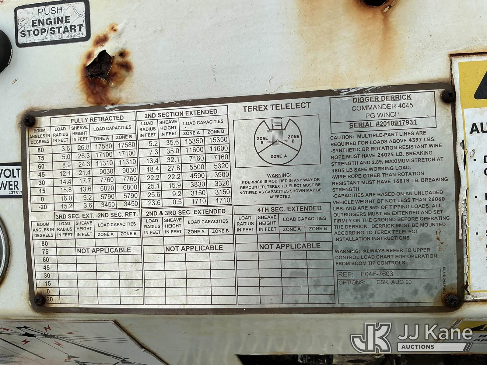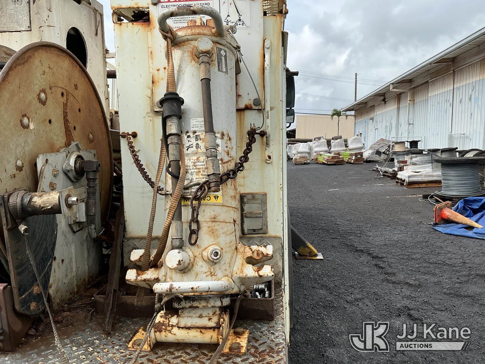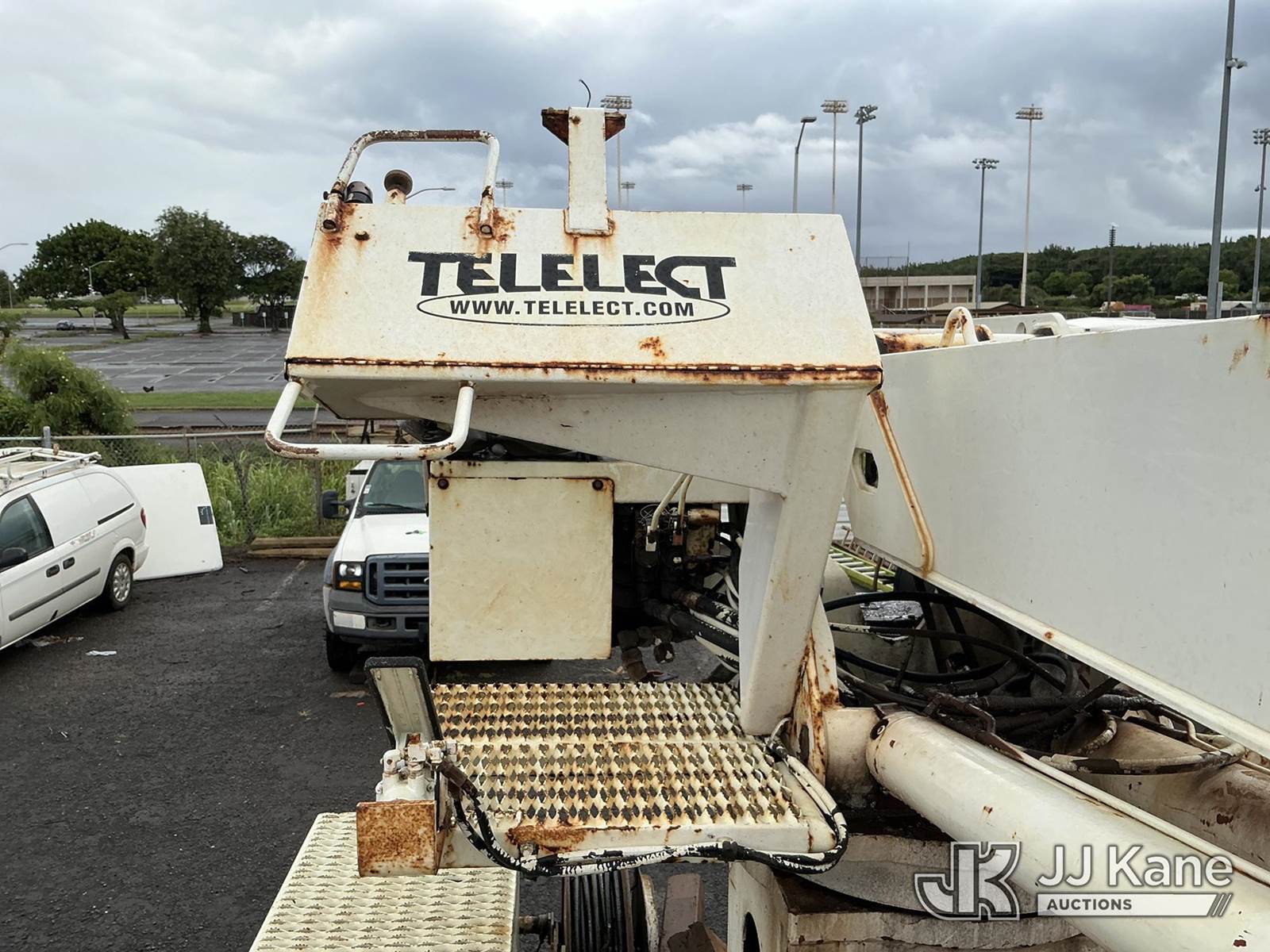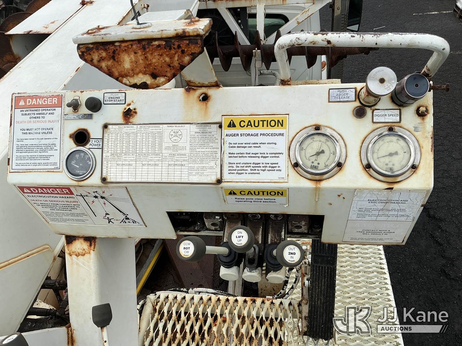 Telelect Commander 4045, 17,580 Lb Digger Derrick s/n 2010917931, with 33 FT sheave-height, two-spd. digger, boom tip winch, 2 stage boom, riding console, rear mounted on 2002 International 4300 Utility Truck, 7.6L L6 DIESEL Auto, 4X2, A/C, with front bumper winch, (Exempt from Odometer Disclosure - Reads 163,868 miles) (Runs, Moves, & Upper Operates) (Warn Engine Light On, ABS Light On, Rust Damage) (Reads 14,528 hours) This is a Titled Item NOTE: This unit is being sold AS IS/WHERE IS via Timed Auction and is located in Hilo, HI. PICKUP MUST BE SCHEDULED, PLEASE CONSIDER WHEN BIDDING. Contact John Kaveney @ (949) 212-4177 for more information. (Missing manuals, See Auction Company for Manufacturers Information to obtain manuals) (Buyer is responsible for removal. Assistance by consignor or JJ Kane Auctioneers is not assured.)
