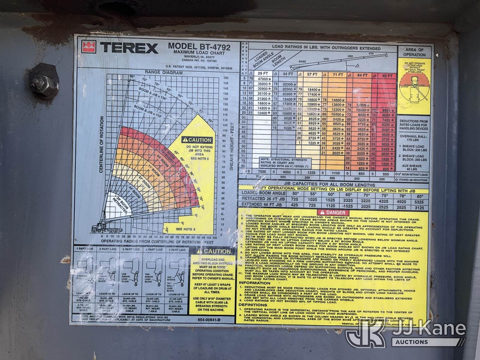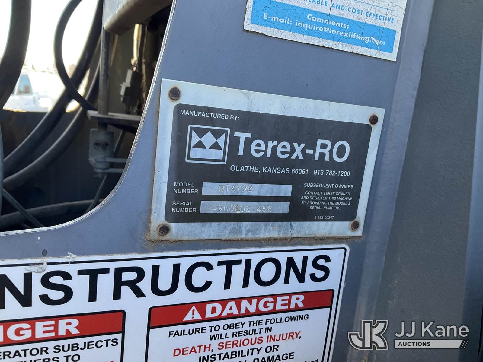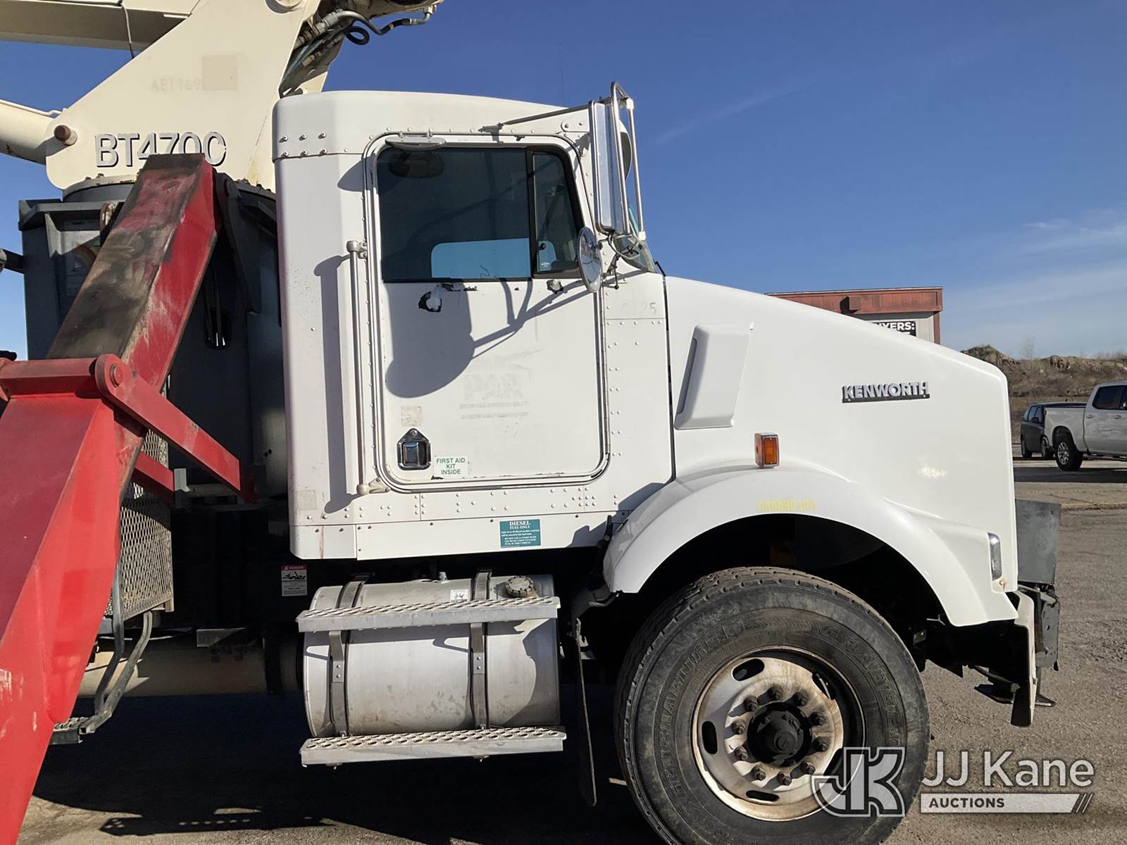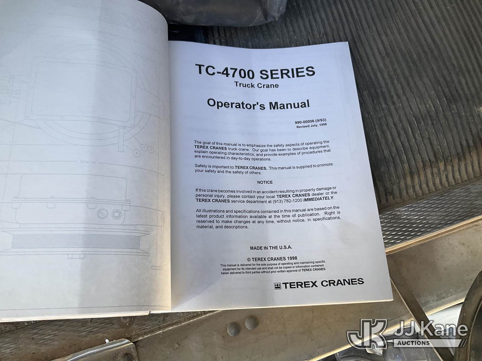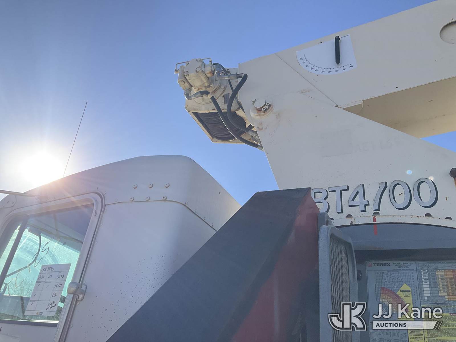 Terex BT4792, 23-Ton Hydraulic Truck Crane s/n 49001021458, with 102 ft sheave height 4 section hyd boom, heel winch, dual stand up controls, 5 hyd outriggers, mounted behind cab on 2002 Kenworth T800 T/A Flatbed Truck, Cummins diesel, manual, A/C, (Exempt from Odometer Disclosure - Reads 49,171 miles) (Runs, Moves, & Operates) (Starts W/ Jump, Rear Outriggers Leak, Front Outrigger Doesn't Operate & Missing Pin, Per Seller: Bad Cambers & Upper Rear Torq Arms.) This is a Titled Item NOTE: This unit is being sold AS IS/WHERE IS via Timed Auction and is located in Kansas City, MO. Inspection & preview days for this unit are the 2 business days prior to the first day of items closing for this auction, item is located at 962 Tel Aviv Ave Kansas City, MO 64153 and hours of operations are 8a-4p. For pre-sale questions, please contact Ricky McPherson @ (816) 610-2250. (Missing manuals, See Auction Company for Manufacturers Information to obtain manuals) (Buyer is responsible for removal. Assistance by consignor or JJ Kane Auctions is not assured.)