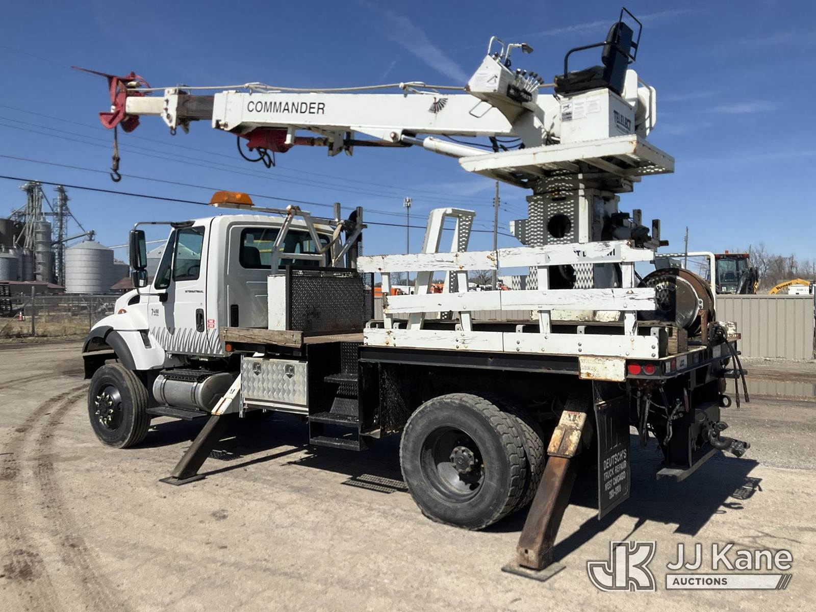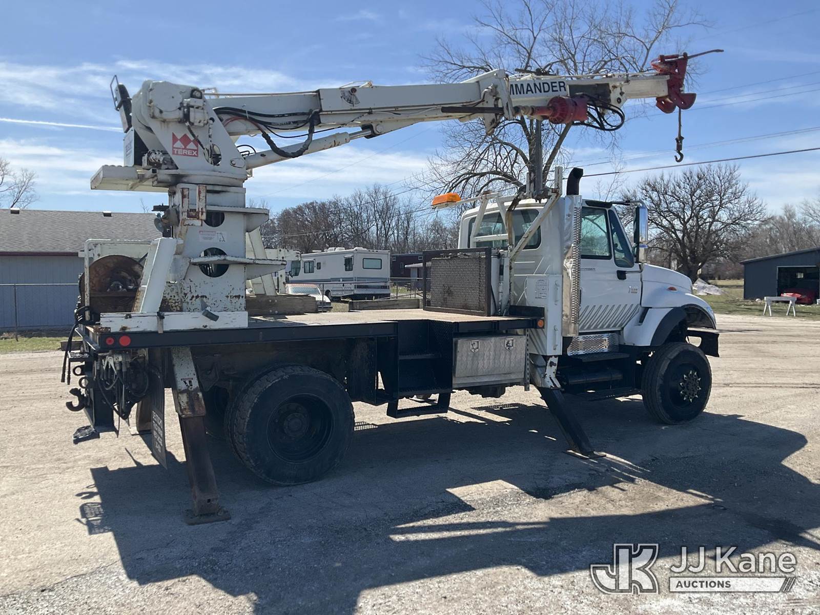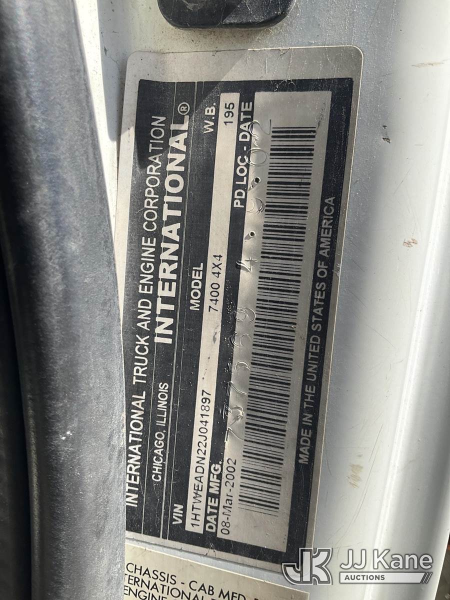 Terex/Telelect Commander 4045, 25,930 Lb Digger Derrick s/n 2011218510, with 47ft. sheave height, 2-spd digger, pole guides, heel winch, 4 hydraulic outriggers & riding console, rear mounted on 2002 International 7400 Flatbed/Utility Truck, 8.7L L6 DIESEL 4X4, Auto, (Exempt from Odometer Disclosure - Reads 84,425 miles) (Runs, Moves & Upper Operates) (Reads 8,542 hours) This is a Titled Item NOTE: This unit is being sold AS IS/WHERE IS via Timed Auction and is located in South Beloit, IL. Inspection & preview days for this unit are the 2 business days prior to the first day of items closing for this auction, item is located at 14354 Dearborn Ave South Beloit, IL and hours of operations are 8a-4p. For pre-sale questions, please contact Derek Eklund at (608) 904-0618 or (derek.eklund@jjkane.com). (Manuals provided in cab) (Buyer is responsible for removal. Assistance by consignor or JJ Kane Auctions is not assured.)