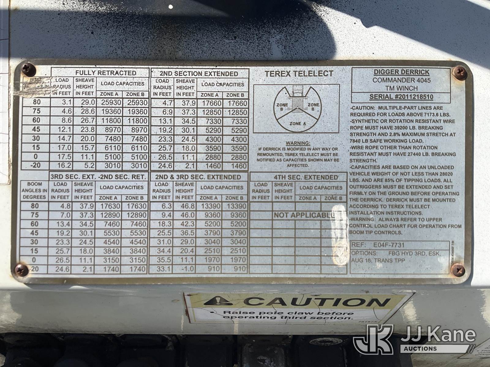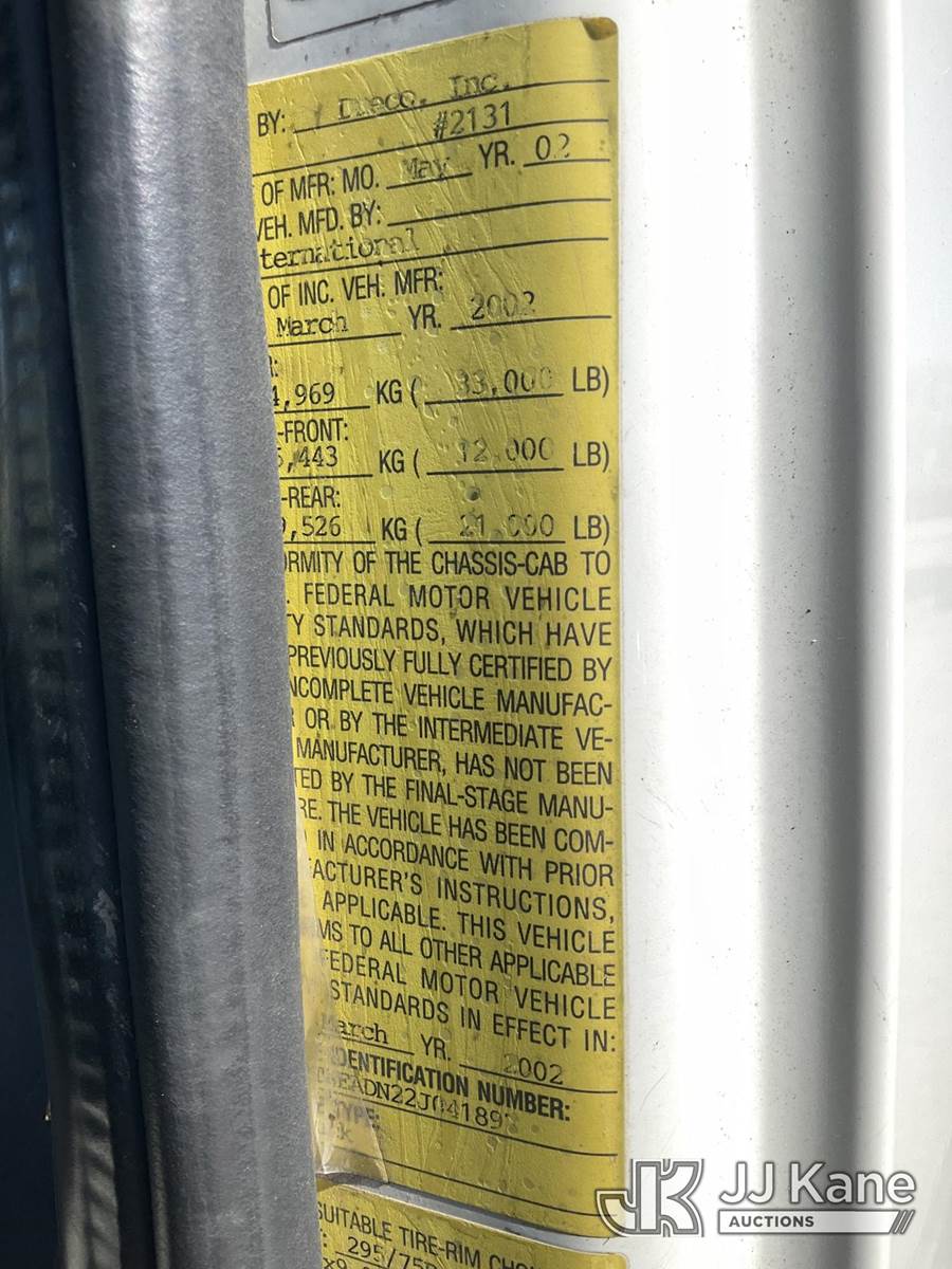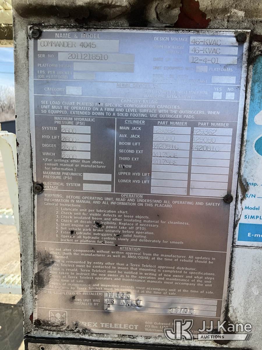 Terex/Telelect Commander 4045, 25,930 Lb Digger Derrick s/n 2011218510, with 47ft. sheave height, 2-spd digger, pole guides, heel winch, 4 hydraulic outriggers & riding console, rear mounted on 2002 International 7400 Flatbed/Utility Truck, 8.7L L6 DIESEL 4X4, Auto, (Exempt from Odometer Disclosure - Reads 84,425 miles) (Runs, Moves & Upper Operates) (Reads 8,542 hours) This is a Titled Item NOTE: This unit is being sold AS IS/WHERE IS via Timed Auction and is located in South Beloit, IL. Inspection & preview days for this unit are the 2 business days prior to the first day of items closing for this auction, item is located at 14354 Dearborn Ave South Beloit, IL and hours of operations are 8a-4p. For pre-sale questions, please contact Derek Eklund at (608) 904-0618 or (derek.eklund@jjkane.com). (Manuals provided in cab) (Buyer is responsible for removal. Assistance by consignor or JJ Kane Auctions is not assured.)