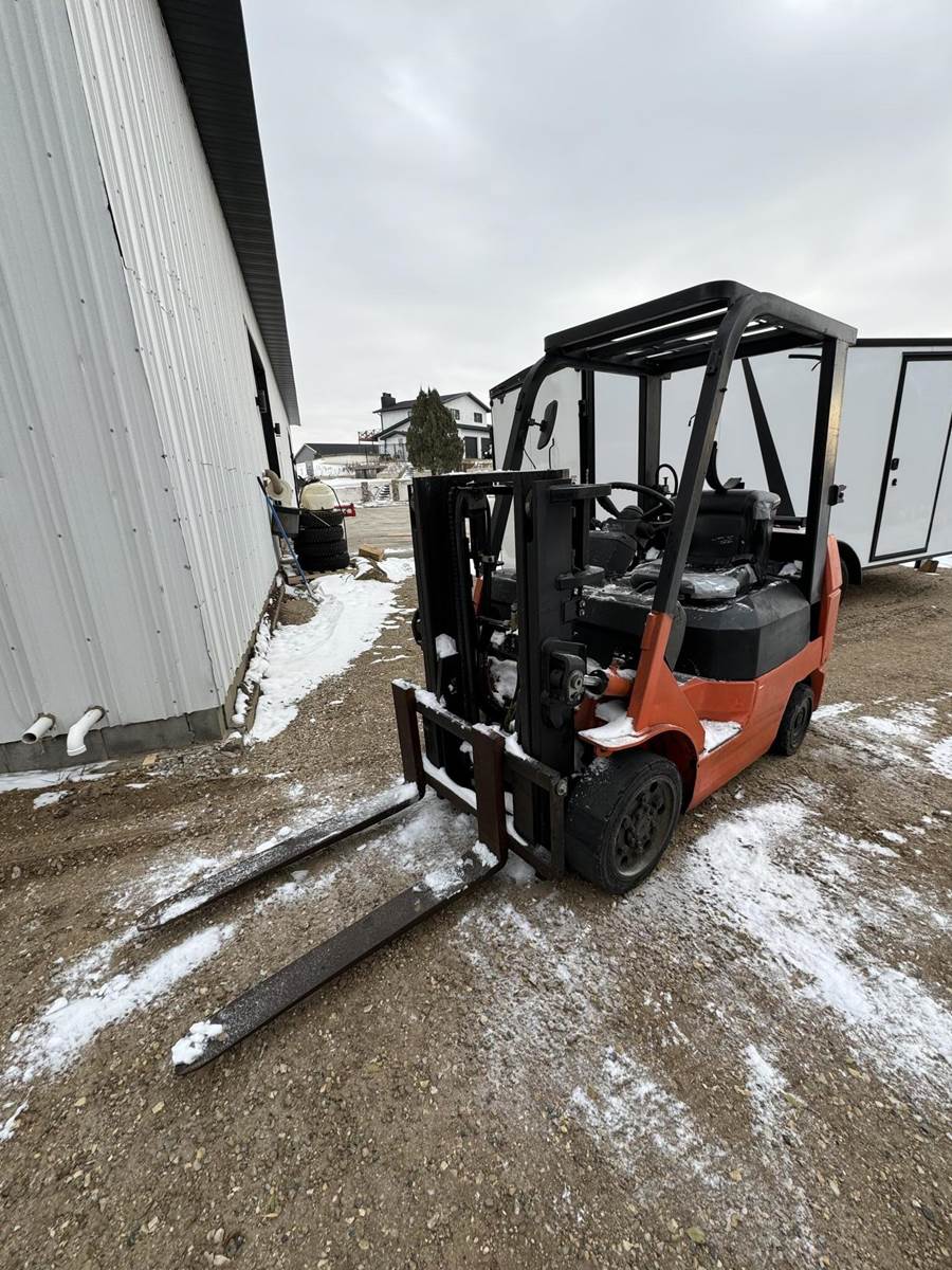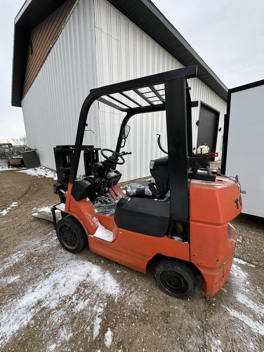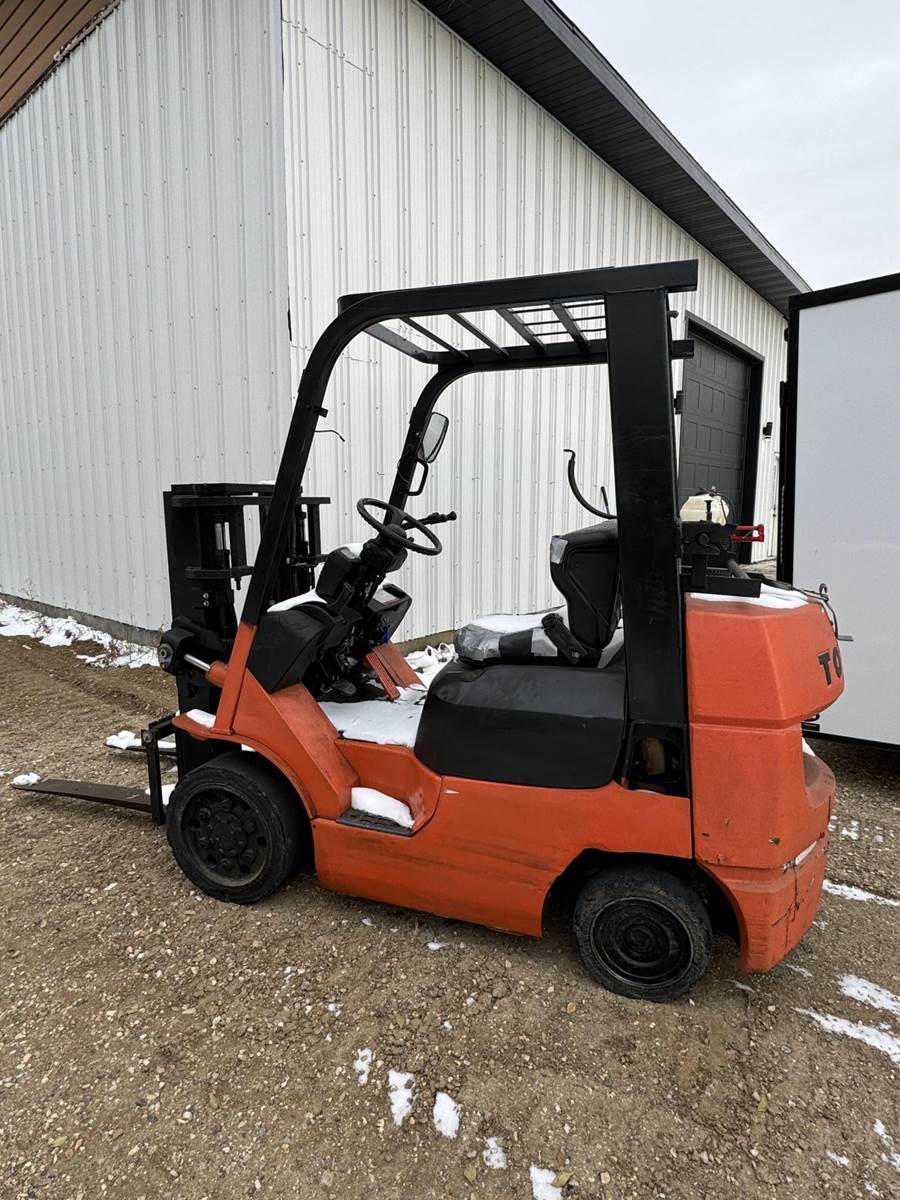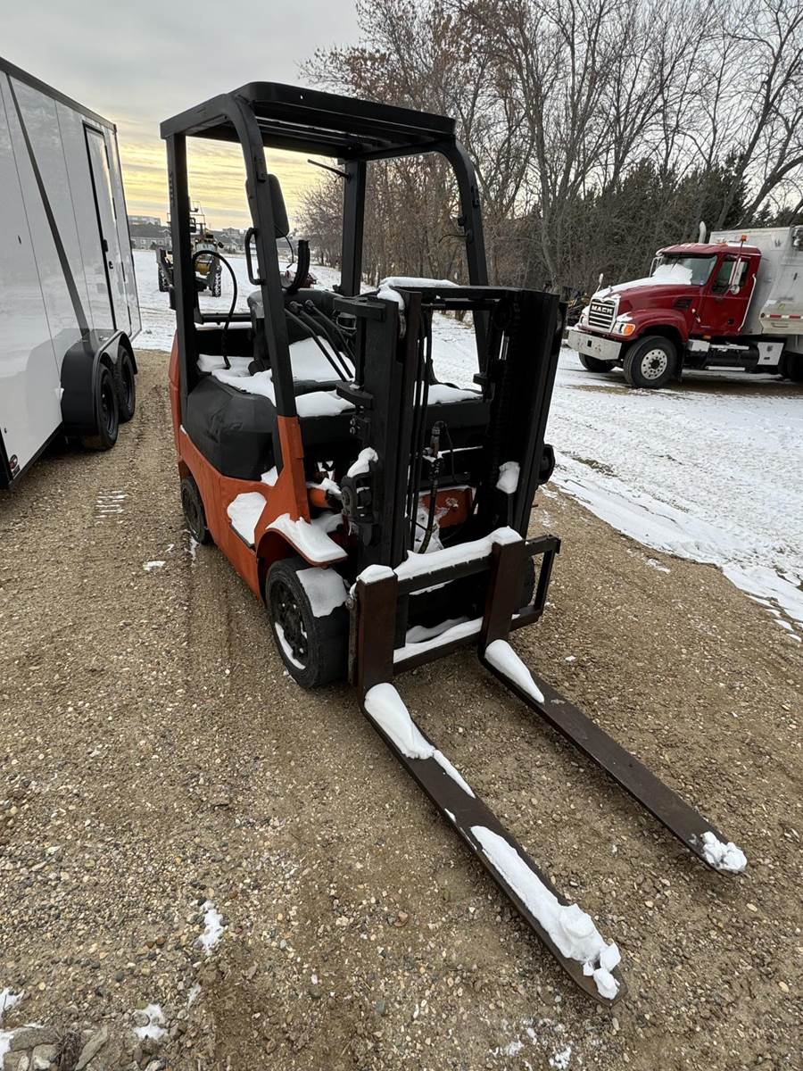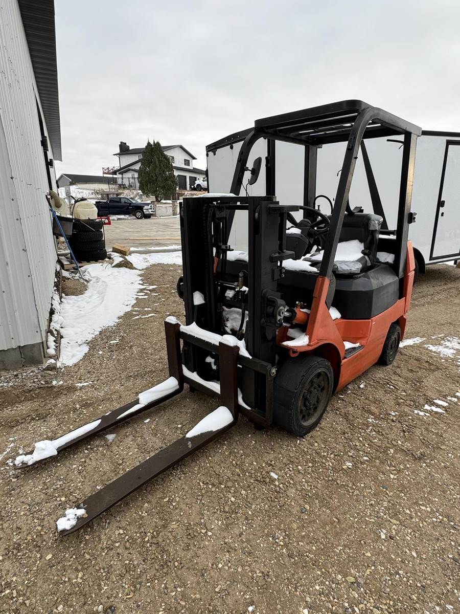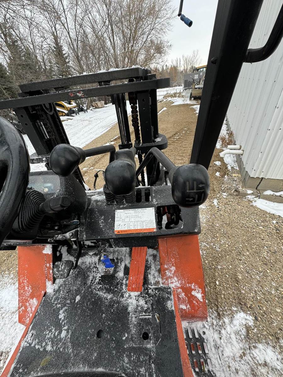 2002 Toyota 7FGCU25 LP Forklift, Propane powered, Forward Tilt, Side Shift, weight: 8,060lbs, lift max 4,500lbs, solid tires, propane tank included (just not pictured). Runs and operates well.