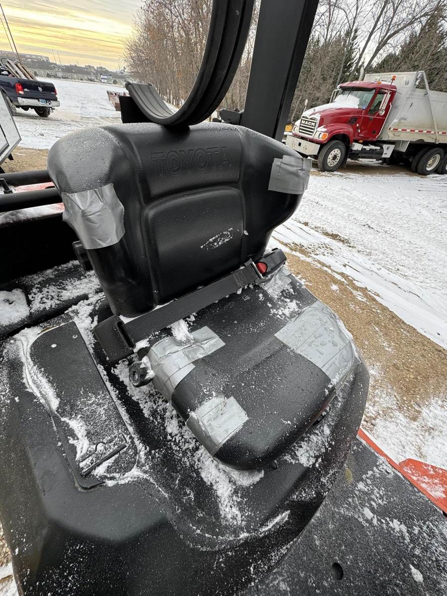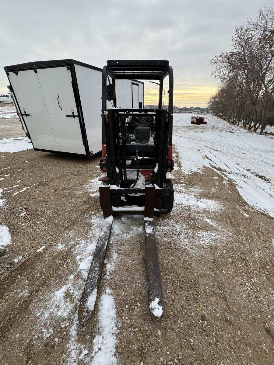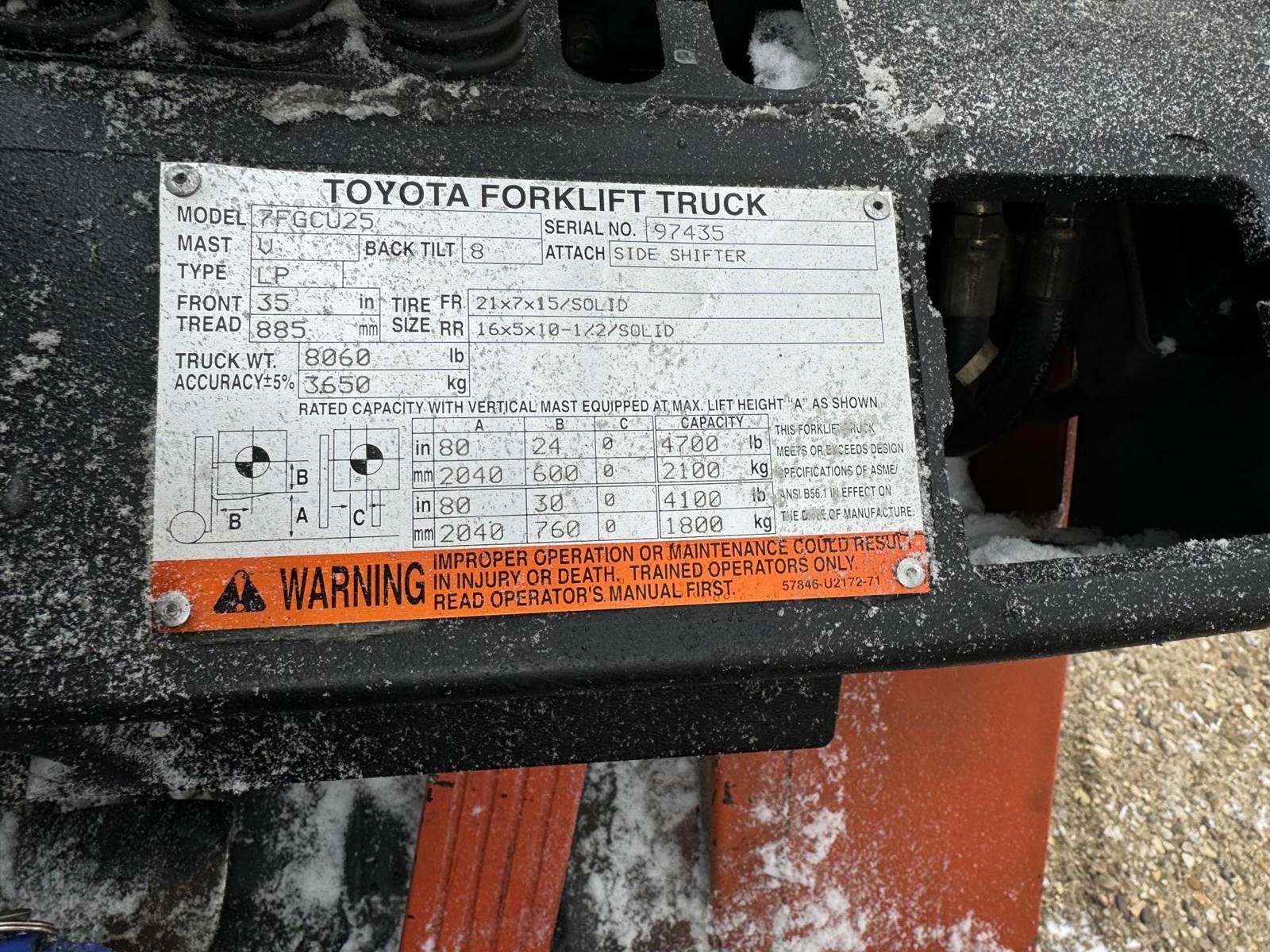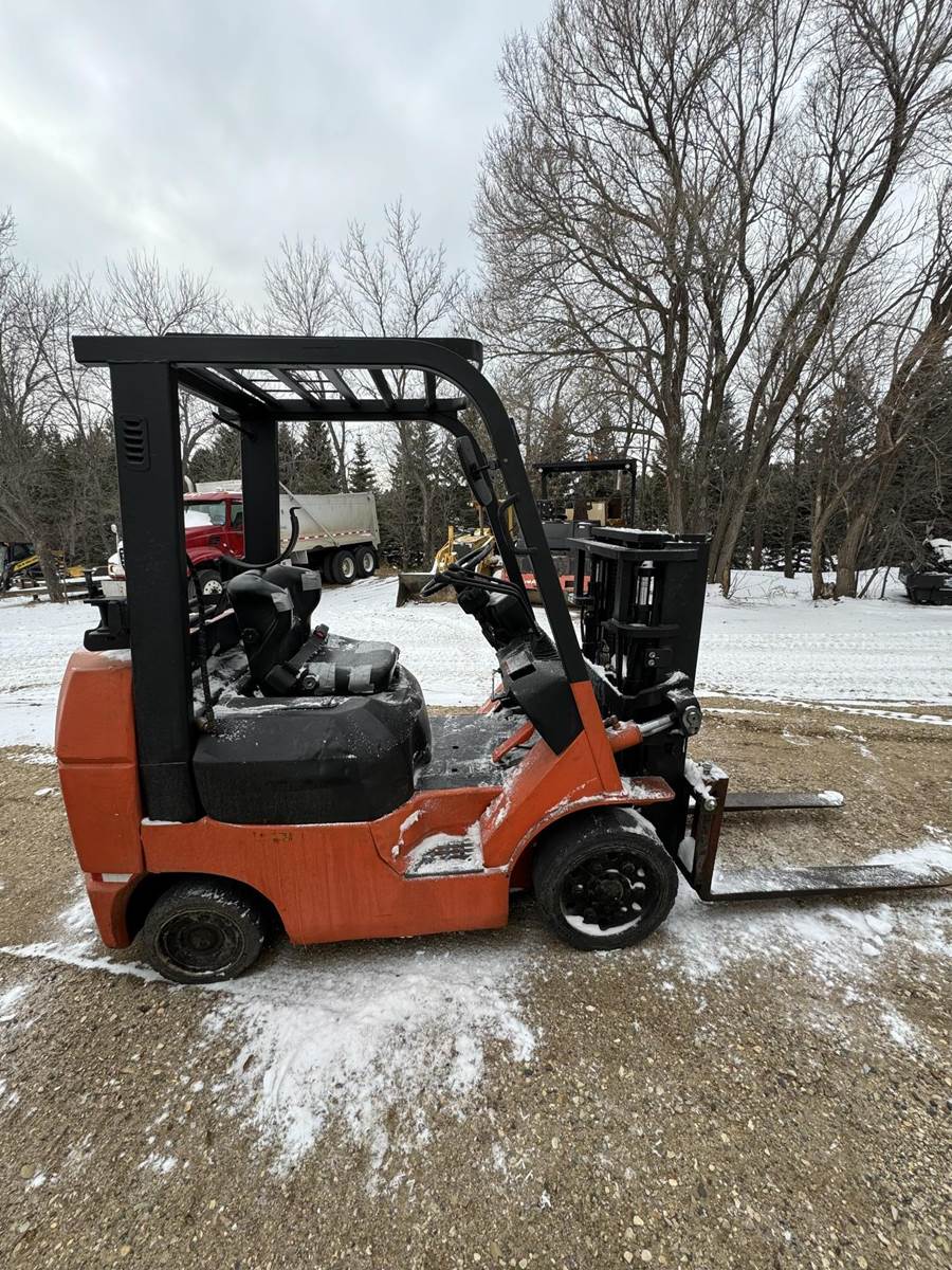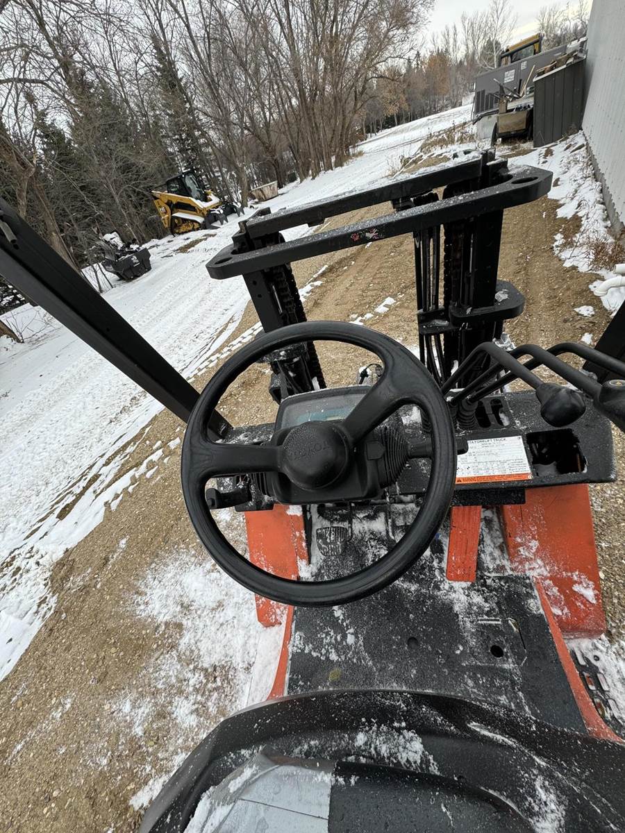 2002 Toyota 7FGCU25 LP Forklift, Propane powered, Forward Tilt, Side Shift, weight: 8,060lbs, lift max 4,500lbs, solid tires, propane tank included (just not pictured). Runs and operates well.