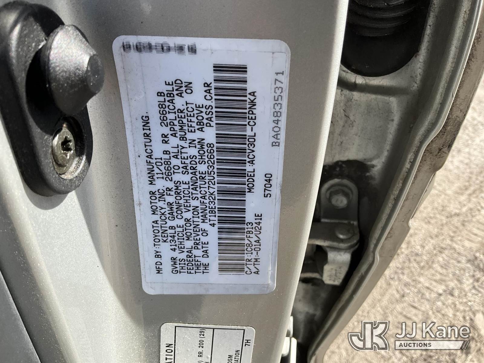 2002 Toyota Camry 4-Door Sedan, 2.4L L4 DOHC 16V Auto, FWD, GAS, A/C, (Exempt from Odometer Disclosure - Reads 240,947 miles) (Runs & Moves) (Engine Noise, Jump To Start)(FL Residents Purchasing Titled Items - tax, title & registration fees will be collected at the maximum rate of $400.00 under 25,999 and $800.00 for Over 26,000 and $250.00 trailers - Proof of insurance is mandatory; Out of State Residents Purchasing Title Items - tax will be collected based upon your state rate.) This is a Titled Item NOTE: This unit is being sold AS IS/WHERE IS via Timed Auction and is located in Thonotosassa, FL. Inspection & preview days for this unit are the 2 business days prior to the first day of items closing for this auction, item is located at 11720 N US 301 Thonotosassa, Fl 33592 and hours of operations are 8a-4p. For pre-sale questions, please contact Office Staff @ (813) 986-2485. (Buyer is responsible for removal. Assistance by consignor or JJ Kane Auctions is not assured.)