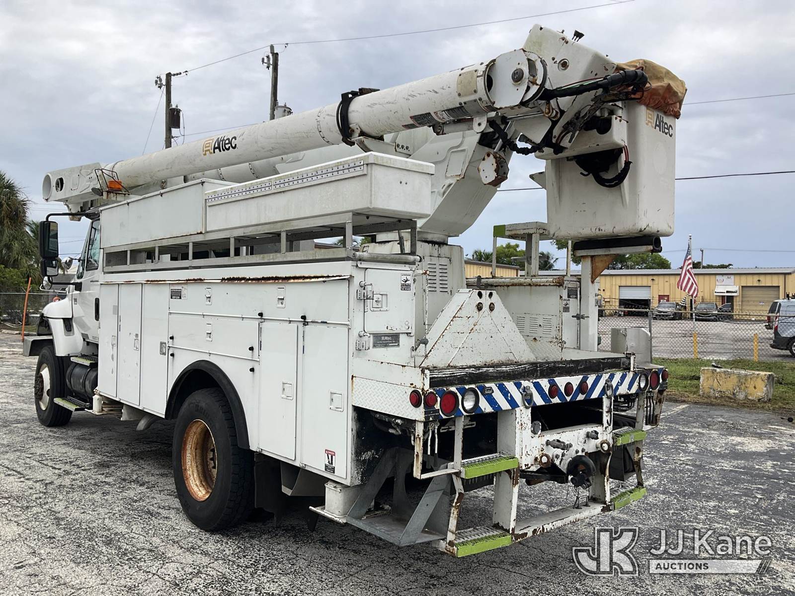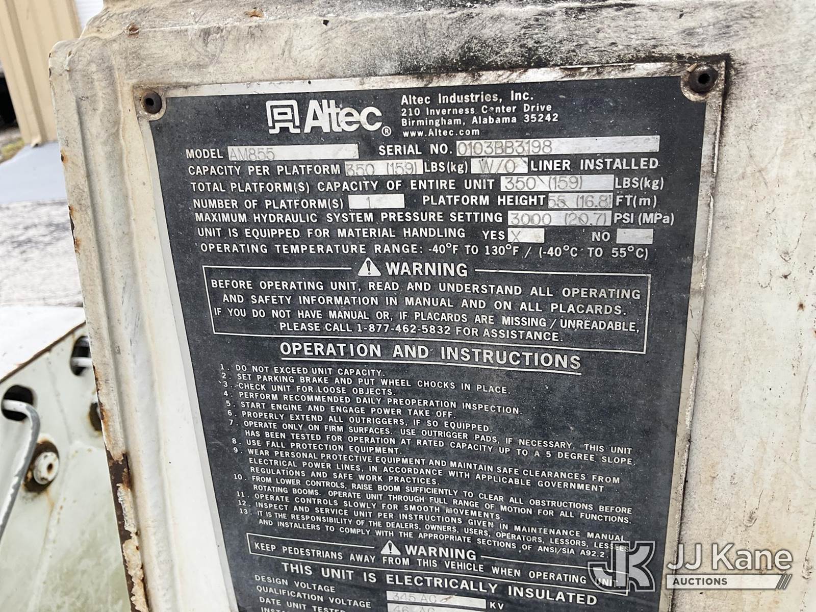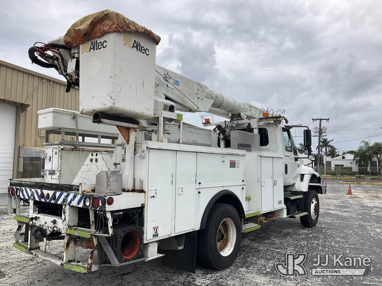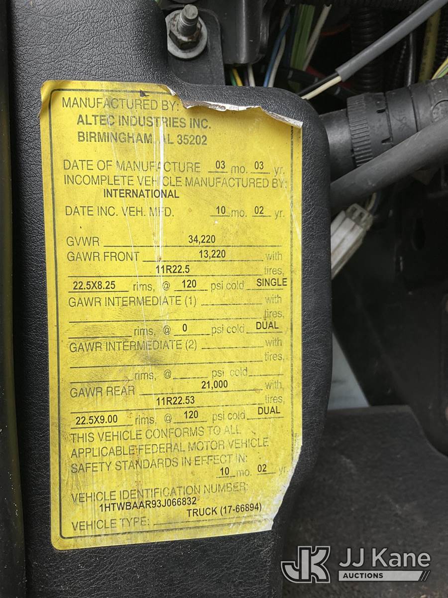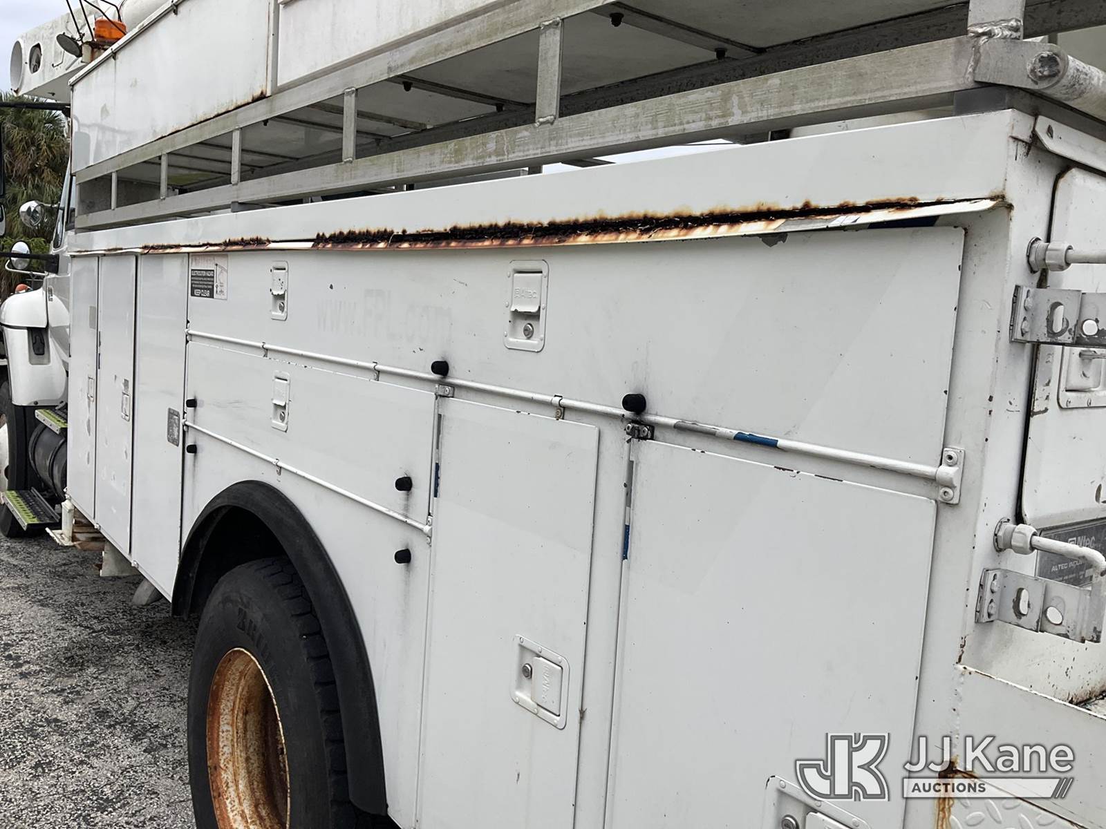 Altec AM855, 60 ft, Over-Center Material Handling Bucket Truck s/n 0103BB3198, with single-man bucket & 4 hyd outriggers, rear mounted on 2003 International 7300 4x4 Utility Truck, DT466 diesel, Auto, A/C, (Exempt from Odometer Disclosure - Reads 190,643 miles) (Runs & Moves, Hard To Start)( PTO Does Not Engage, Upper Operating Condition Unknown)( ABS Light On, Body Damage & Rust, Missing Jib & Cylinder Bracket Hanging Down, Missing Upper Boom Covers) (FL Residents Purchasing Titled Items - tax, title & registration fees will be collected at the maximum rate of $400.00 under 25,999 and $800.00 for Over 26,000 and $250.00 trailers - Proof of insurance is mandatory; Out of State Residents Purchasing Title Items - tax will be collected based upon your state rate.) This is a Titled Item NOTE: This unit is being sold AS IS/WHERE IS via Timed Auction and is located in West Palm Beach, FL. For Pick Up & Removal information, please contact: Andy Garcia @ 561-215-0085. Removals require 24-hr Notice by Appointment Only, Buyer/Hauler must present copy of Paid-in-Full JJ Kane Release Form upon arrival. Purchaser acknowledges ALL lots must be removed within 10 business days of Auction, or a towing & storage fee may be incurred. (Missing manuals, See Auction Company for Manufacturers Information to obtain manuals) (Buyer is responsible for removal. Assistance by consignor or JJ Kane Auctions is not assured.)