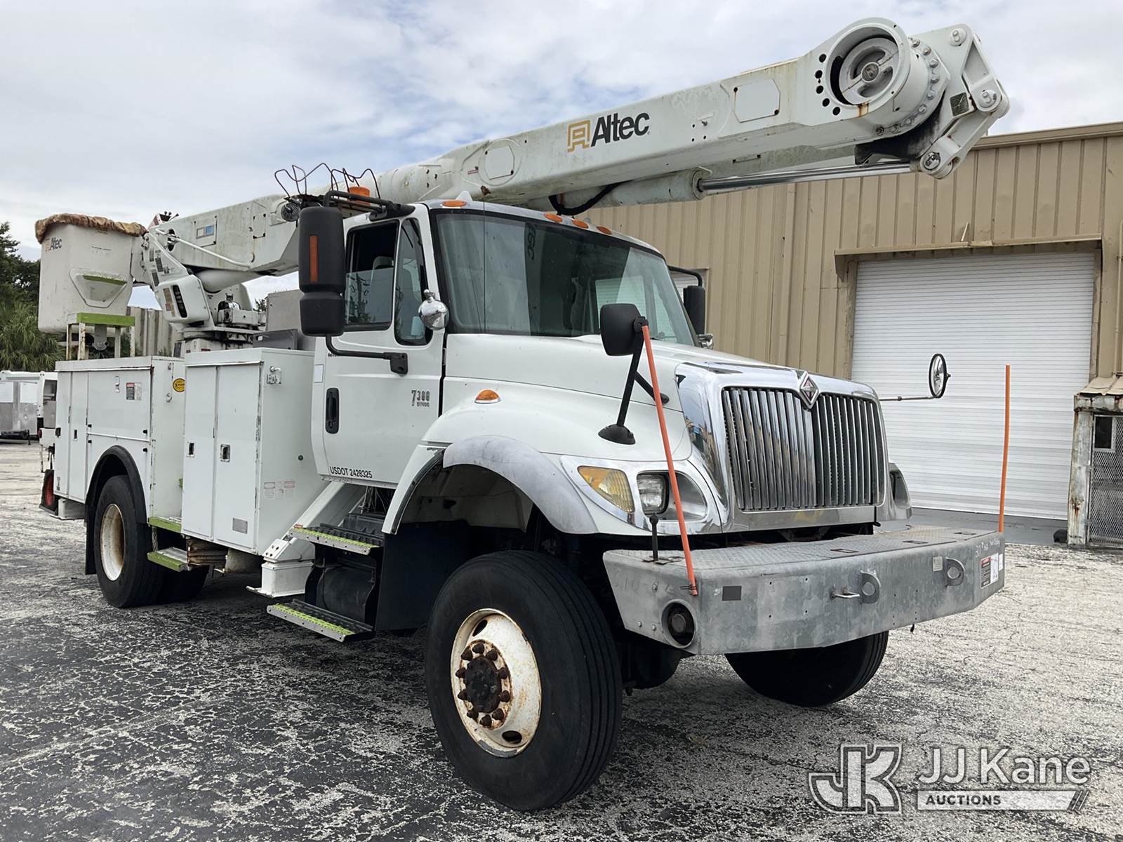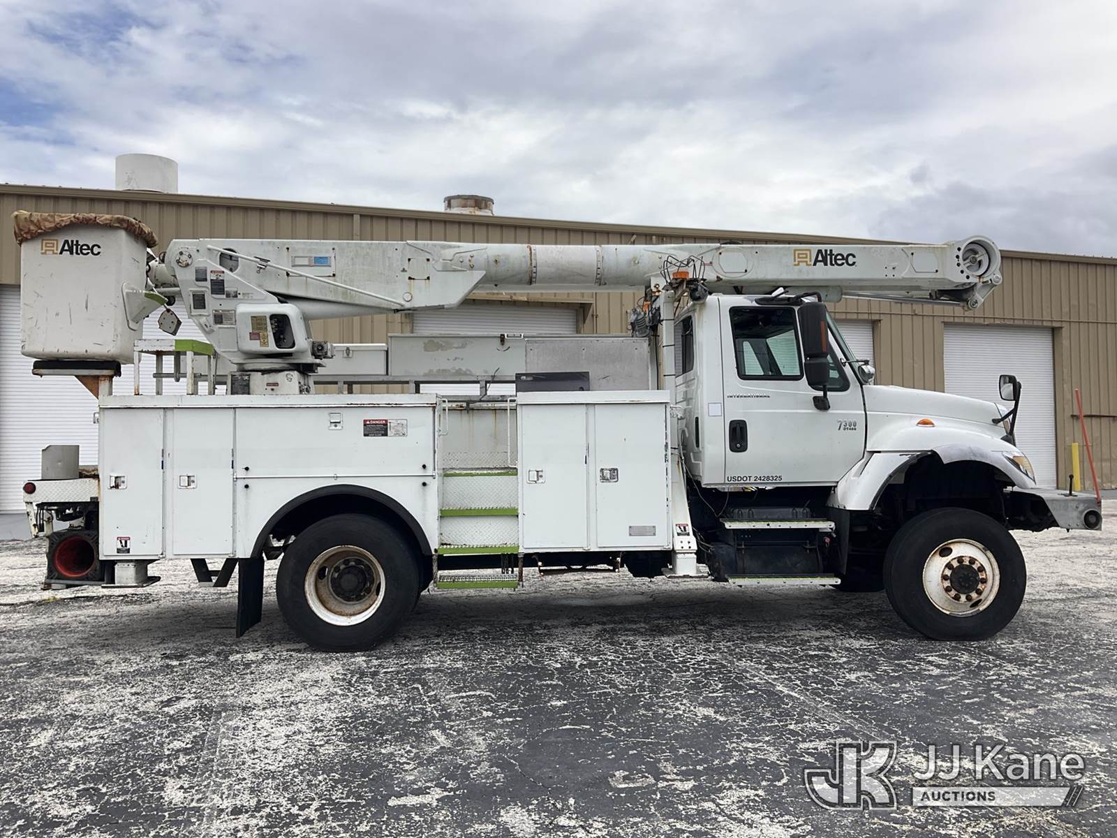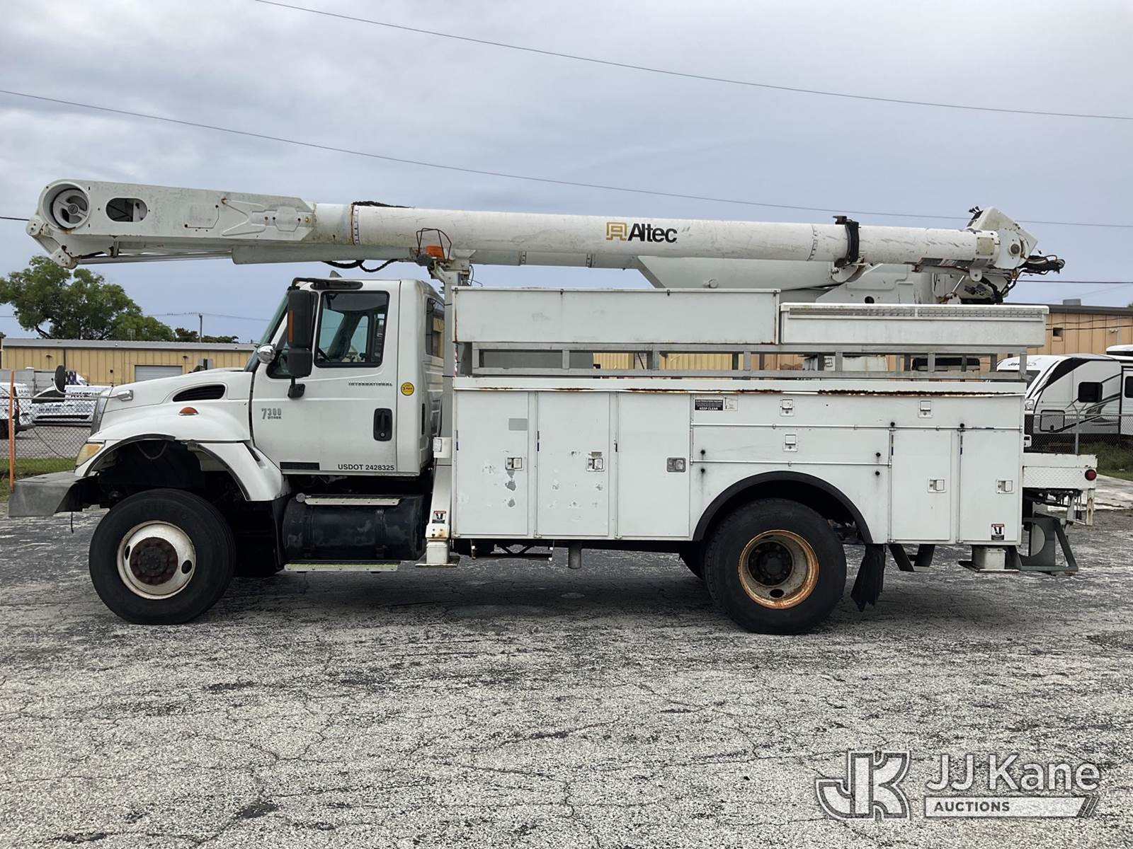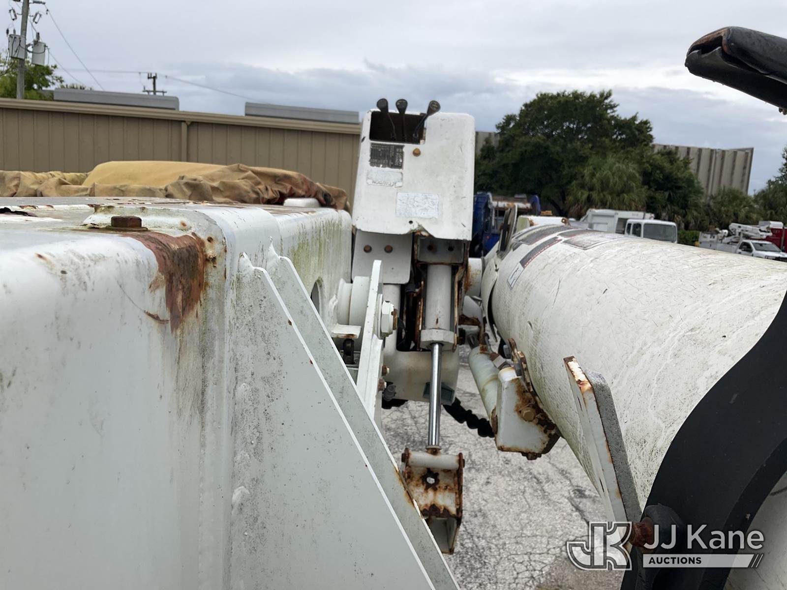 Altec AM855, 60 ft, Over-Center Material Handling Bucket Truck s/n 0103BB3198, with single-man bucket & 4 hyd outriggers, rear mounted on 2003 International 7300 4x4 Utility Truck, DT466 diesel, Auto, A/C, (Exempt from Odometer Disclosure - Reads 190,643 miles) (Runs & Moves, Hard To Start)( PTO Does Not Engage, Upper Operating Condition Unknown)( ABS Light On, Body Damage & Rust, Missing Jib & Cylinder Bracket Hanging Down, Missing Upper Boom Covers) (FL Residents Purchasing Titled Items - tax, title & registration fees will be collected at the maximum rate of $400.00 under 25,999 and $800.00 for Over 26,000 and $250.00 trailers - Proof of insurance is mandatory; Out of State Residents Purchasing Title Items - tax will be collected based upon your state rate.) This is a Titled Item NOTE: This unit is being sold AS IS/WHERE IS via Timed Auction and is located in West Palm Beach, FL. For Pick Up & Removal information, please contact: Andy Garcia @ 561-215-0085. Removals require 24-hr Notice by Appointment Only, Buyer/Hauler must present copy of Paid-in-Full JJ Kane Release Form upon arrival. Purchaser acknowledges ALL lots must be removed within 10 business days of Auction, or a towing & storage fee may be incurred. (Missing manuals, See Auction Company for Manufacturers Information to obtain manuals) (Buyer is responsible for removal. Assistance by consignor or JJ Kane Auctions is not assured.)