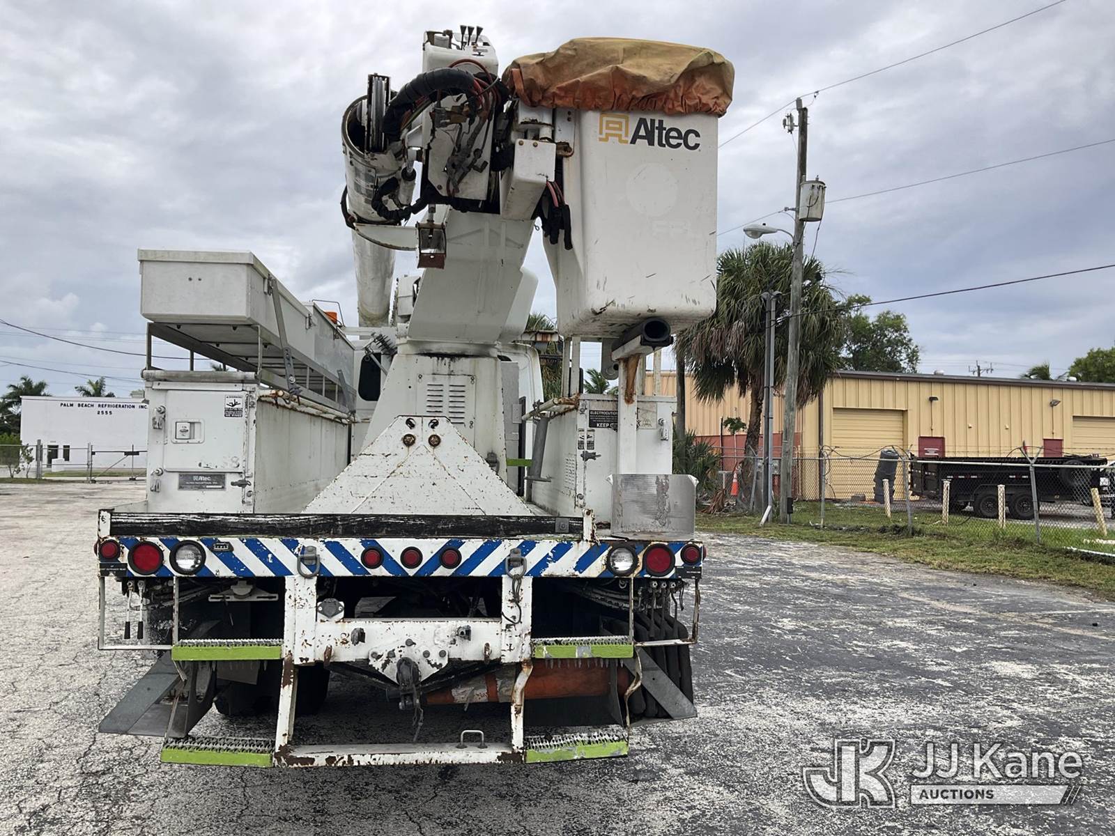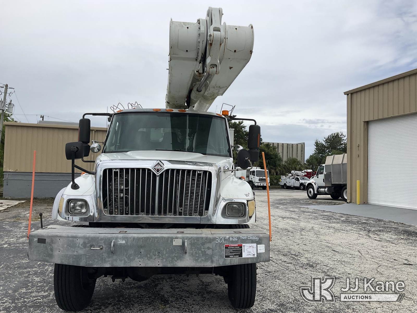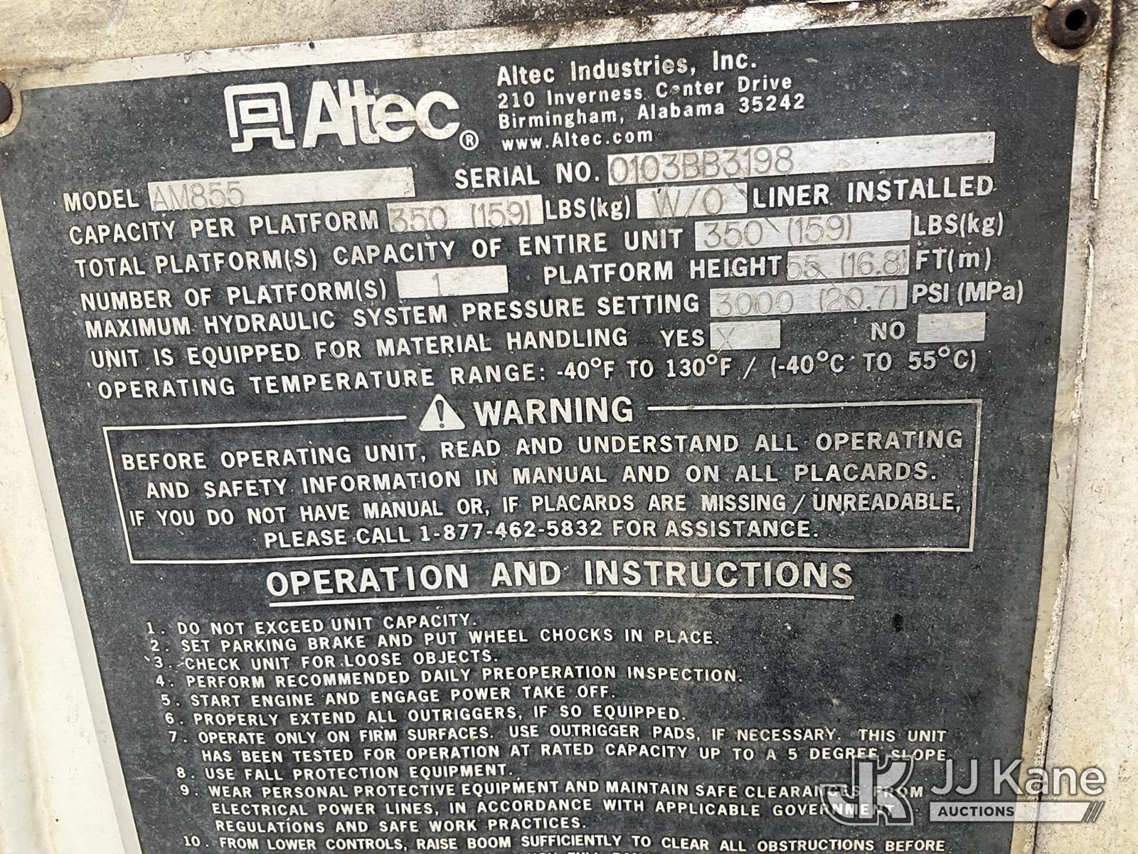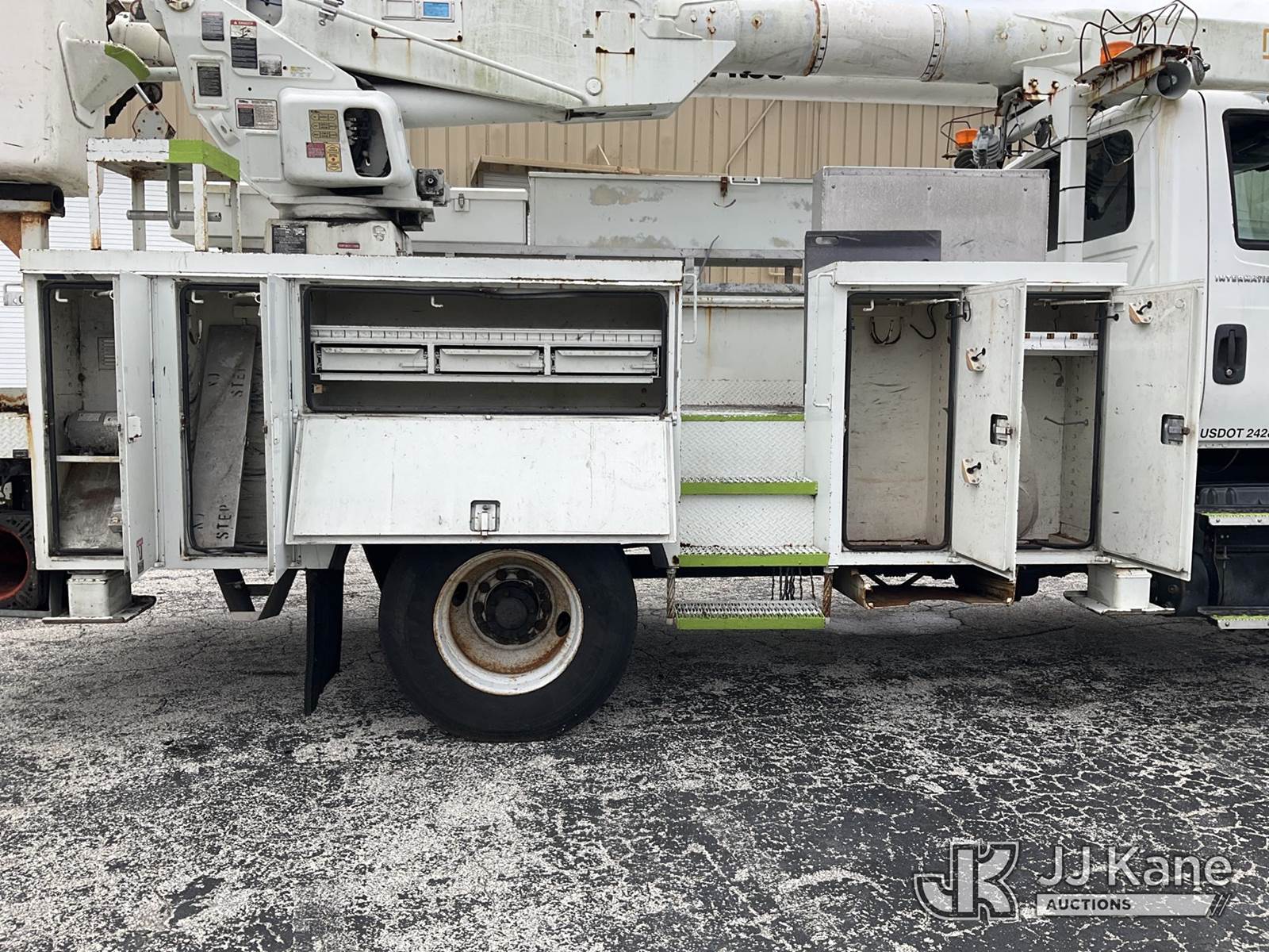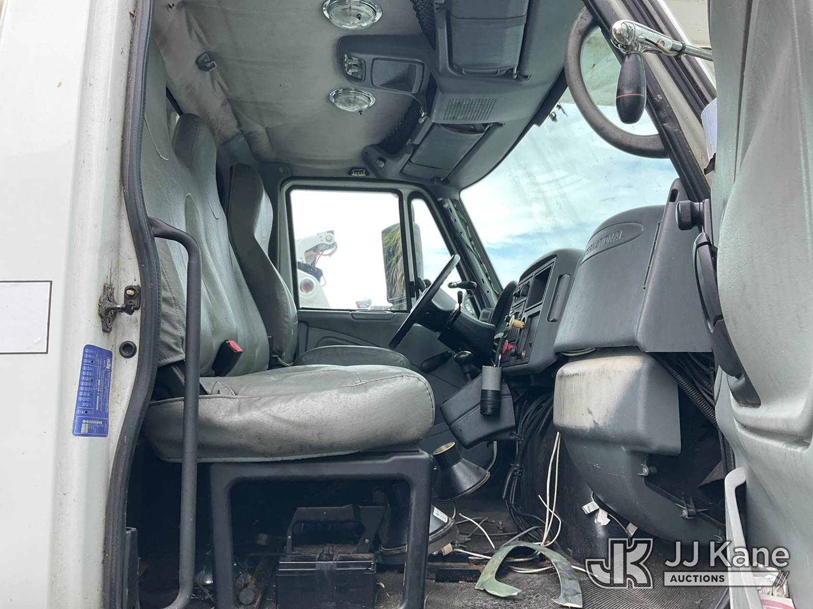 Altec AM855, 60 ft, Over-Center Material Handling Bucket Truck s/n 0103BB3198, with single-man bucket & 4 hyd outriggers, rear mounted on 2003 International 7300 4x4 Utility Truck, DT466 diesel, Auto, A/C, (Exempt from Odometer Disclosure - Reads 190,643 miles) (Runs & Moves, Hard To Start)( PTO Does Not Engage, Upper Operating Condition Unknown)( ABS Light On, Body Damage & Rust, Missing Jib & Cylinder Bracket Hanging Down, Missing Upper Boom Covers) (FL Residents Purchasing Titled Items - tax, title & registration fees will be collected at the maximum rate of $400.00 under 25,999 and $800.00 for Over 26,000 and $250.00 trailers - Proof of insurance is mandatory; Out of State Residents Purchasing Title Items - tax will be collected based upon your state rate.) This is a Titled Item NOTE: This unit is being sold AS IS/WHERE IS via Timed Auction and is located in West Palm Beach, FL. For Pick Up & Removal information, please contact: Andy Garcia @ 561-215-0085. Removals require 24-hr Notice by Appointment Only, Buyer/Hauler must present copy of Paid-in-Full JJ Kane Release Form upon arrival. Purchaser acknowledges ALL lots must be removed within 10 business days of Auction, or a towing & storage fee may be incurred. (Missing manuals, See Auction Company for Manufacturers Information to obtain manuals) (Buyer is responsible for removal. Assistance by consignor or JJ Kane Auctions is not assured.)