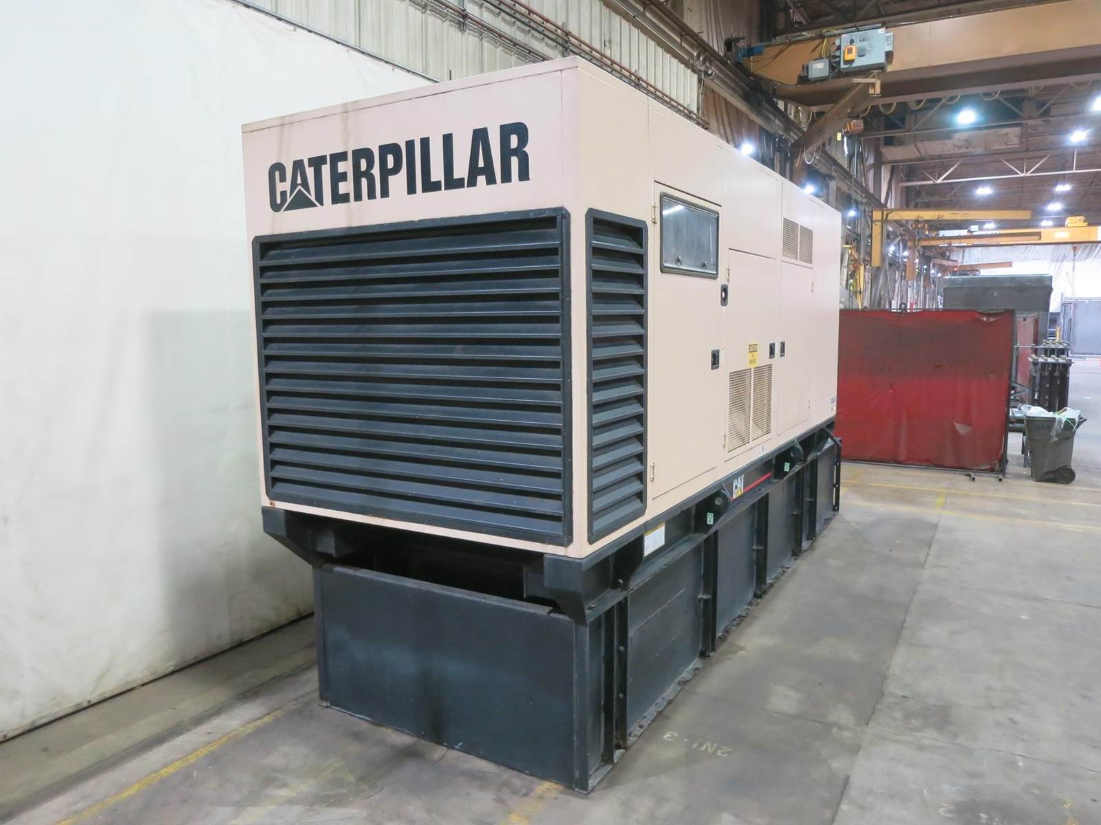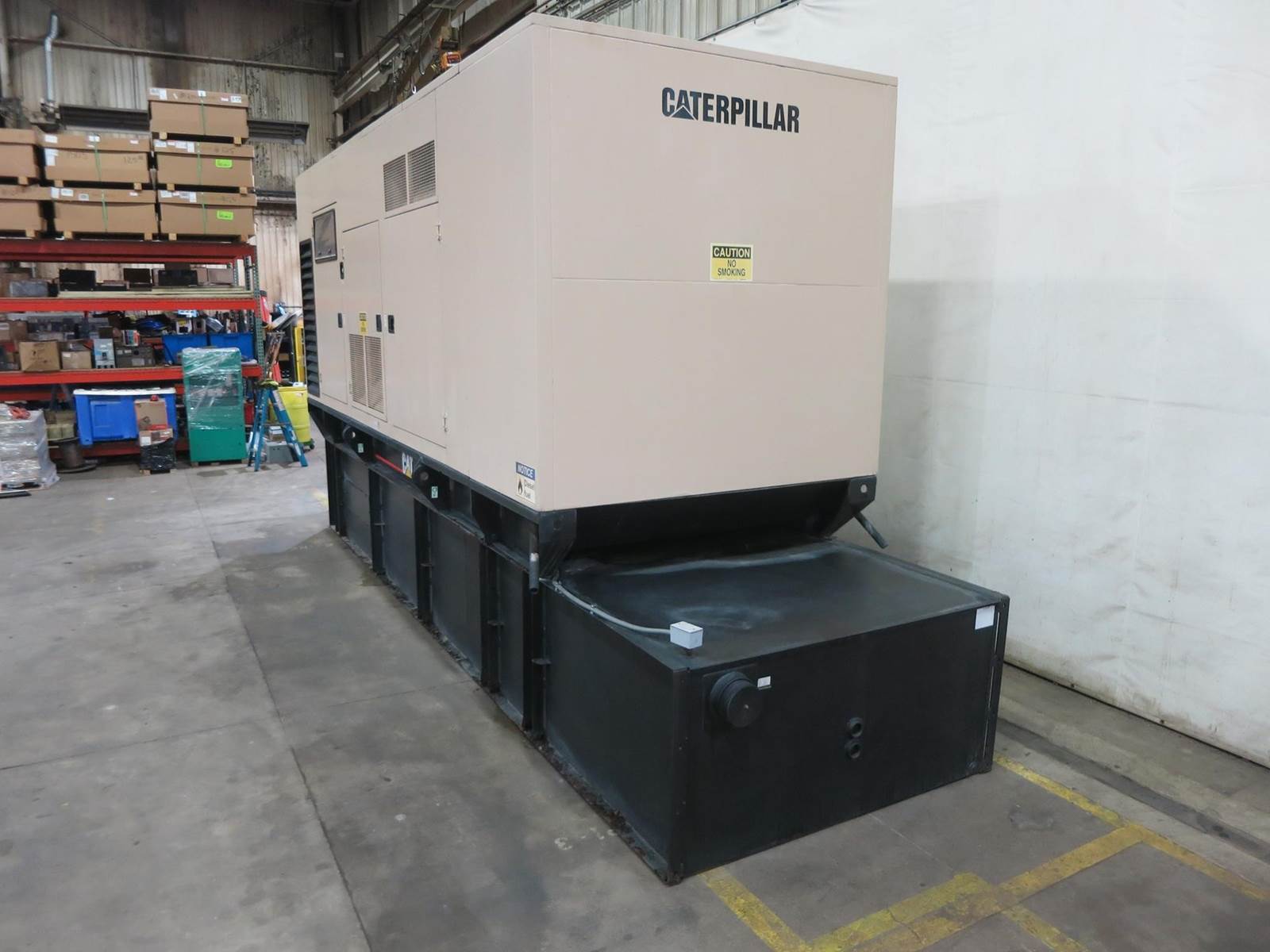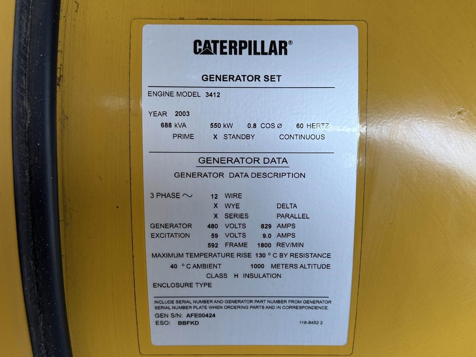 Caterpillar 550 kW standby (500 kW prime) diesel generator set, SN-9EP02674. CAT 3412 engine rated 823 HP at 1800 RPM, SN-3FZ04845. 3/60/277/480V, 12 lead reconnectable to other voltages. 1200 Amp main-line circuit breaker. PMG - permanent magnet generator EMCP II digital control panel. Battery charger. Coolant heater. Sound attenuated enclosure. 2000 gallon sub-base fuel tank with secondary containment. 467 Hrs. Year 2003. CAT Worldwide ESC extended warranty available at additional cost. Overall dimensions 88W x 280L x 137H, 25,000 lbs. Load test pending. FOB Waukesha, WI