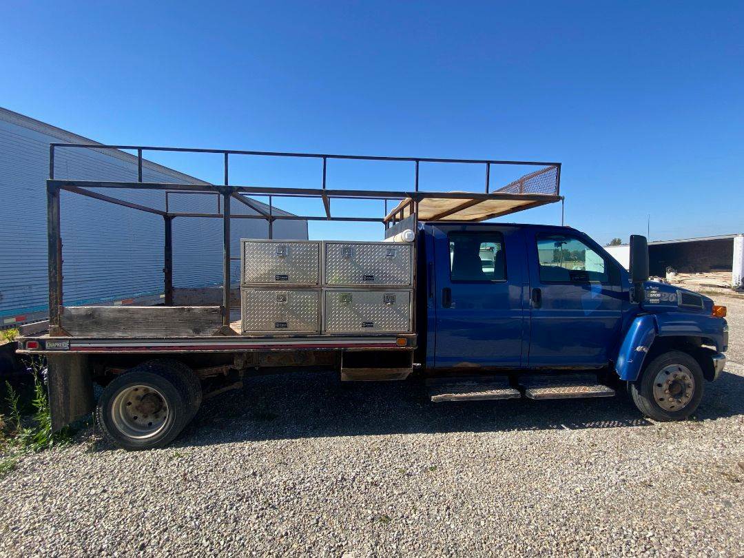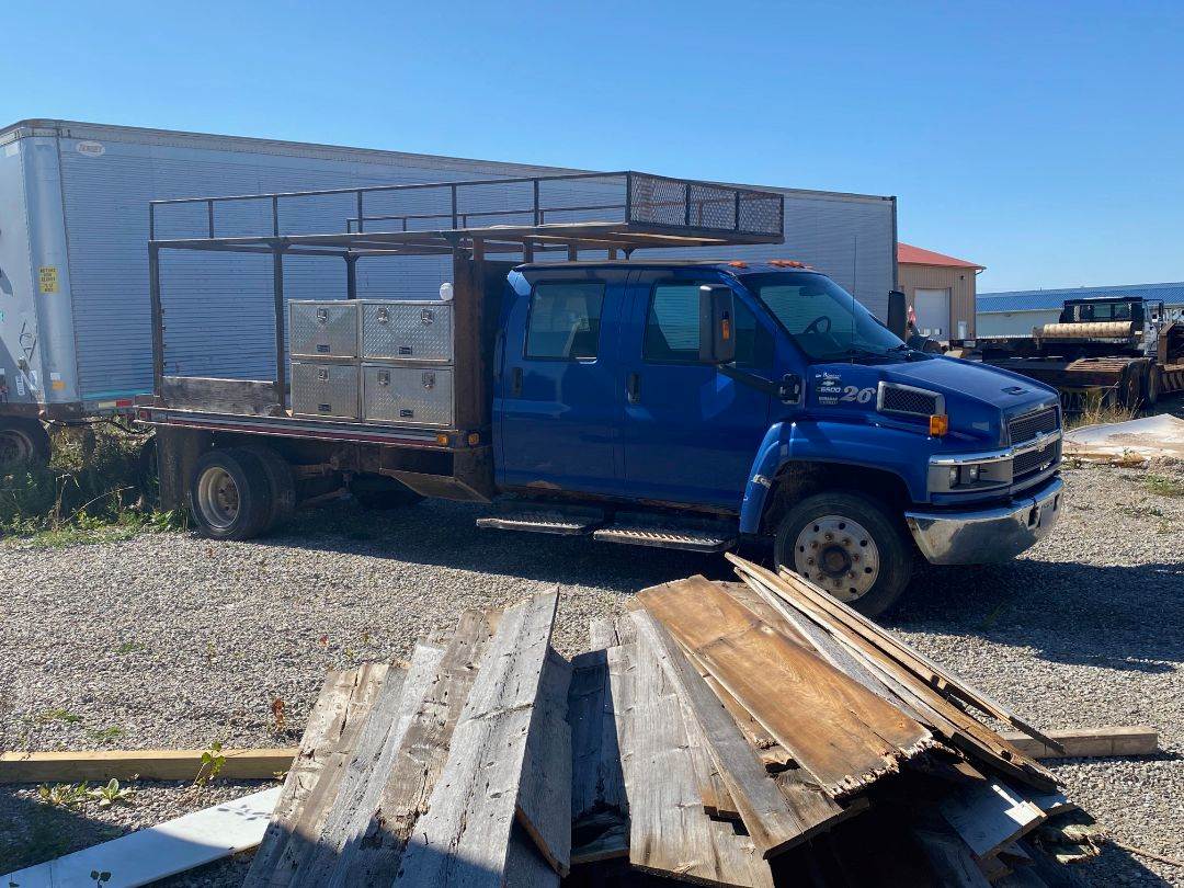 2003 Chevy 5500 Crew Cab Flat Bed Truck, 12' Knapheide flat bed with 7 Aluminum tool boxes, Duramax 6600 (LB7) 300 HP, OHV diesel V8, cast-iron block, aluminum heads, ZF S6-650 (M50) 6-speed manual, Heavy-duty ladder rack, truck was setup and used for concrete form work.