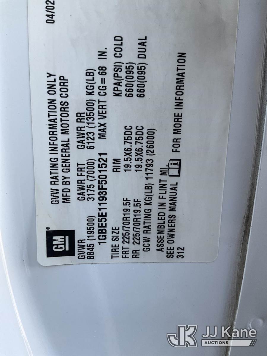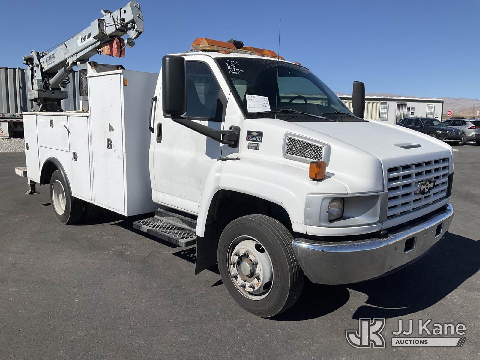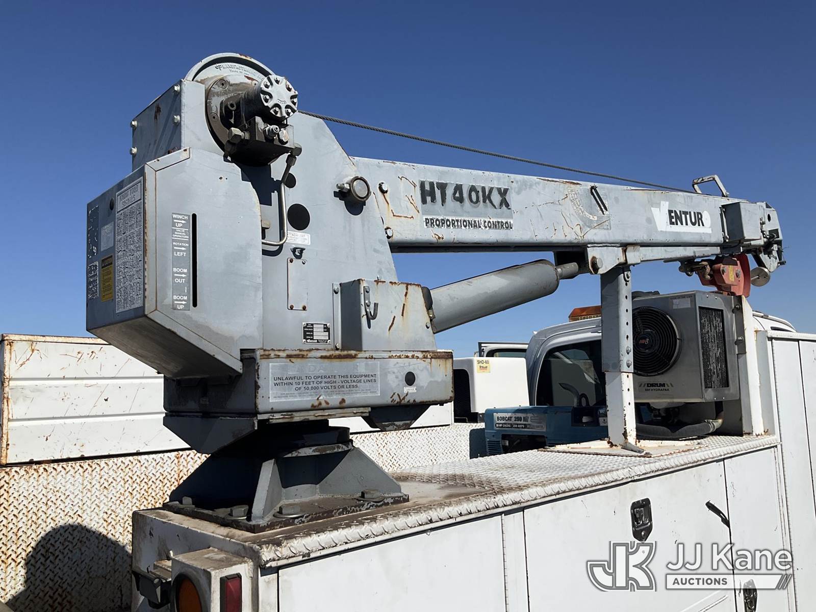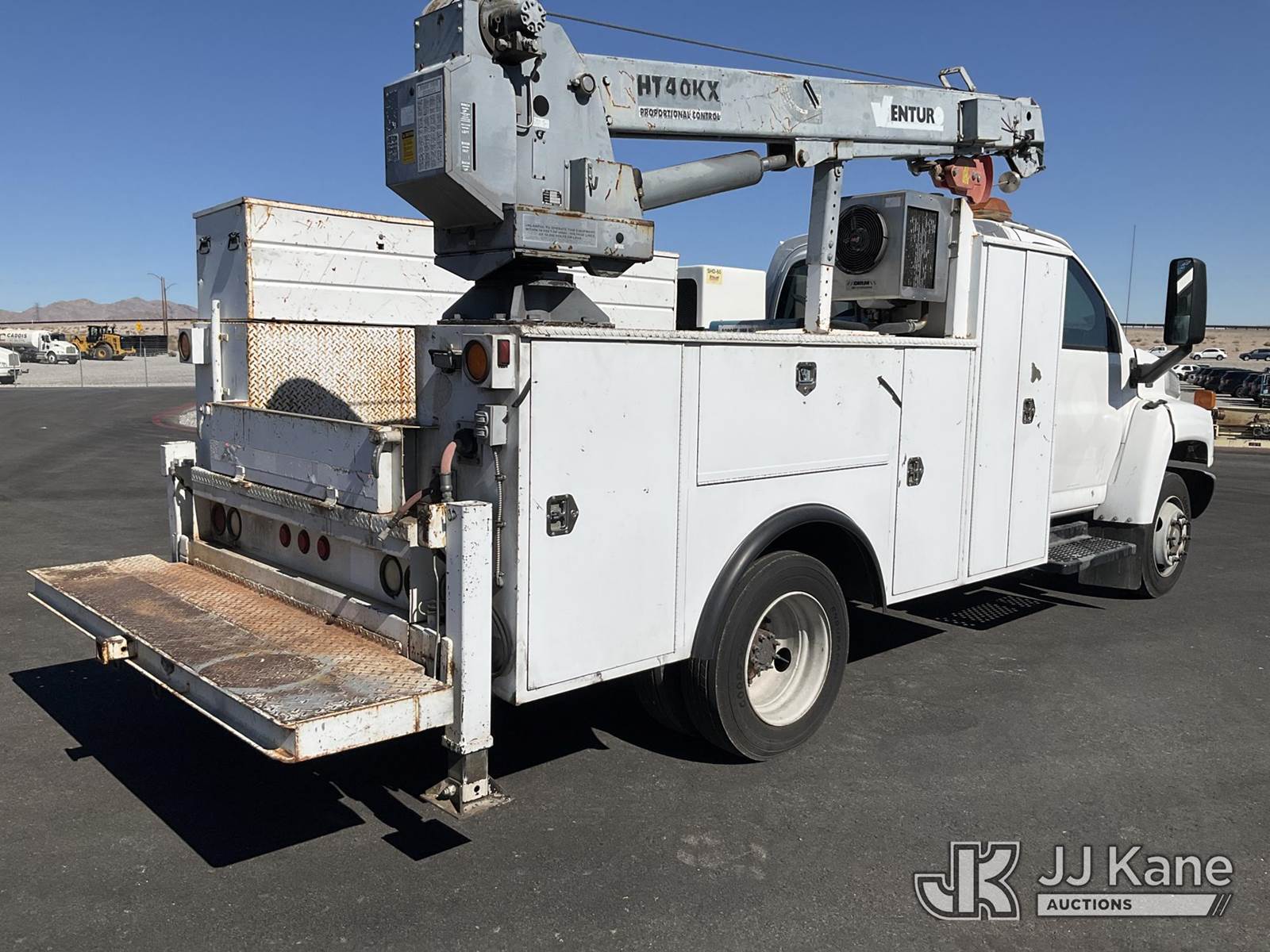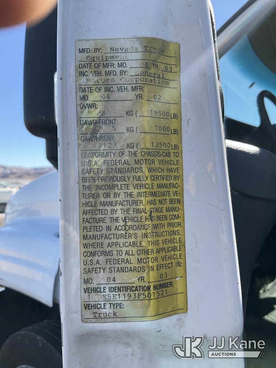 2003 Chevrolet C5C042 Mechanics Service Truck, 6.6L 4X2, DIESEL, A/C, with Service Body, Stellar SHD-60 Compressor, Hyd Stabilizers, Miller Bobcat 250 Welder/Generator, Venturo HT40KX Crane., (Exempt from Odometer Disclosure - Reads 59,320 miles) (Runs & Moves) (Crane Hydraulic Pump Leaks When PTO Is On/Limited Operation) This is a Titled Item NOTE: This unit is being sold AS IS/WHERE IS via Timed Auction and is located in Las Vegas, NV. Inspection & preview days for this unit are the 2 business days prior to the first day of items closing for this auction, item is located at 14655 Grand Valley Pkwy Las Vegas, NV 89165 and hours of operations are 8a-4p. Titles executed exactly as bidder registered. Ensure your name and/or business name and address in JJ Kane and/or ProxiBid is correct before bidding. For pre-sale questions, please contact Office Staff @ (801) 519-0123 and provide sale date and lot number. Las Vegas Dealer License Number DLR000053086 / OHV000053094. (Buyer is responsible for removal. Assistance by consignor or JJ Kane Auctioneers is not assured.)
