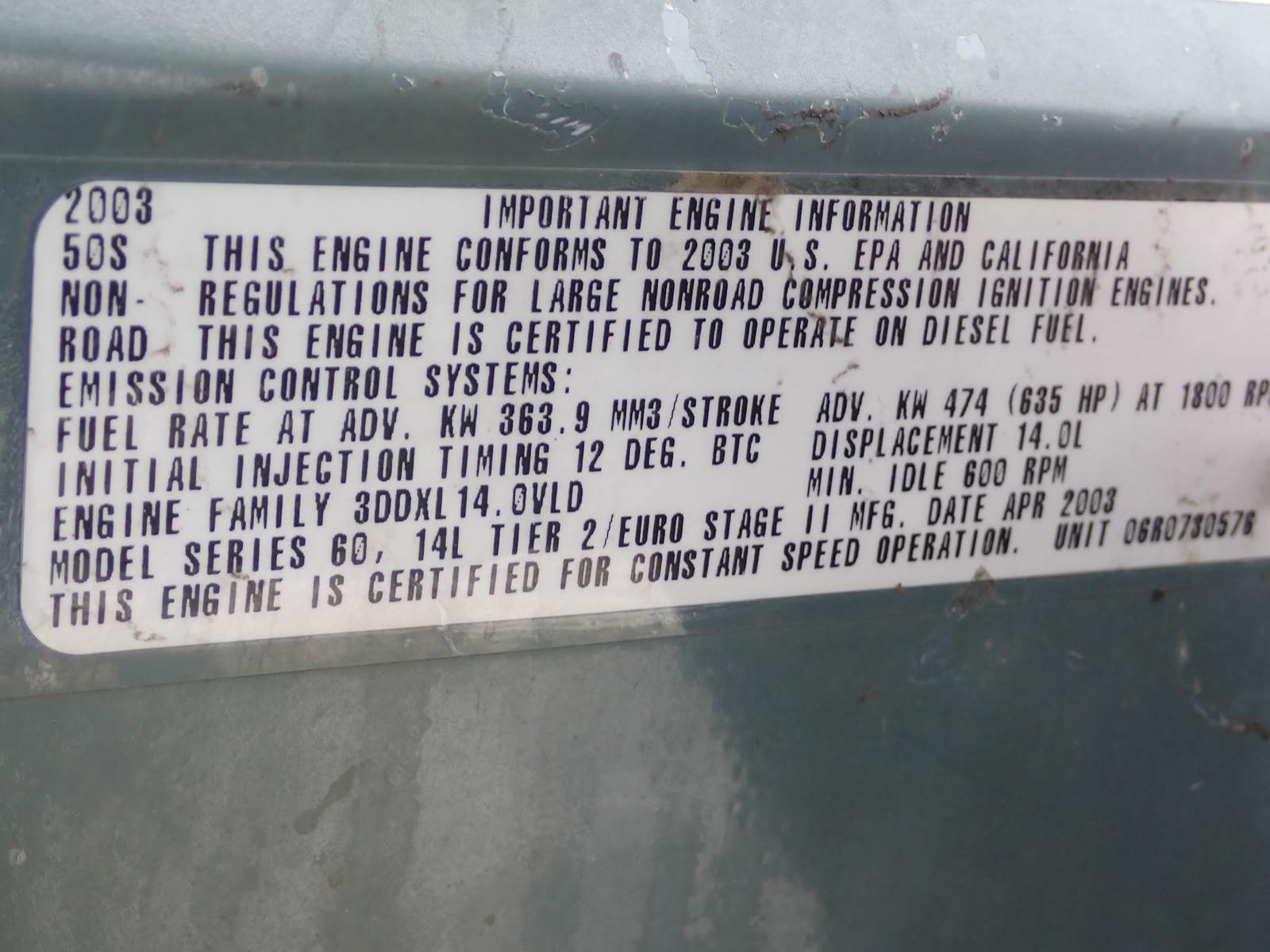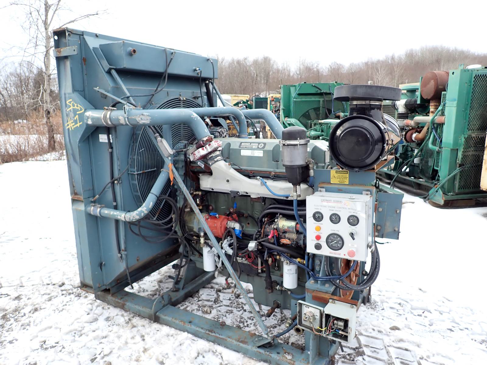 2003 Detroit Diesel Series 60 engine, 14 liter displacement, 665 HP tag rating, DDEC IV ECM, model 6063HK35 industrial spec, NO EGR, complete power unit w/ skid, cooling package & accessories as pictured. TEST RAN EXCELLENT, NO SMOKE OR BLOWBY OBSERVED. 4 PSI OIL PRESSURE DURING COLD TEST RUN. Engine shows just 8803 total hours on ECM. CURRENTLY SET AT 600 HP. GOOD RUNNER -- SEE VIDEO. VERY HARD TO FIND HIGH HORSEPOWER INDUSTRIAL UNIT HERE -- DON'T MISS IT !!