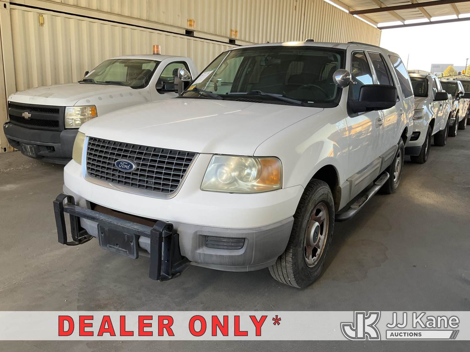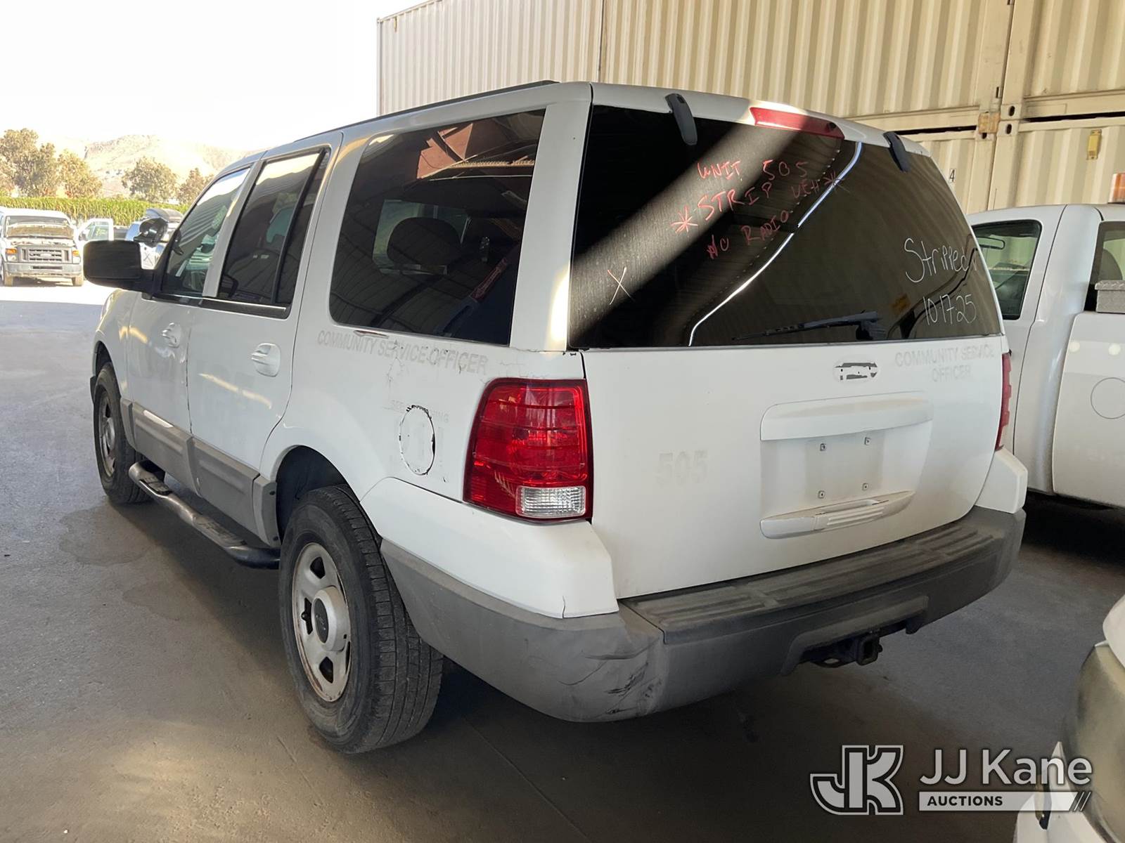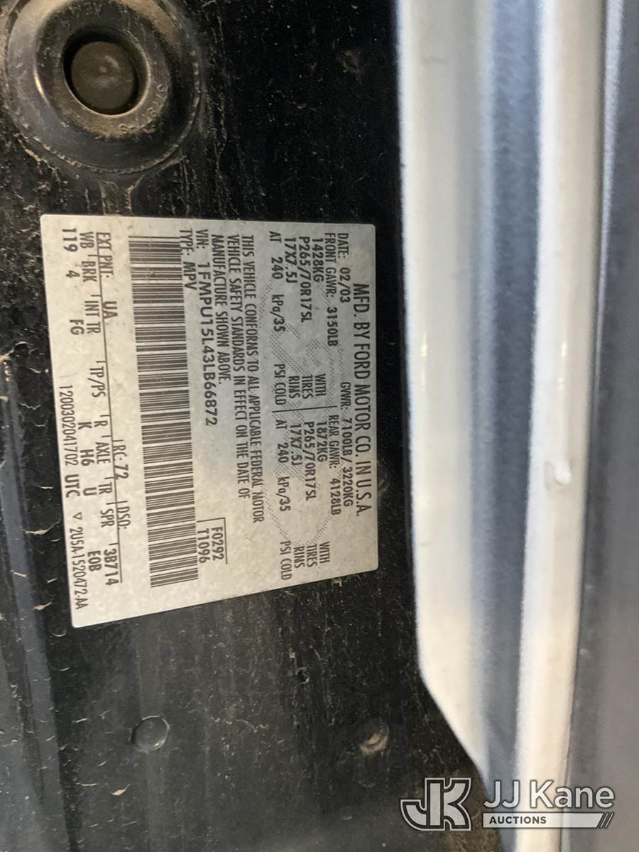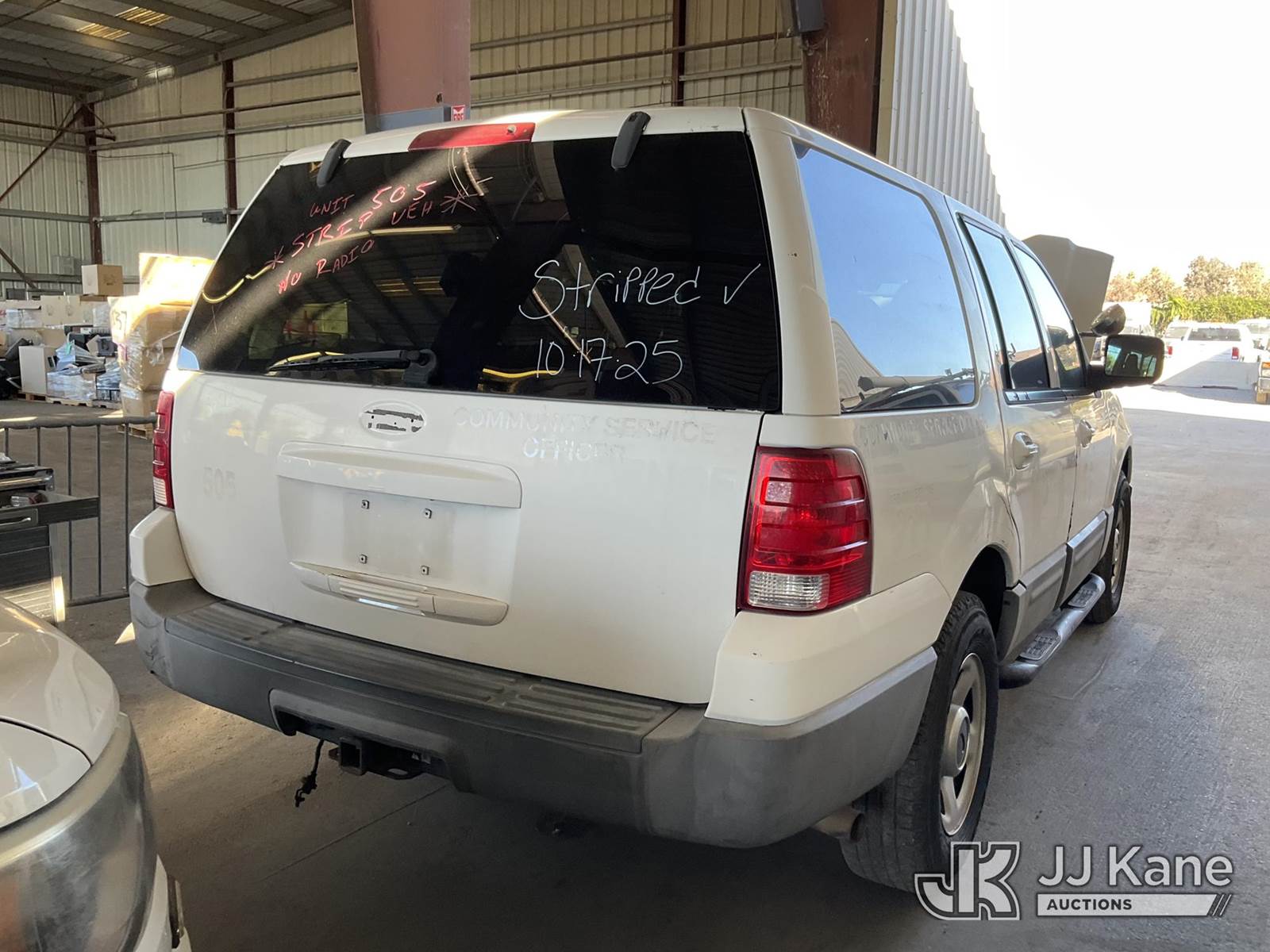 2003 Ford Expedition 4-Door Sport Utility Vehicle, s/n 1FMPU15L43LB66872, 5.4L V8 SOHC 16V 4-Speed Automatic, RWD, Gas, A/C, with tow package & push bar, (Exempt from Odometer Disclosure - Reads 138,341 miles) (Runs & Moves) (Needs New Battery, ABS Light Turns On & Off, Missing Horn, Interior Stripped Of Parts, Brake Lights Not Working) (Bidding Restricted to Licensed Vehicle Dealers Only), This is a Titled Item NOTE: This unit is being sold AS IS/WHERE IS via Timed Auction and is located in Jurupa Valley, CA. Inspection & preview days for this unit are the 2 business days prior to the first day of items closing for this auction, item is located at 4510 Muth Way Jurupa Valley, CA 92509 and hours of operations are 8a-4p. For pre-sale questions, please contact please contact Office Staff @ (310) 353-7140. Dealer License Number 45696. (Buyer is responsible for removal. Assistance by consignor or JJ Kane Auctioneers is not assured.)