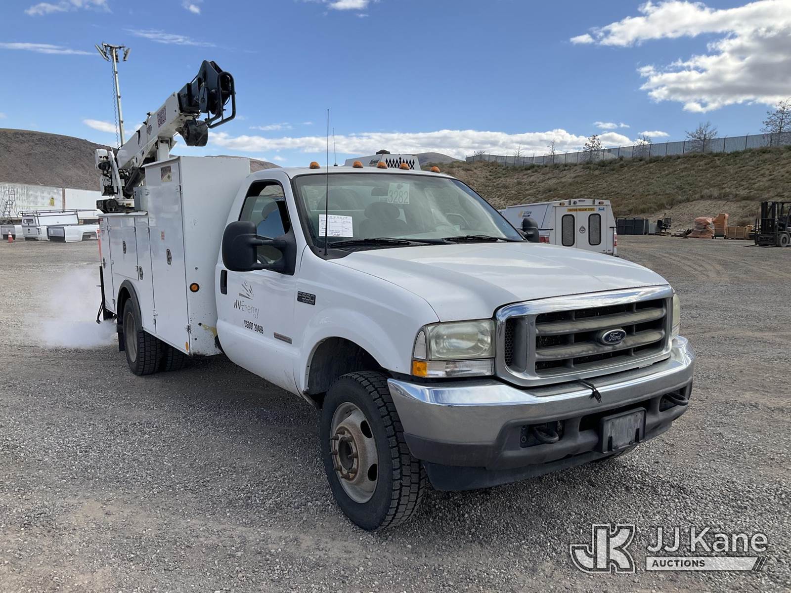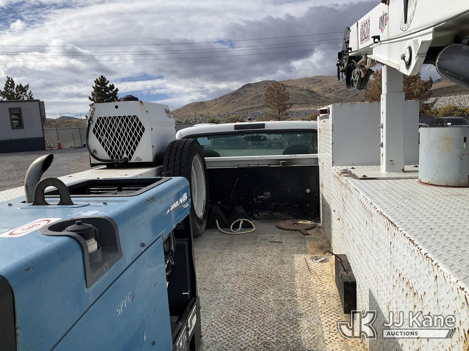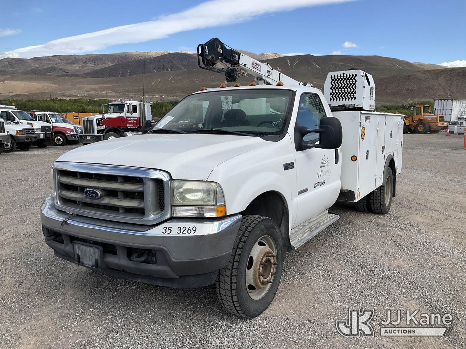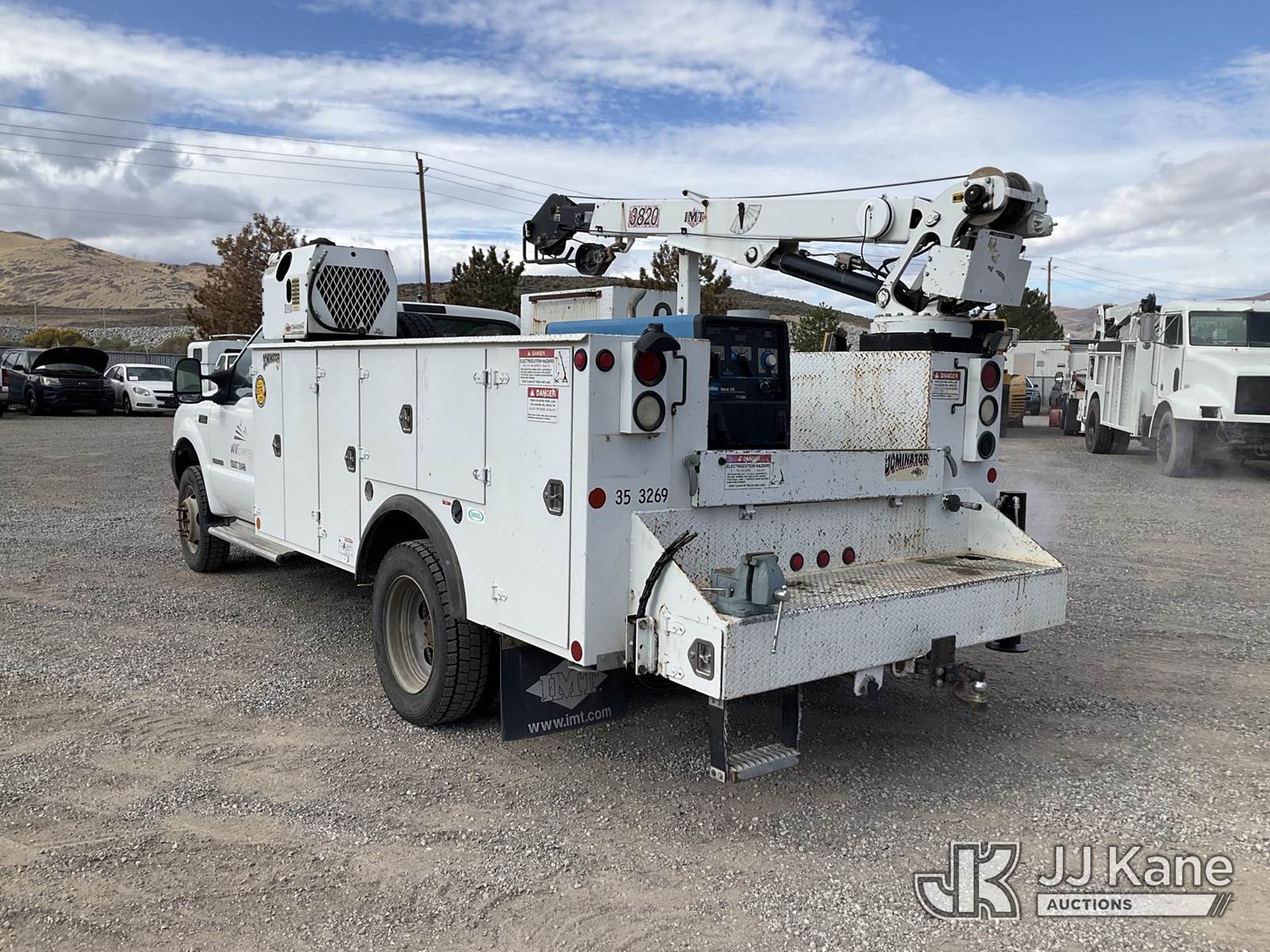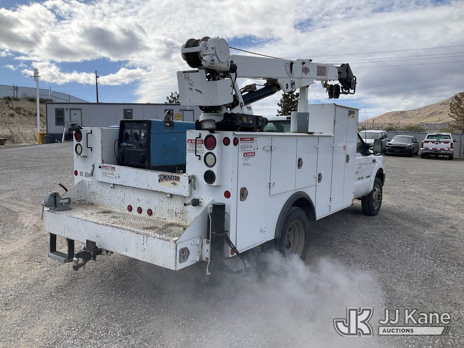 2003 Ford F-550 Regular Cab 2WD DRW Mechanics Service Truck, 6.0L V8 OHV 32V TURBO Auto, RWD, diesel, A/C, with Miller Bobcat 225 Welder, IMT DA435HA Hydraulic Air Compressor, IMT 3820 Crane, (Exempt from Odometer Disclosure - Reads 82,671 miles) (Runs, Barely Moves, & Compressor, Welder Operate)(Ripped Seat, White Smoke From Exhaust, Oil Coming Out of Exhaust, PTO Engages - Drivers Side Outrigger Removed & Stowed in Utility Bed, Crane Not Operable - Condition Unknown) This is a Titled Item NOTE: This unit is being sold AS IS/WHERE IS via Timed Auction and is located in Sparks, NV. Inspection & preview days for this unit are the 2 business days prior to the first day of items closing for this auction, item is located at 601 Britain Dr Sparks, NV 89437 and hours of operations are 8a-4p. Titles executed exactly as bidder registered. Ensure your name and/or business name and address in JJ Kane and/or ProxiBid is correct before bidding. For pre-sale questions, please contact Office Staff @ (801) 519-0123 and provide sale date and lot number. Sparks Dealer License Number DLR000052908 / OHV000052909. (Buyer is responsible for removal. Assistance by consignor or JJ Kane Auctioneers is not assured.)