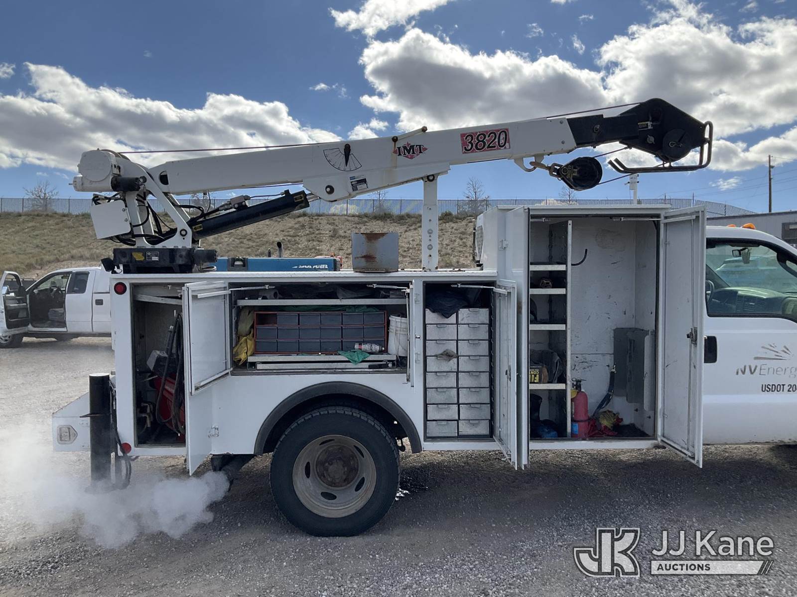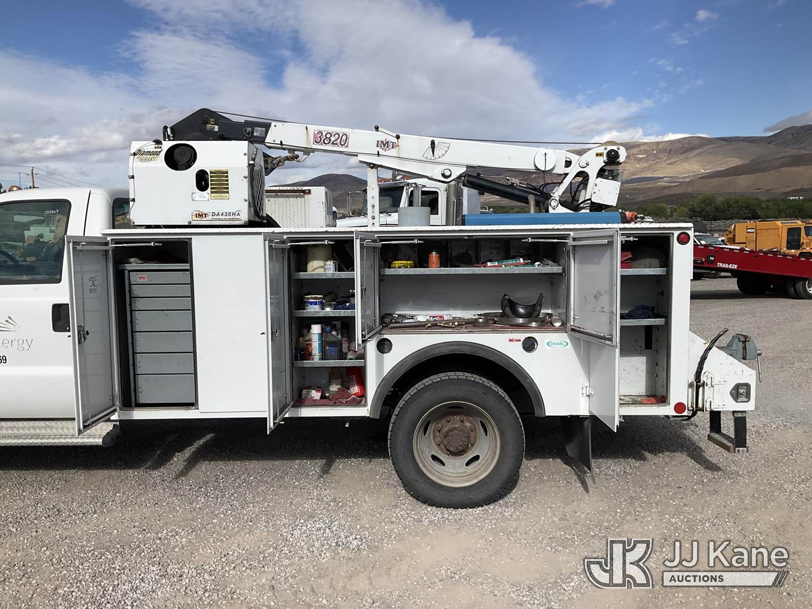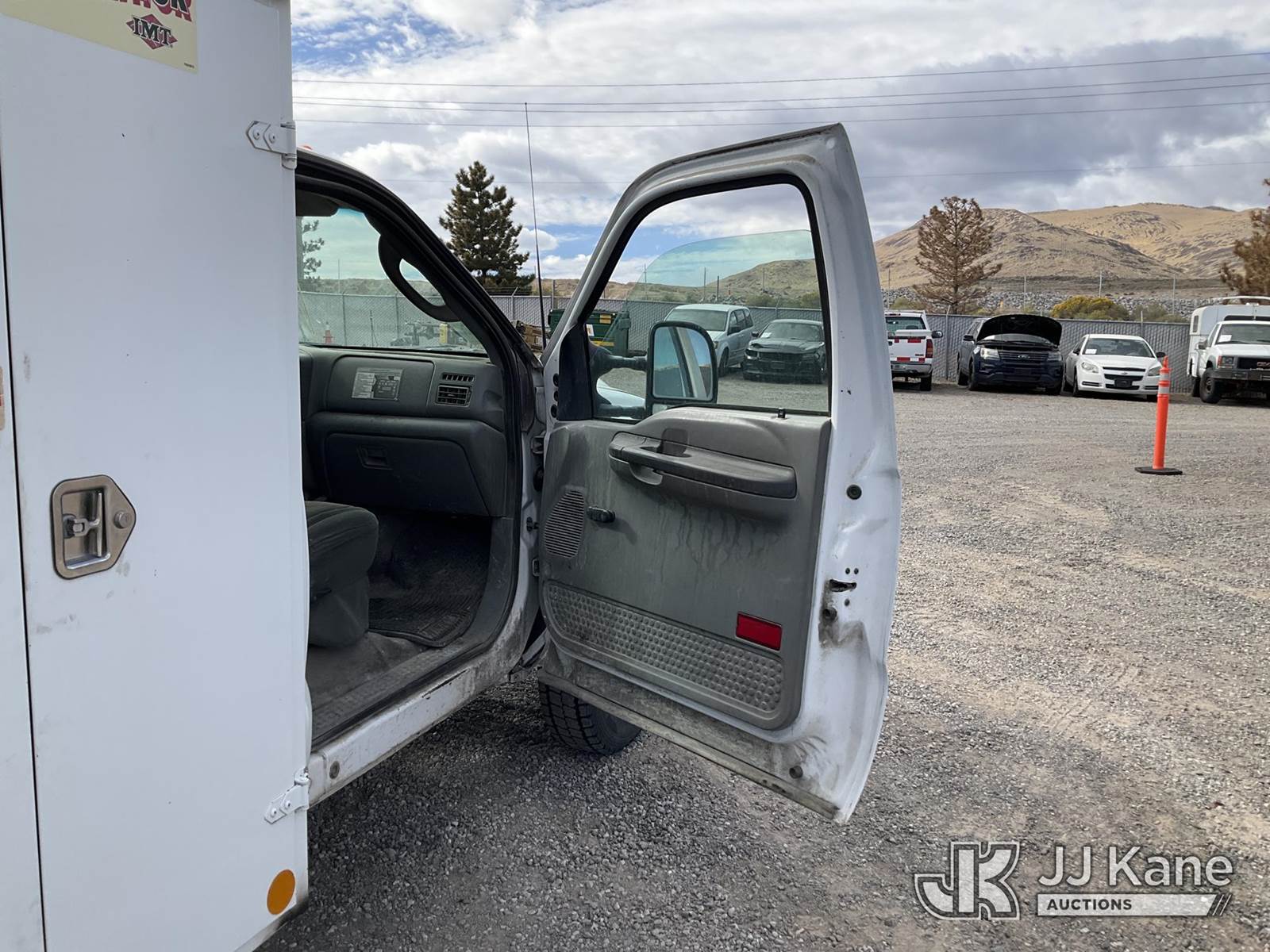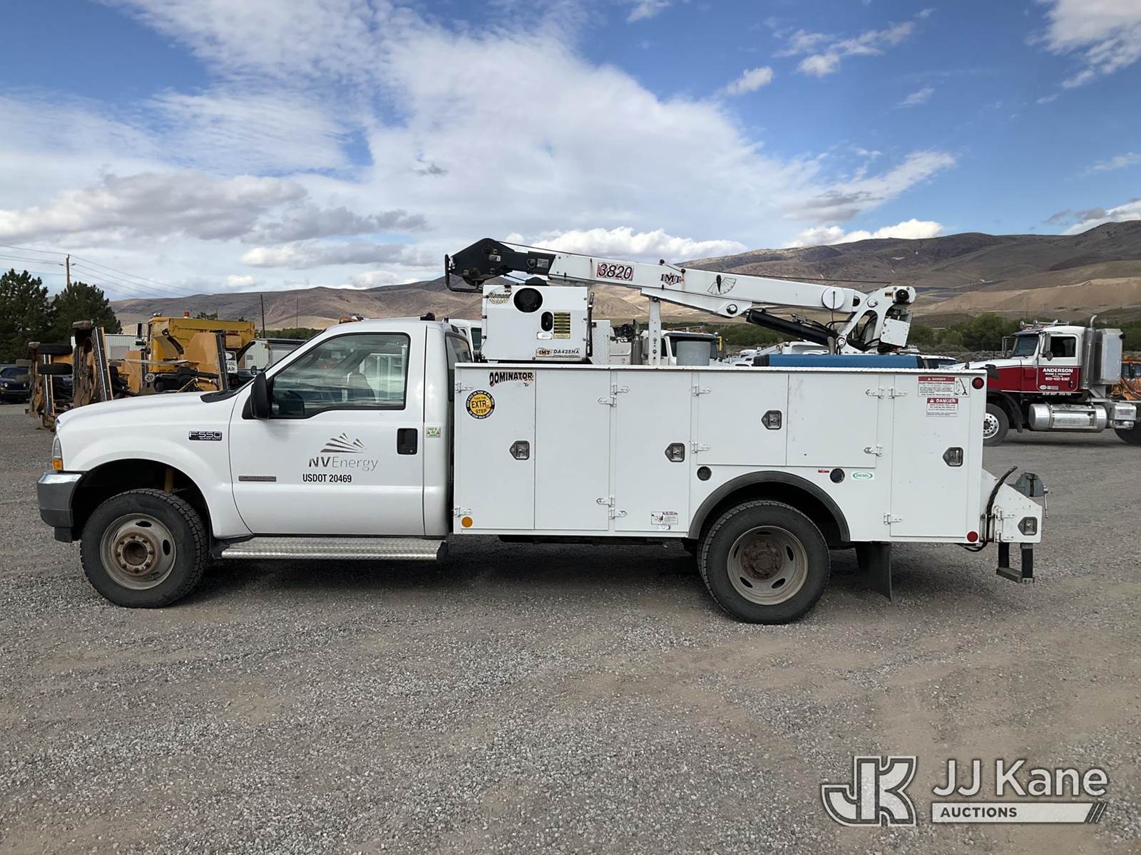 2003 Ford F-550 Regular Cab 2WD DRW Mechanics Service Truck, 6.0L V8 OHV 32V TURBO Auto, RWD, diesel, A/C, with Miller Bobcat 225 Welder, IMT DA435HA Hydraulic Air Compressor, IMT 3820 Crane, (Exempt from Odometer Disclosure - Reads 82,671 miles) (Runs, Barely Moves, & Compressor, Welder Operate)(Ripped Seat, White Smoke From Exhaust, Oil Coming Out of Exhaust, PTO Engages - Drivers Side Outrigger Removed & Stowed in Utility Bed, Crane Not Operable - Condition Unknown) This is a Titled Item NOTE: This unit is being sold AS IS/WHERE IS via Timed Auction and is located in Sparks, NV. Inspection & preview days for this unit are the 2 business days prior to the first day of items closing for this auction, item is located at 601 Britain Dr Sparks, NV 89437 and hours of operations are 8a-4p. Titles executed exactly as bidder registered. Ensure your name and/or business name and address in JJ Kane and/or ProxiBid is correct before bidding. For pre-sale questions, please contact Office Staff @ (801) 519-0123 and provide sale date and lot number. Sparks Dealer License Number DLR000052908 / OHV000052909. (Buyer is responsible for removal. Assistance by consignor or JJ Kane Auctioneers is not assured.)
