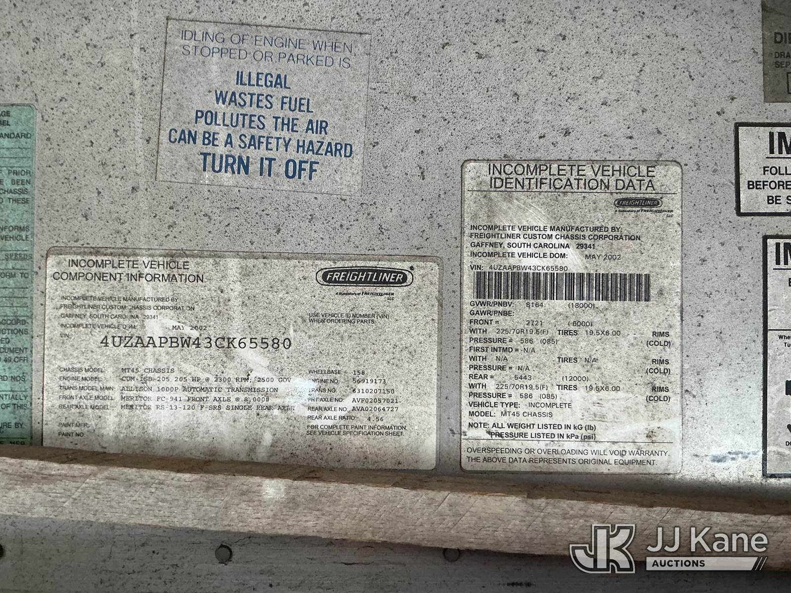 2003 Freightliner MT45 Chassis Step Van, 5.9L 4X2, diesel, Auto, (Exempt from Odometer Disclosure - Reads 58,459 miles) (Runs & Moves, No Brakes, Must Tow) This is a Titled Item NOTE: This unit is being sold AS IS/WHERE IS via Timed Auction and is located in Plymouth Meeting, PA. Inspection & preview days for this unit are the 2 business days prior to the first day of items closing for this auction, item is located at 1402 Conshohocken Rd Plymouth Meeting, PA 19462 and hours of operations are 8a-4p. For pre-sale questions, please contact Bruce Thomas @ (267) 887-0392 or bruce.thomas.jr@jjkane.com. (Buyer is responsible for removal. Assistance by consignor or JJ Kane Auctions is not assured.)