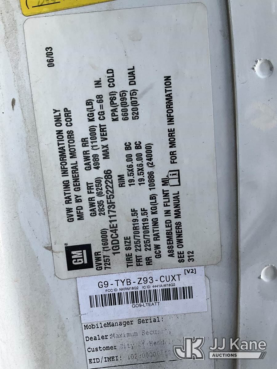 2003 GMC C4500 Dump Flatbed Truck, 6.6L diesel, 4X2, Auto, A/C, (Exempt from Odometer Disclosure - Reads 68,145 miles) (Runs, Moves & Dump Operates) This is a Titled Item NOTE: This unit is being sold AS IS/WHERE IS via Timed Auction and is located in Las Vegas, NV. Inspection & preview days for this unit are the 2 business days prior to the first day of items closing for this auction, item is located at 14655 Grand Valley Pkwy Las Vegas, NV 89165 and hours of operations are 8a-4p. Titles executed exactly as bidder registered. Ensure your name and/or business name and address in JJ Kane and/or ProxiBid is correct before bidding. For pre-sale questions, please contact Office Staff @ (801) 519-0123 and provide sale date and lot number. Las Vegas Dealer License Number DLR000053086 / OHV000053094. (Buyer is responsible for removal. Assistance by consignor or JJ Kane Auctions is not assured.)