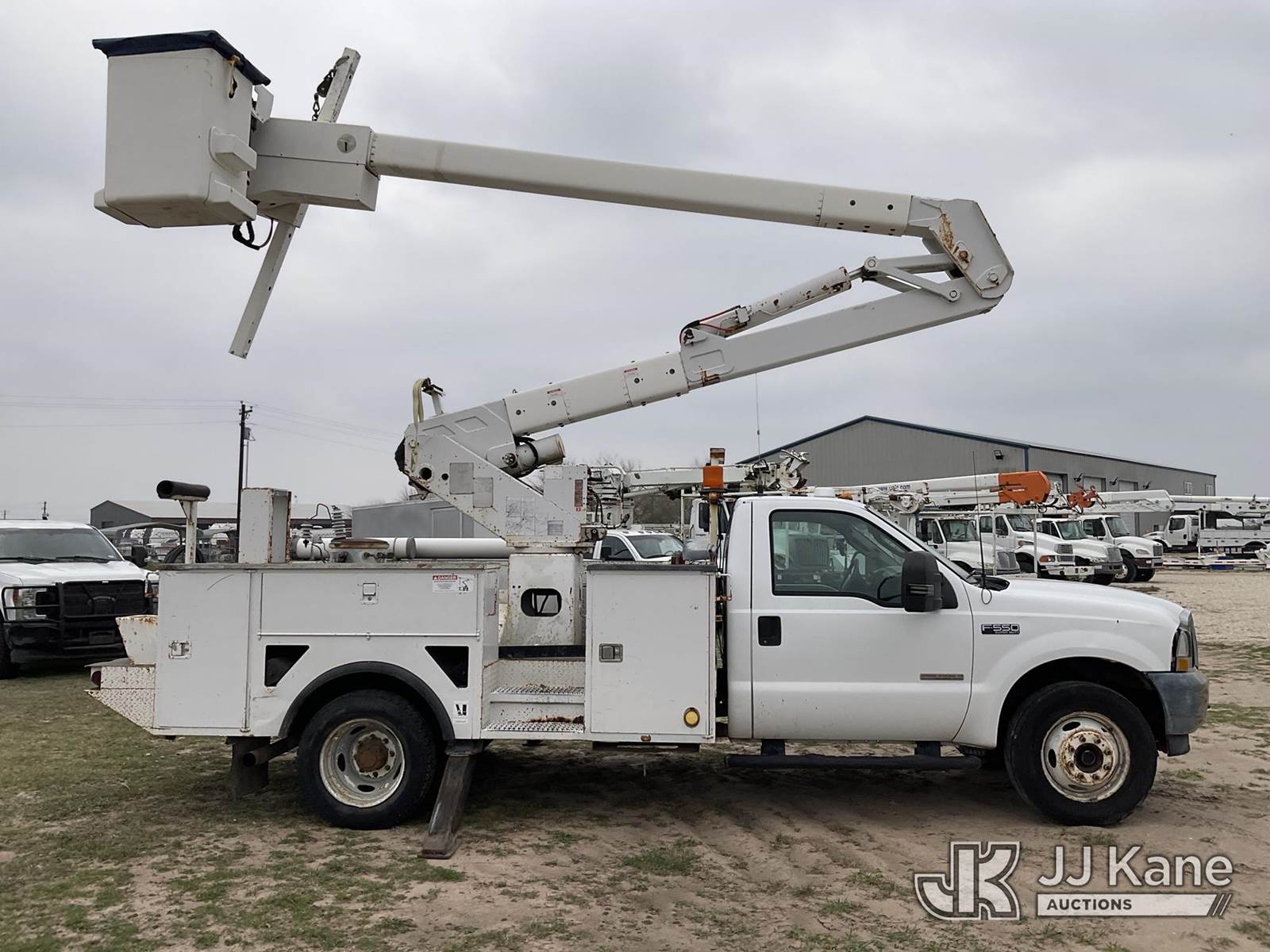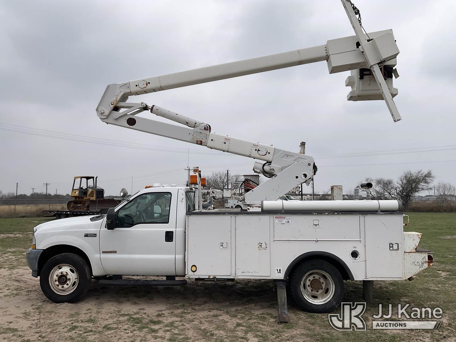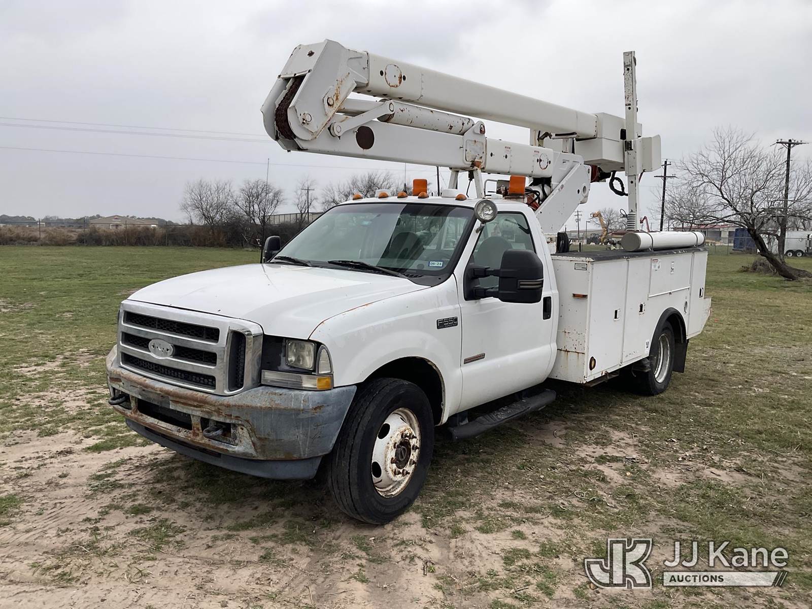 HiRanger HR37-M, 42 ft, Articulating Material Handling Bucket Truck s/n 2030722314, with single-man bucket & 2 hyd outriggers, mounted behind cab on 2003 Ford F-550 Regular Cab 4WD DRW Utility Truck, 6.0L V8 OHV 32V TURBO DIESEL Auto, A/C, (Exempt from Odometer Disclosure - Reads 210,205 miles) (Runs, Moves & Upper Operates) This is a Titled Item NOTE: This unit is being sold AS IS/WHERE IS via Timed Auction and is located in Victoria, TX. For more information & removal arrangements please contact Charles DeKanter @ (281) 910-7147 (Missing manuals, See Auction Company for Manufacturers Information to obtain manuals) (Buyer is responsible for removal. Assistance by consignor or JJ Kane Auctions is not assured.)