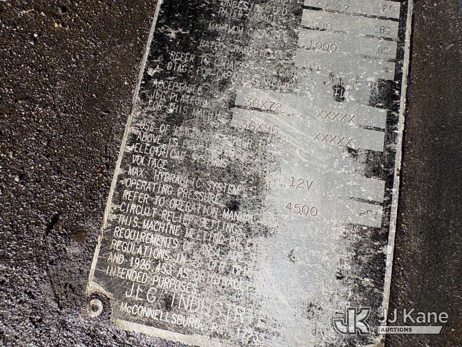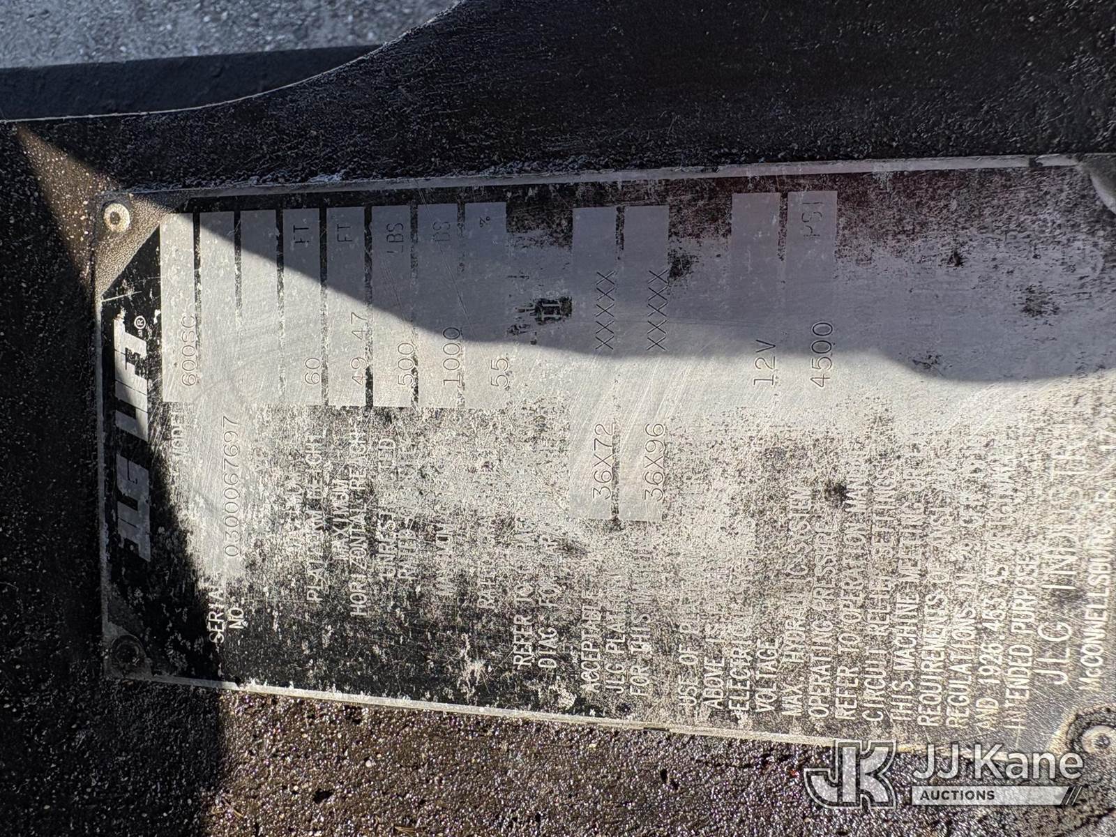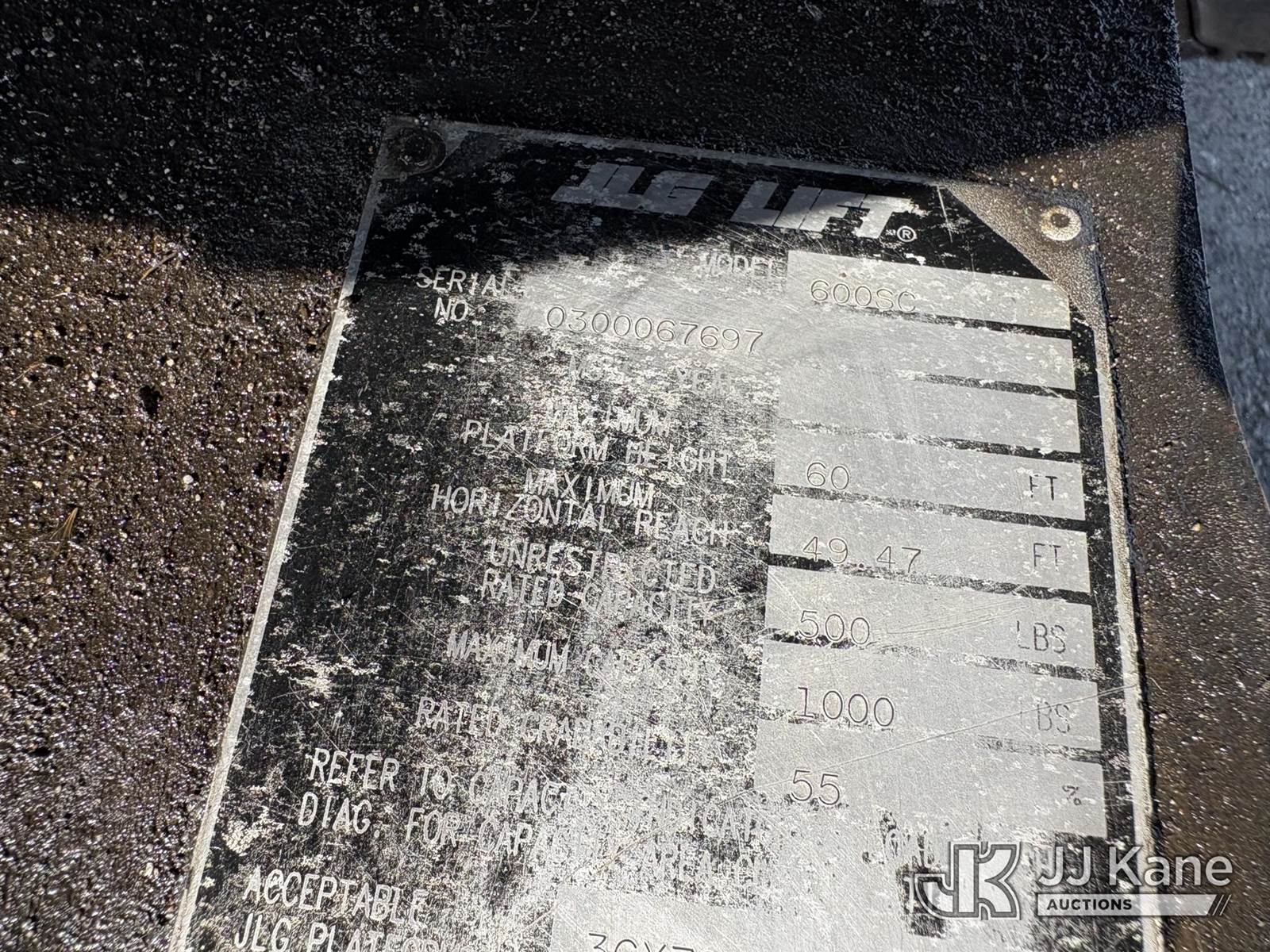 2003 JLG 600SC Self-Propelled Telescopic Manlift, s/n 300067697, Deutz diesel, Hydrostatic, with 60ft platform height, (Runs, Moves, Operates. ) (Reads 3,437 hours) NOTE: This unit is being sold AS IS/WHERE IS via Timed Auction and is located in Hawk Point, MO. Inspection & preview days for this unit are the 2 business days prior to the first day of items closing for this auction, item is located at 25 State Highway A Hawk Point, MO 63349 and hours of operations are 8a-4p. For pre-sale questions, please contact Adam Stanek at (636) 295-1594. (Buyer is responsible for removal. Assistance by consignor or JJ Kane Auctions is not assured.)