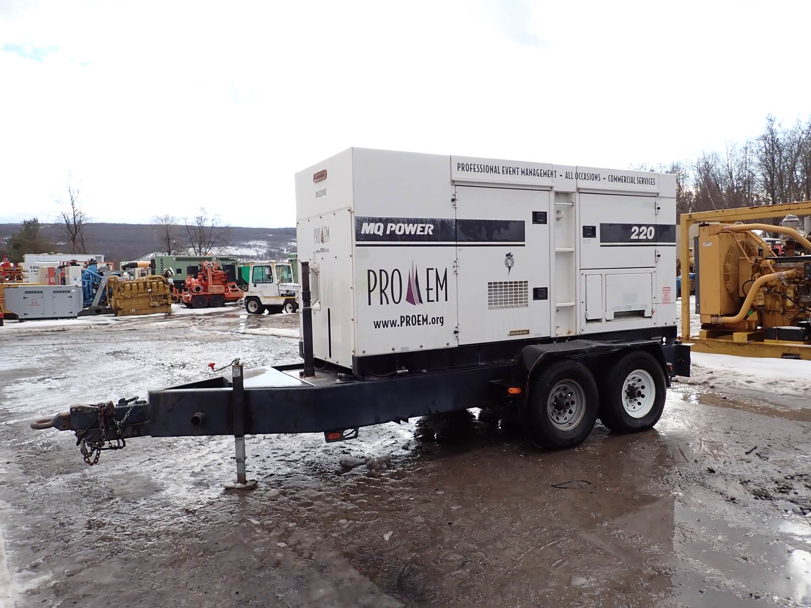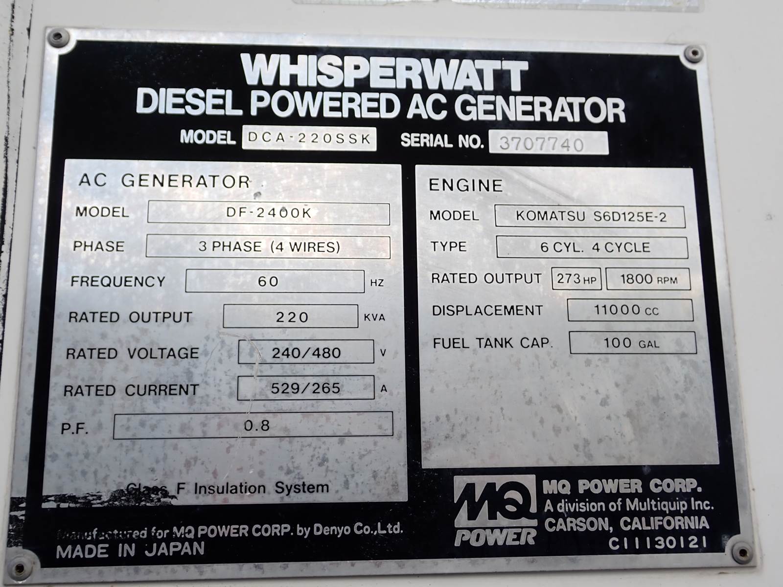 2003 Multiquip Whisperwatt DCA-220SSK generator, 220 Kva/176 KW rating, Komatsu SAA6D125 diesel engine, FULLY MECHANICAL FUEL SYSTEM, PRE-EMISSIONS, showing 6963 hours on meter, 120/240/480 V settings, 1ph/3ph selectable, pre-wired w/ plugs & lugs, 529/265 amp ratings, rental ready unit, trailer mounted, towable. GOOD RUNNING UNIT -- SEE VIDEO -- VERY CLEAN CONDITION FOR THE YEAR AND BEST OF ALL -- A MECHANICAL KOMATSU DIESEL ENGINE FOR RELIABILITY AND STRESS FREE GENERATING -- HARD TO FIND -- SUPER CLEAN -- DON'T MISS IT !!