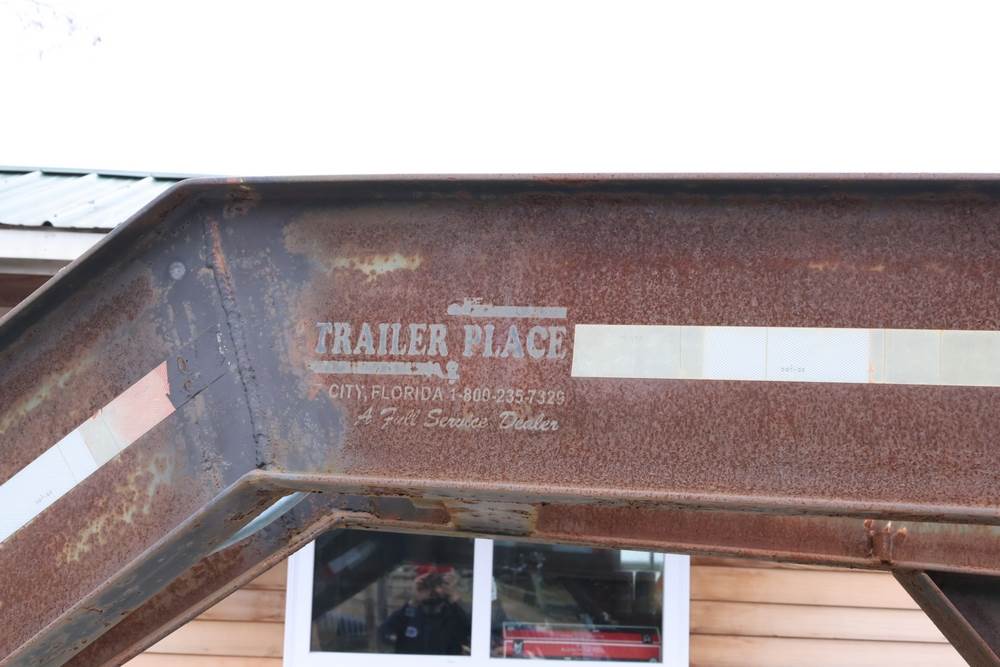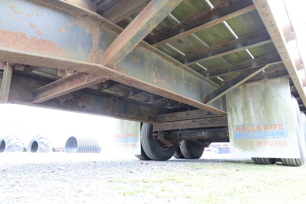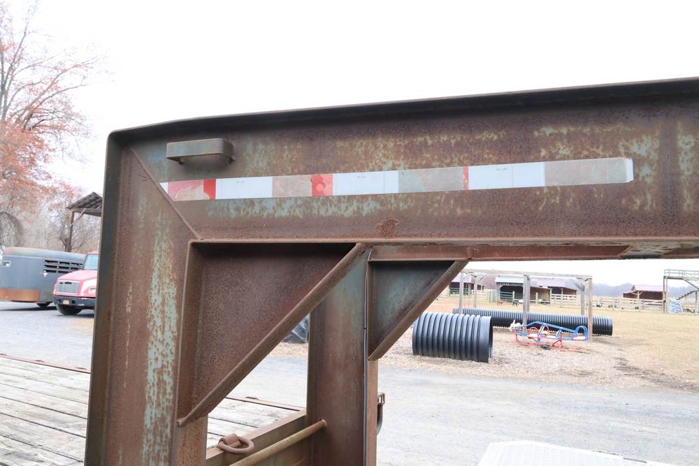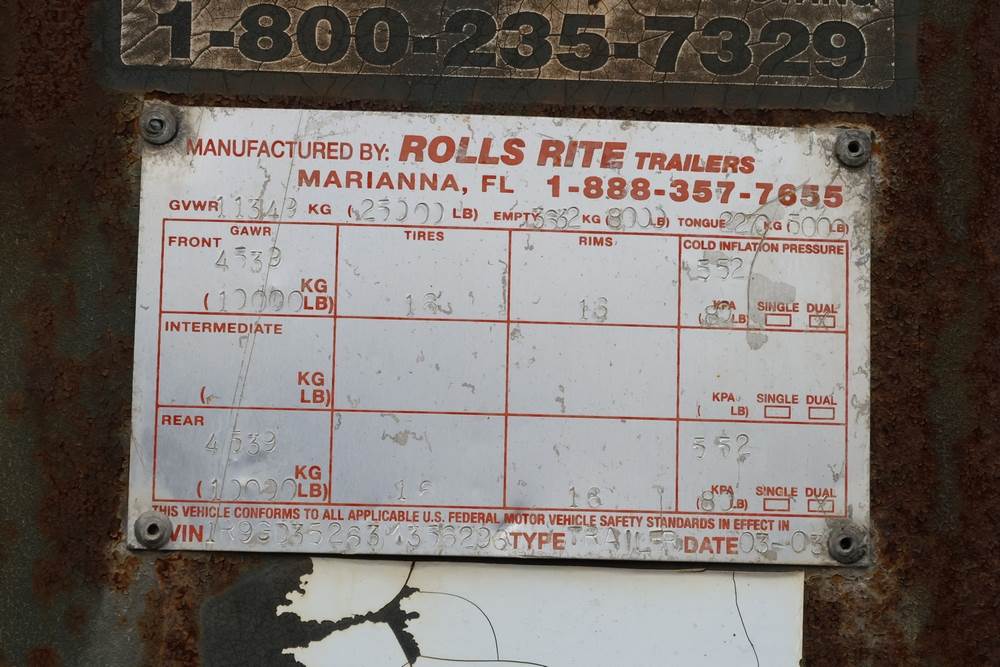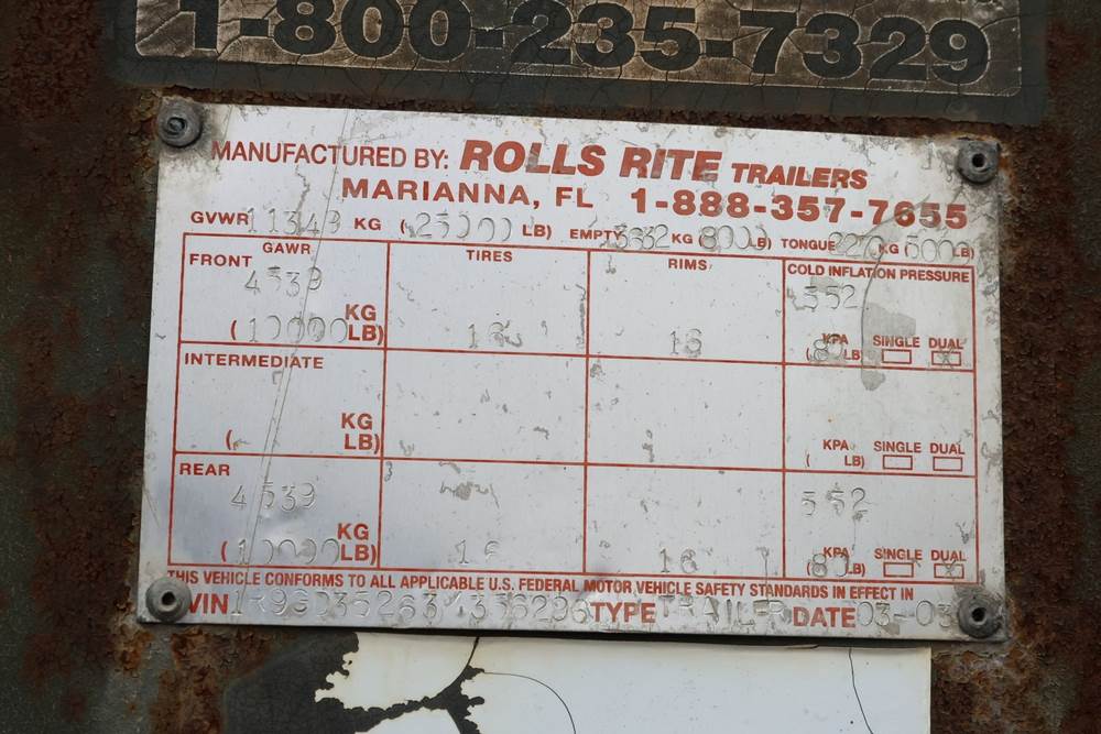 2003 Rolls Rite 35' gooseneck equipment trailer. VIN: 1R9GD35263M356296. GVWR listed as 25,000 lb on trailer markings. Tandem dual-wheel axle configuration with electric brakes visible. Features a wood deck, steel beavertail, flip-up loading ramps, stake pockets along the deck, gooseneck hitch, and 7-pin electrical connector. Manufacturer’s ID plate shows GAWR values of 10,000 lb front and 10,000 lb rear.