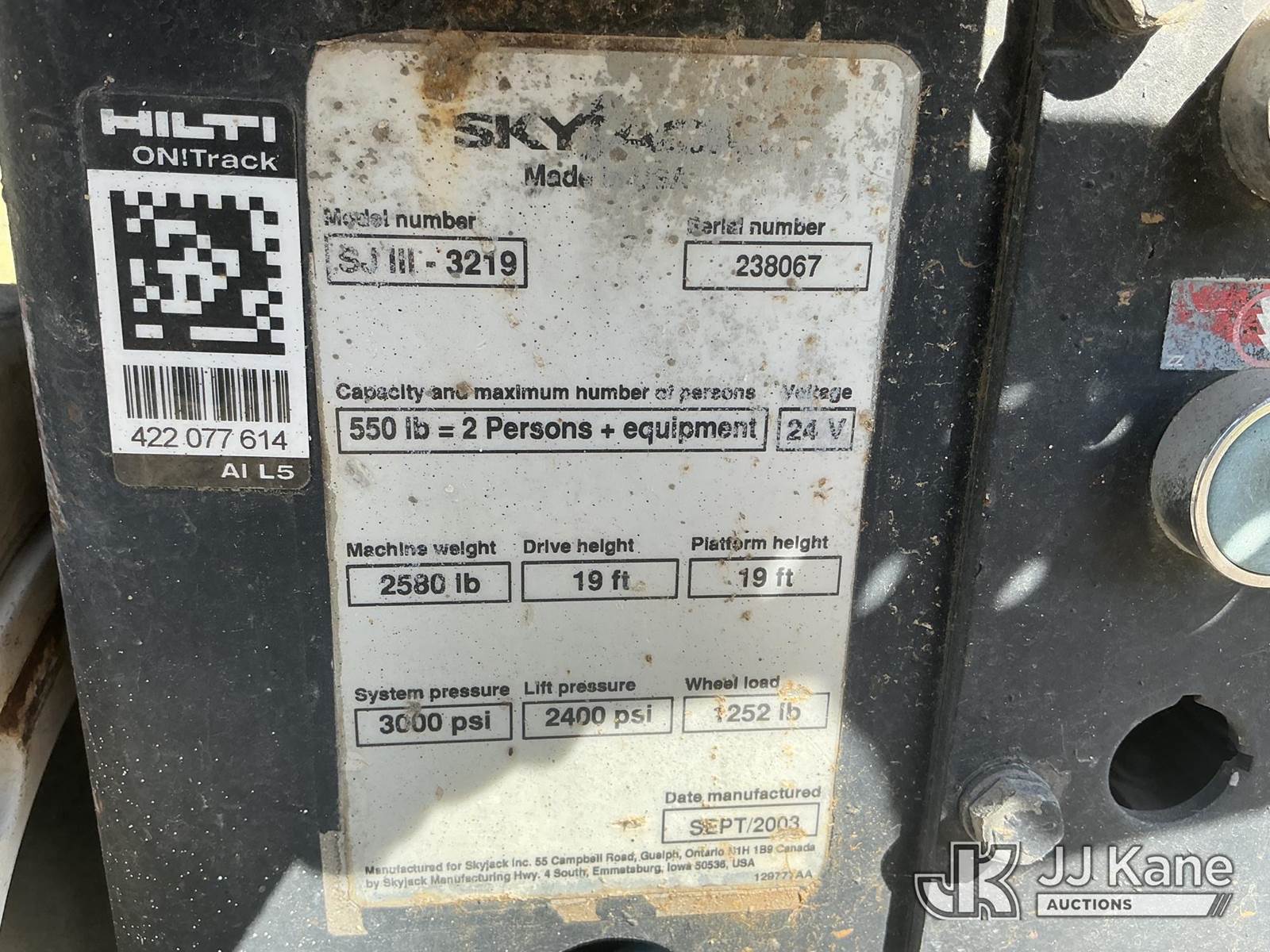 2003 SkyJack SJIII-3219 19 Foot Self-Propelled Scissor Lift, s/n 238067, 24v electric, Hydrostatic, (Runs, Moves & Operates) (No Key Needed) (Remote In Office) NOTE: This unit is being sold AS IS/WHERE IS via Timed Auction and is located in Thonotosassa, FL. Inspection & preview days for this unit are the 2 business days prior to the first day of items closing for this auction, item is located at 11720 N US 301 Thonotosassa, Fl 33592 and hours of operations are 8a-4p. For pre-sale questions, please contact Office Staff @ (813) 986-2485. (Buyer is responsible for removal. Assistance by consignor or JJ Kane Auctions is not assured.)