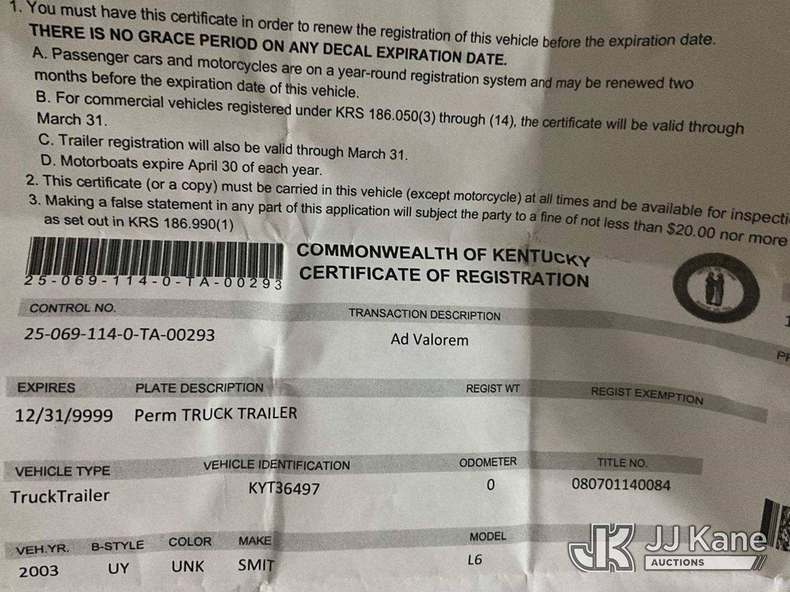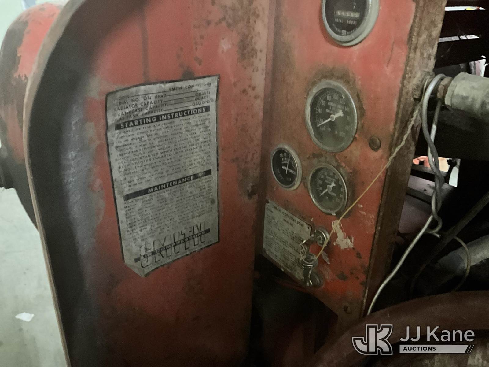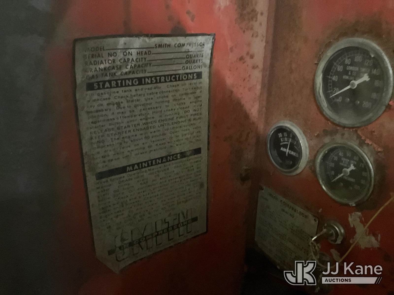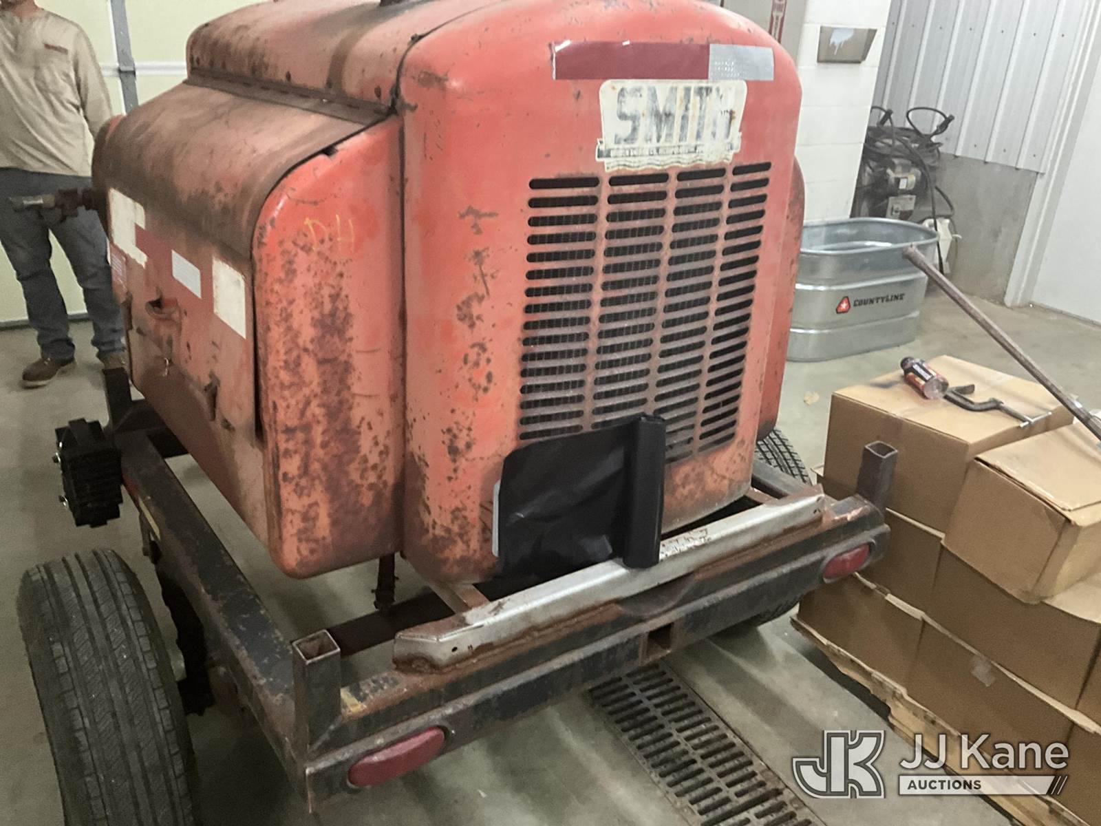 2003 Smith 75 Portable Air Compressor, s/n KYT36497, gas, trailer mtd (Runs & Operates) (Reads 25,045 hours) This is a Titled Item NOTE: This unit is being sold AS IS/WHERE IS via Timed Auction and is located in Bowling Green, KY. For more information & removal arrangements please contact Spencer Owen @ 502-232-2541. Load Out will be by appointment only M-F; must call 24 HRS. in advance. Buyer/Hauler must present copy of paid invoice upon arrival. Purchaser acknowledges ALL lots must be removed within 5 business days of Auction, or a storage fee may be incurred. This item is used and may contain defects that are not immediately detectable. Text description and photos given are meant to be used as a guide only. The conditions are provided by the consignor; you are responsible for inspecting item before bidding. All information provided is believed to be correct but no warranty as such is either intended or implied. All items are sold AS IS - WHERE IS AND WITH ALL FAULTS AND DEFECTS THEREIN. Auctioneer Michael Whitebread / License # 256617 (Buyer is responsible for removal. Assistance by consignor or JJ Kane Auctioneers is not assured.)