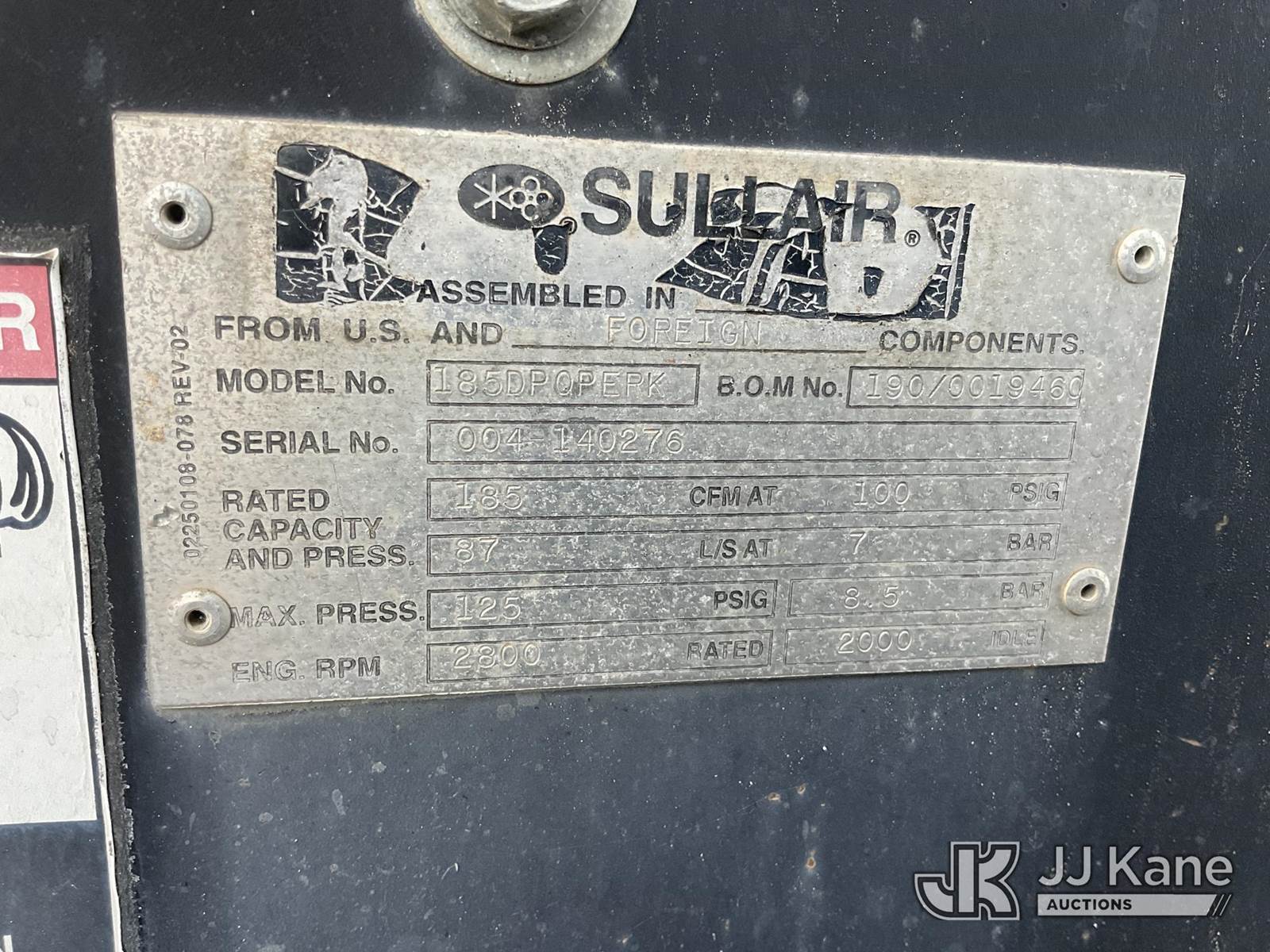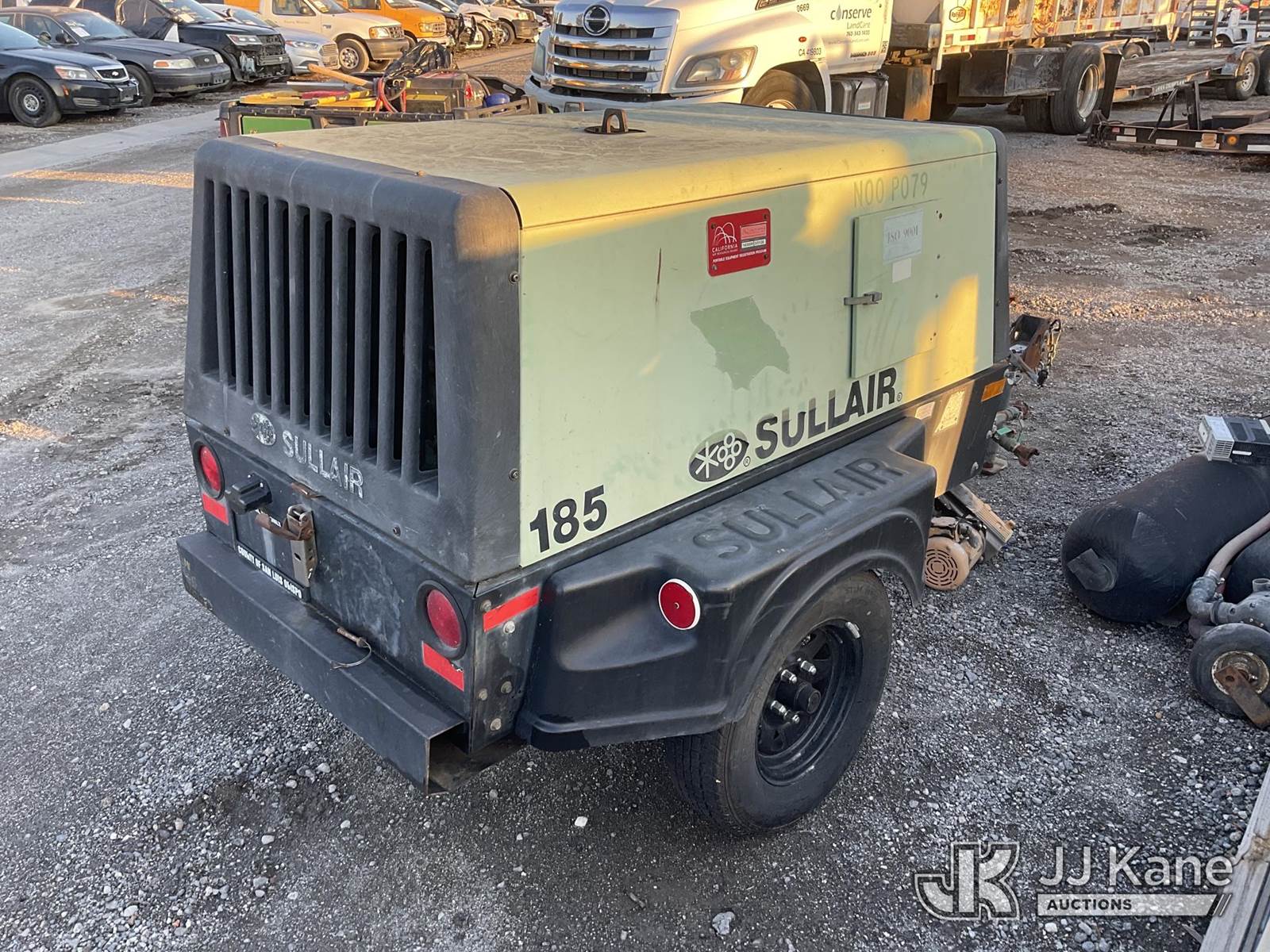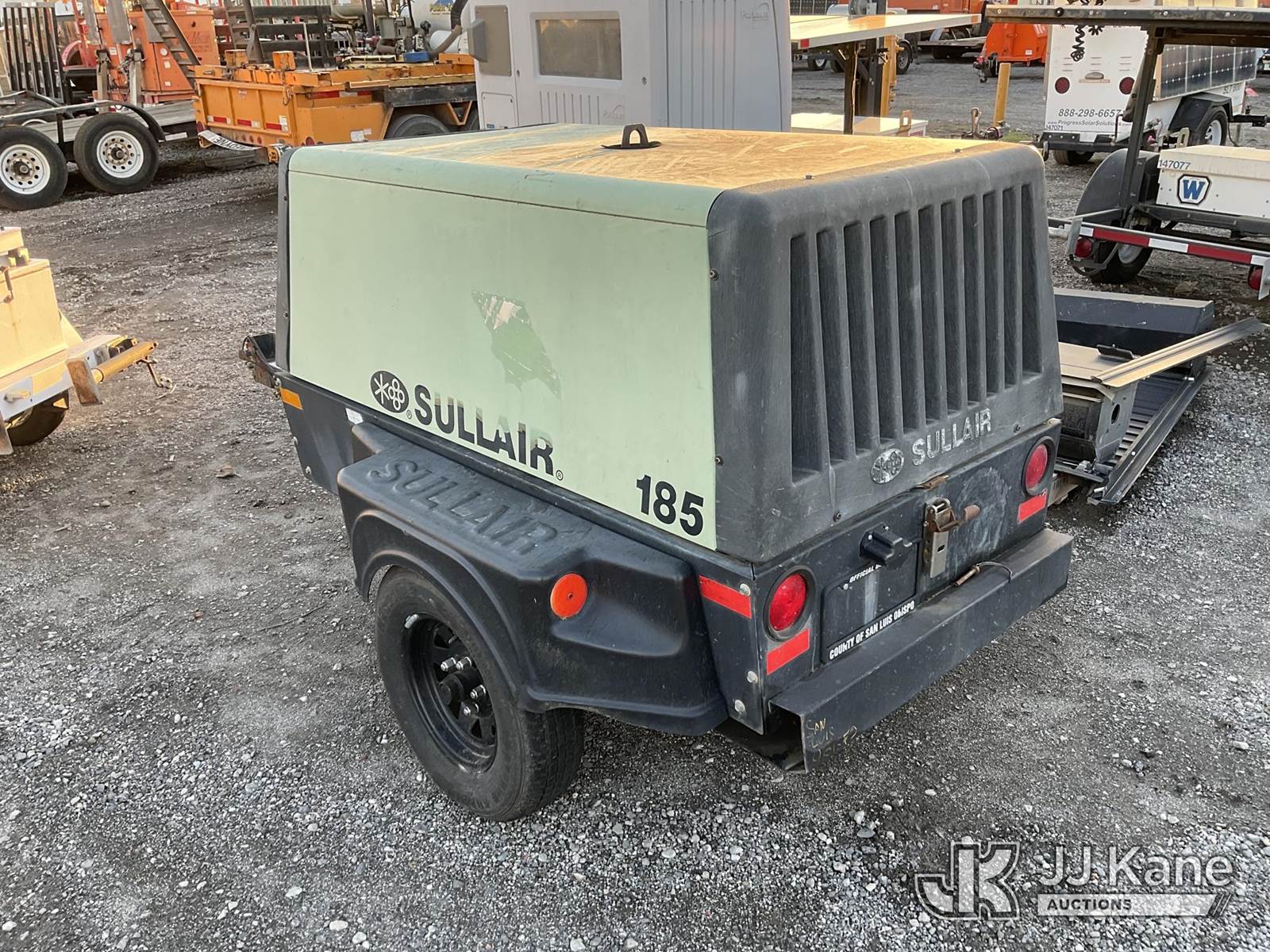 2003 Sullair 185 Air Compressor, 3-cyl diesel, with Ball Hitch, (Runs & Operates) (Reads 631 hours) May be subject to ARB Regulations This is a Titled Item NOTE: This unit is being sold AS IS/WHERE IS via Timed Auction and is located in Jurupa Valley, CA. Inspection & preview days for this unit are the 2 business days prior to the first day of items closing for this auction, item is located at 4510 Muth Way Jurupa Valley, CA 92509 and hours of operations are 8a-4p. For pre-sale questions, please contact please contact Office Staff @ (310) 353-7140. Dealer License Number 45696. (Buyer is responsible for removal. Assistance by consignor or JJ Kane Auctioneers is not assured.)