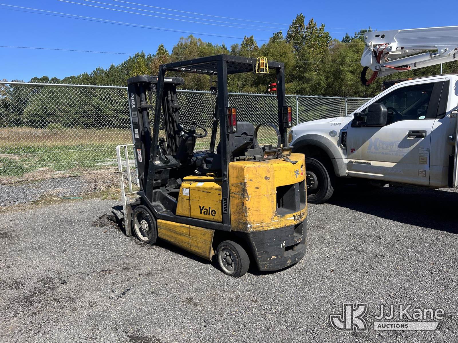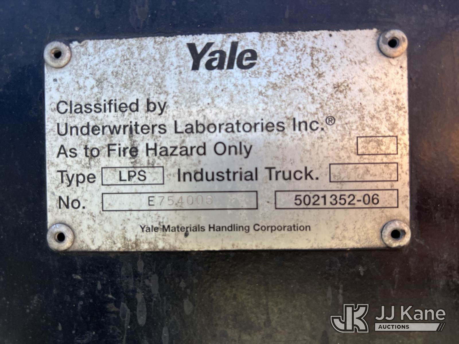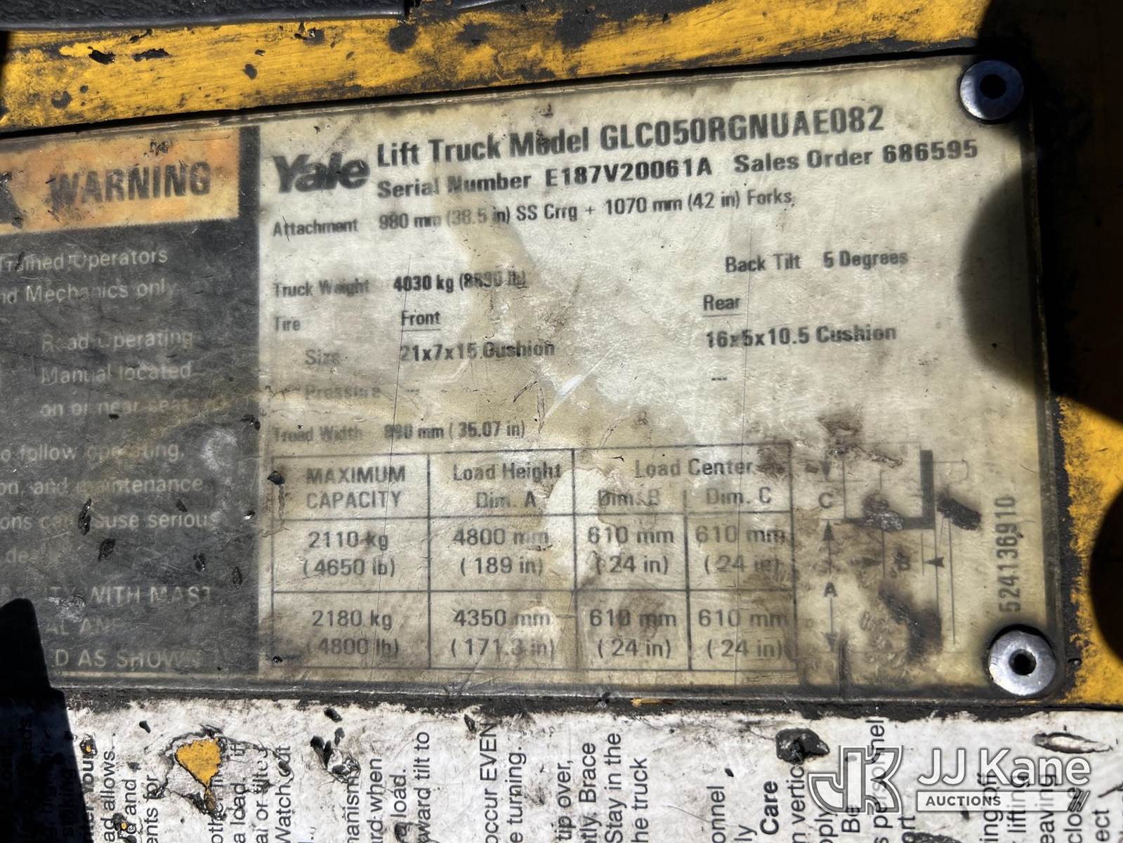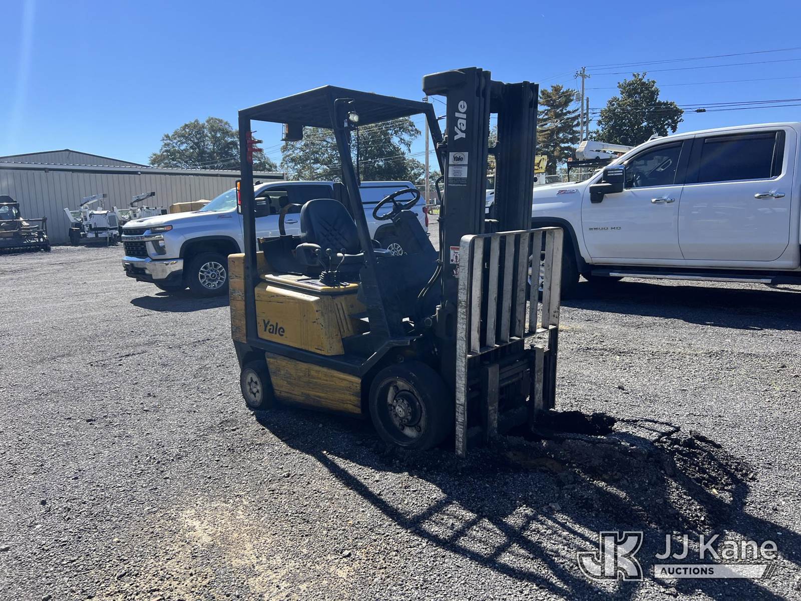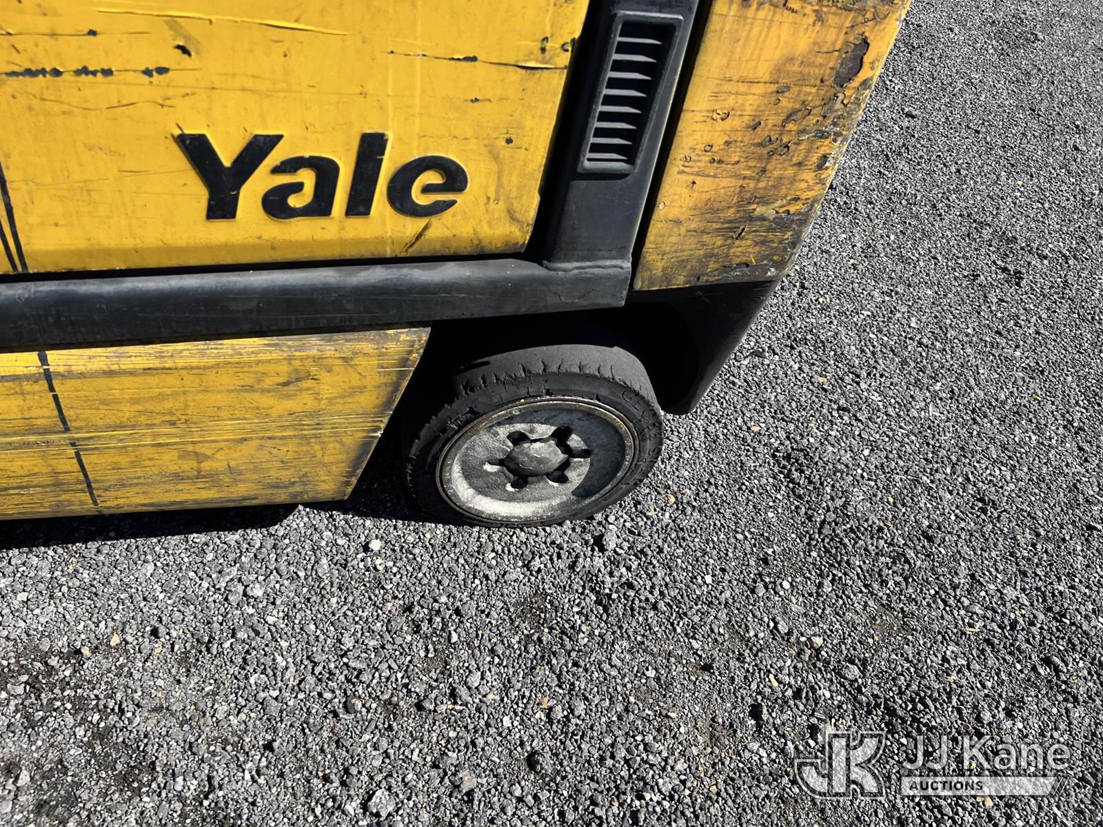 2003 Yale GLC050RGNJAE082 Solid Tired Forklift, s/n E187V20061A, 4-cyl, Shuttle, LPG, with 4,650 lift capacity, 189 in. mast height, 3-stage mast, side shift & ROPS, (Not Running, Missing LPG Tank, Condition Unknown) (Seller States; Requires Transmission) (Reads 9,640 hours) NOTE: This unit is being sold AS IS/WHERE IS via Timed Auction and is located in Albertville, AL. Inspection & preview days for this unit are by appointment only; please contact us at contact@jjkane.com or 84-Go-JJKane for more details. Alabama Auctioneer Michael Whitebread - License # 5592. (Buyer is responsible for removal. Assistance by consignor or JJ Kane Auctioneers is not assured.)