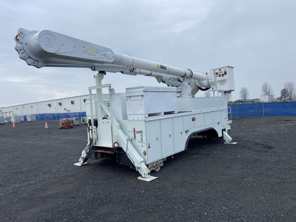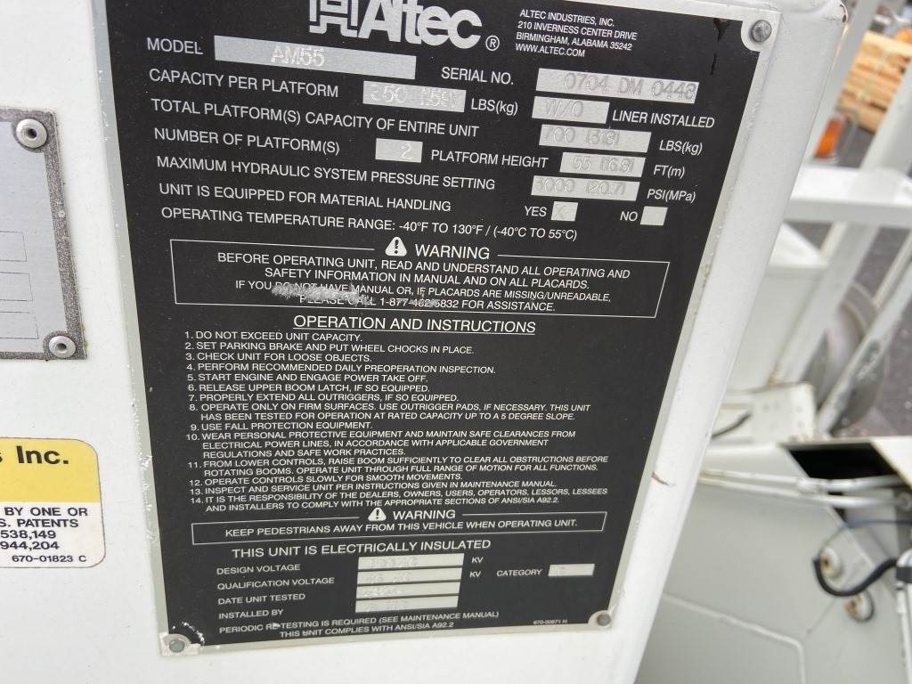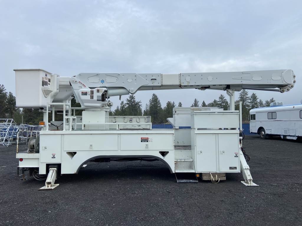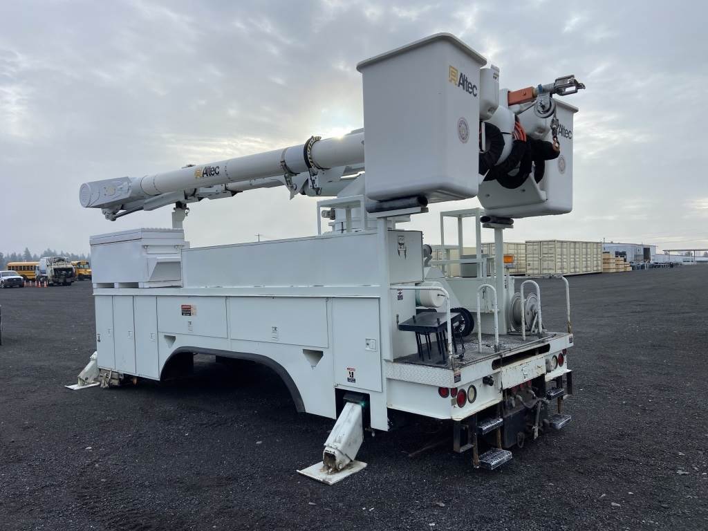 Location: Spokane WA ***End-User Consignment*** S/N: 772785688 20' x 8' Altec utility Body w/Altec AM55 articulating lift, 350lb capacity, 55' platform height, 2 buckets, 4 outriggers, 2 hose reels, 13 storage compartments, pintle hitch tow package.