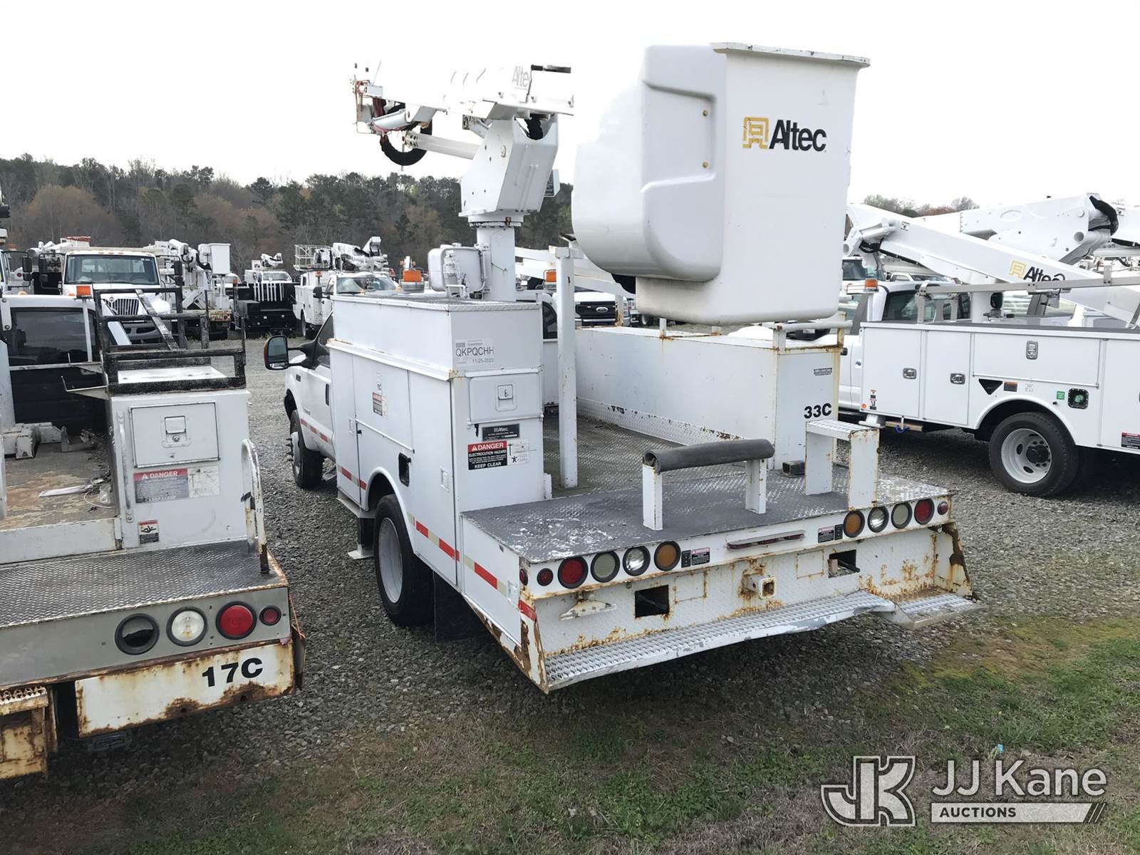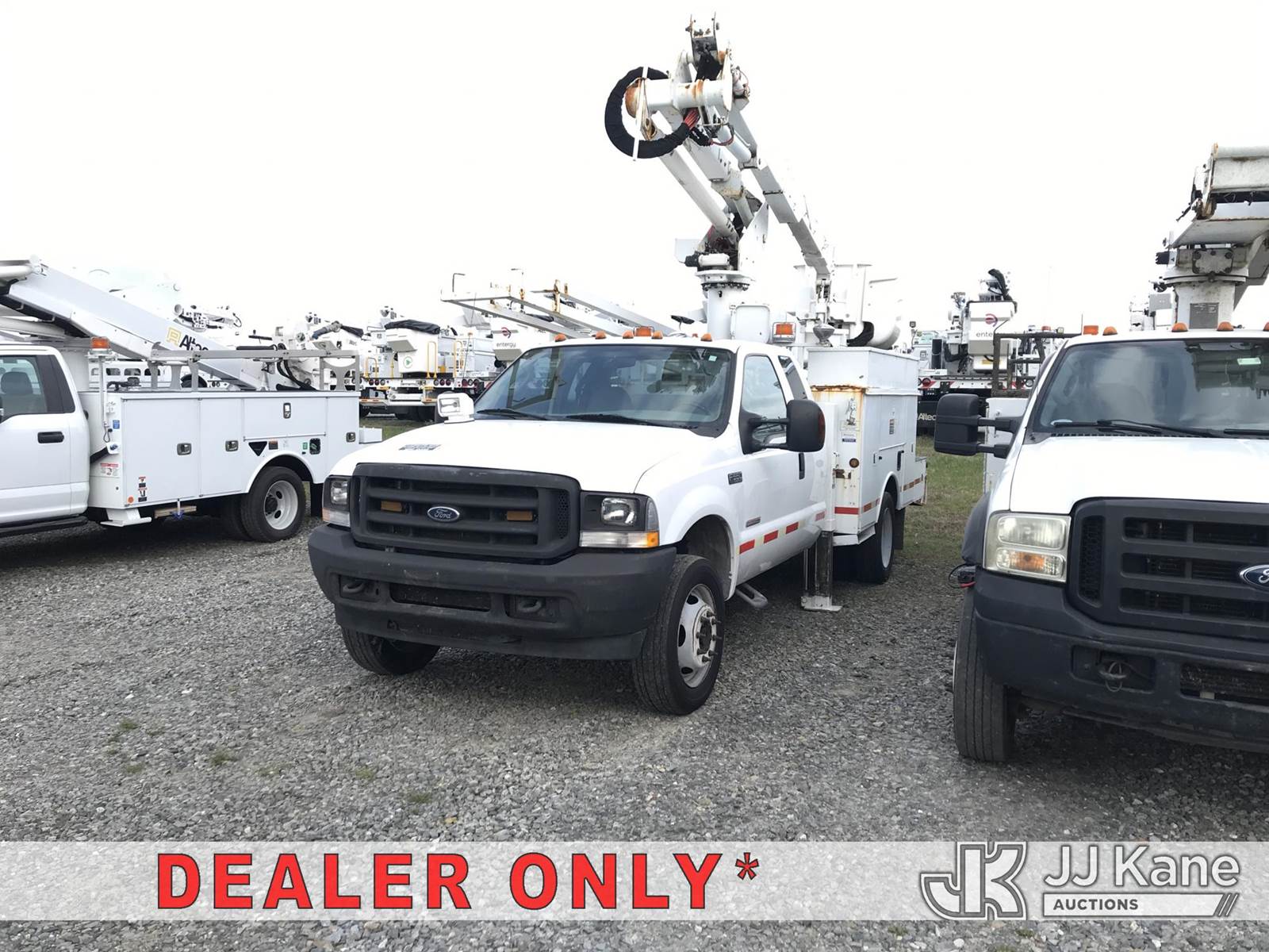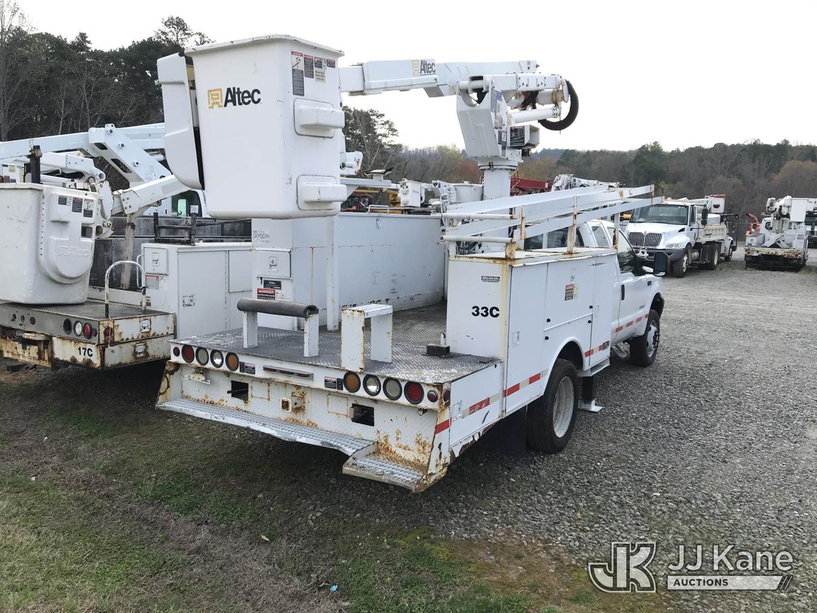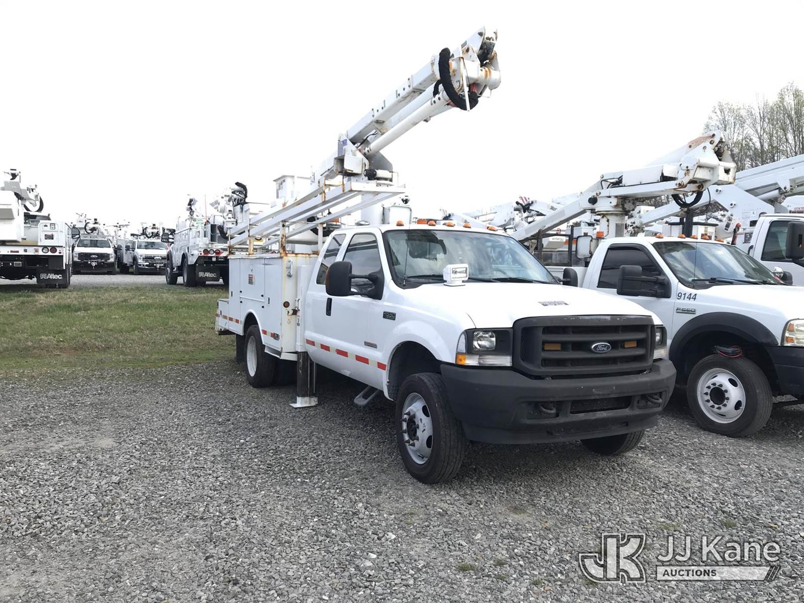 Altec AT37G, 42 ft, Articulating & Telescopic Bucket Truck s/n 0804DF4988, with single-man bucket & 2 hyd outriggers, mounted behind cab on 2004 Ford F550 4x4 Extended-Cab Service Truck, 6.0L V8 OHV 32V Diesel, Auto, (Exempt from Odometer Disclosure - Reads 123,085 miles) (Runs, Moves, Jump to Start) (Upper Operates; Note: This item has been removed from service due to the listed safety repairs that were not completed. The safety items below must be completed by an approved OEM facility before the unit can return to service: REPLACE LOWER LINK ARM ASSEMBLY, REPLACE ARTICULATING ARM ASSEMBLY, REPLACE DAMAGED PLATFORM ASSEMBLY, COMPLETE ANSI INSPECTION; COMPLETE ANY REQUIRED TESTING AND REPAIRS AFTER INSPECTIONS ARE COMPLETED) (Bidding Restricted to Licensed Vehicle Dealers Only), This is a Titled Item NOTE: This unit is being sold AS IS/WHERE IS via Timed Auction and is located in Mount Airy, NC. Inspection & preview days for this unit are by appointment only; please contact us at contact@jjkane.com or 84-Go-JJKane for more details. (Missing manuals, See Auction Company for Manufacturers Information to obtain manuals) (Buyer is responsible for removal. Assistance by consignor or JJ Kane Auctions is not assured.)