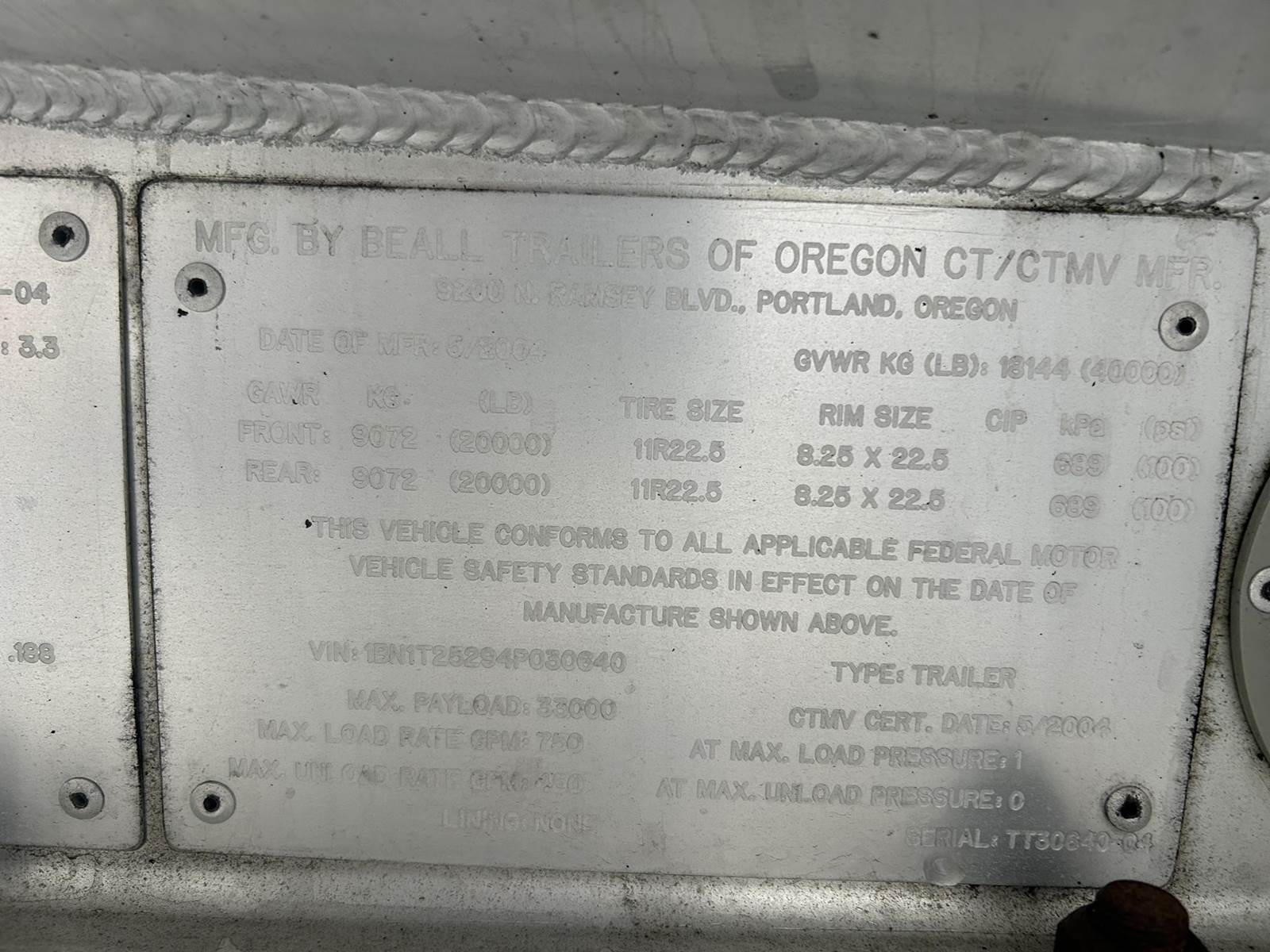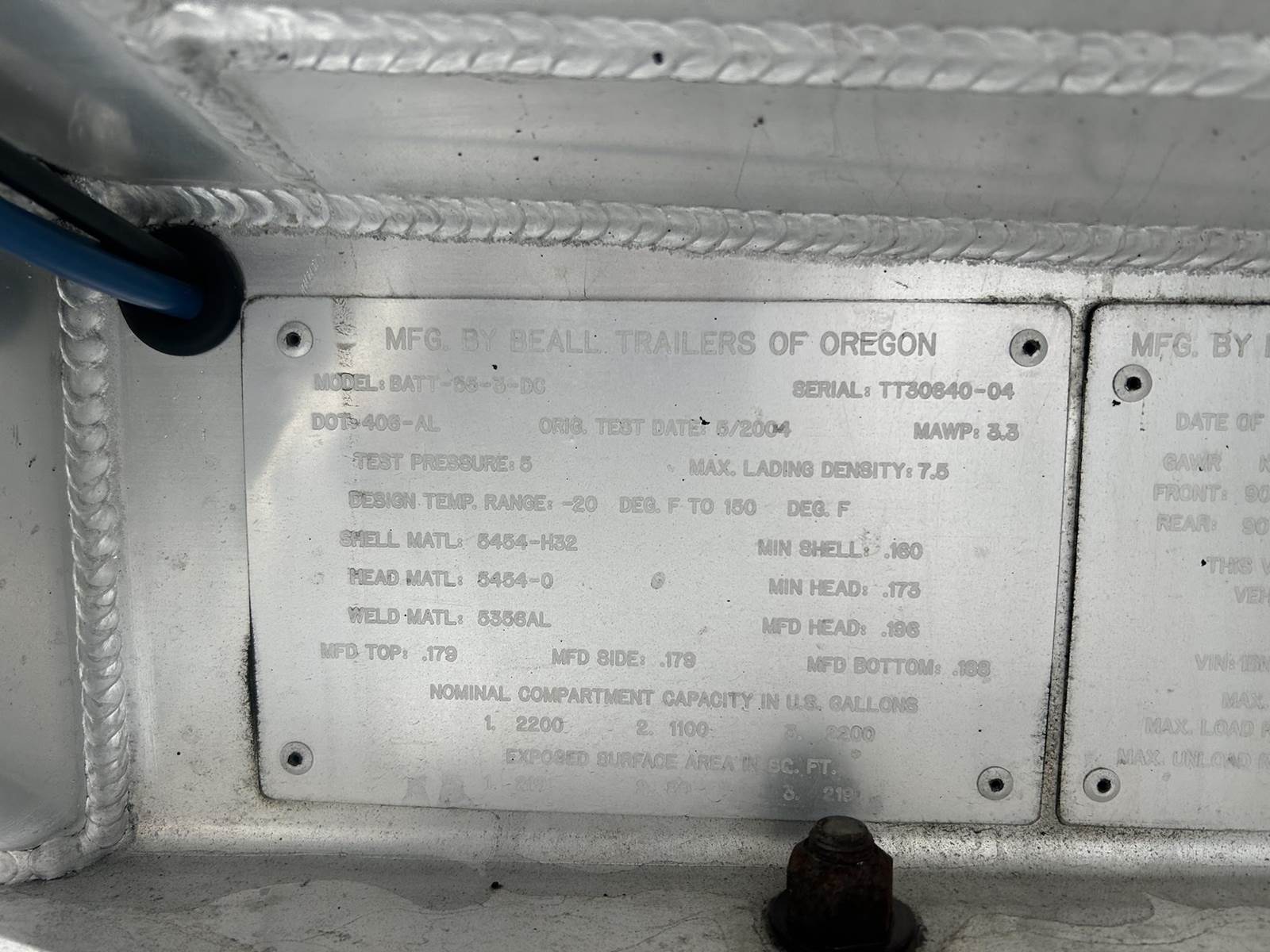 (Mfg. 5/2004), Model No. BATT-55-3-DC, Serial No. TT30640-04, DOT406AL, Aluminum Construction, 5500 Gal. Capacity, 3-Compartment (2200, 1100, 2200), All Double Bulkhead, Air Operated Internals, "Y" Bottom Load Heads w/ Brake Interlocks & Sight Glasses, Vapor Recovery w/ Brake Interlock, Optics Socket, Offside Gravity Drops, Offside Vapor Recovery, R/H Side Front Pump Line, Work Lights @ Load Heads, Air Ride Suspension, 255/70R22.5 Tires On Aluminum Wheels (Outsides Painted Black), Cam Style Drum Brakes, (3) R/H Side Hose Tubes w/ Fitting Box @ Front Of Trailer, Toolbox Mounted In Tongue, Front Aluminum Ladder...