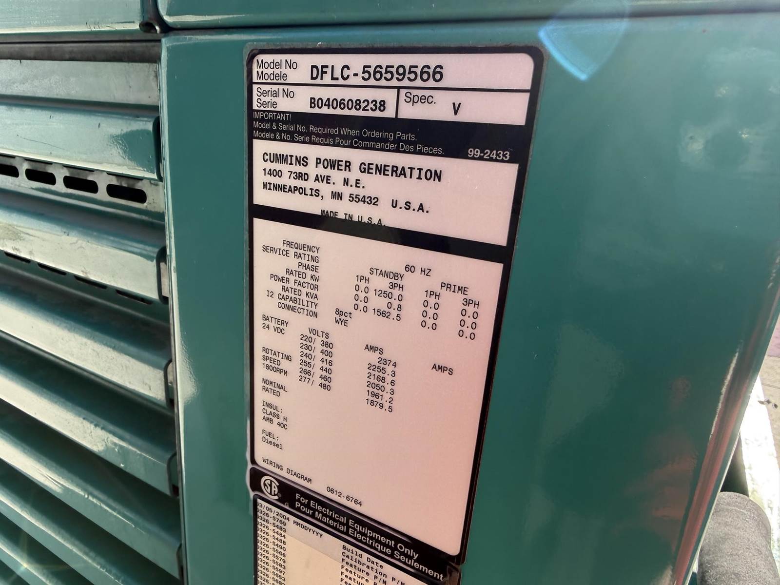 2004 Cummins DFLC Diesel Generator