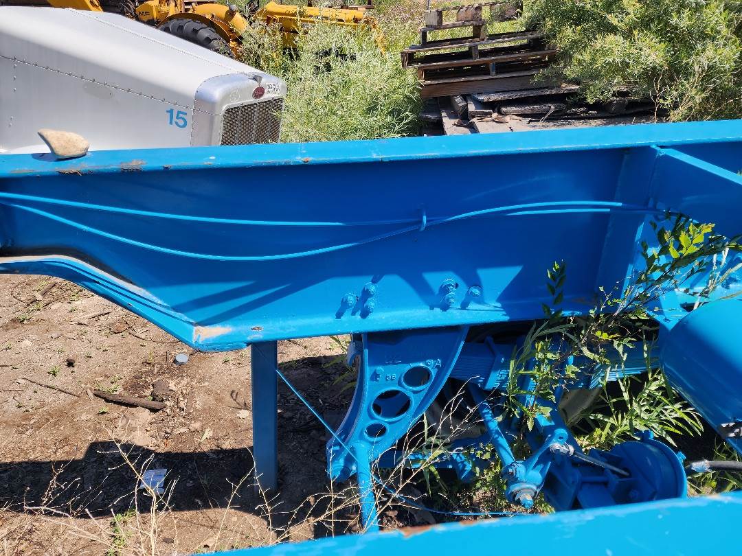Dolly Trailer custom built as a 2-axle jeep to fit most any trailer, to be used as a 2 axle pup with fifth wheel plate. Fruehauf axles and suspension. 3” wide leaf springs. Overall length, 255”, 96” rear bumper width, main beam width 46”, 18” deep beams. 191” from 5th wheel to center of axles. 95” from 5th wheel plate to center of axles. Brakes are good, Tires Fair. Slight tweak in the front beams in front of 5th wheel plate. Call for additional pictures or information.