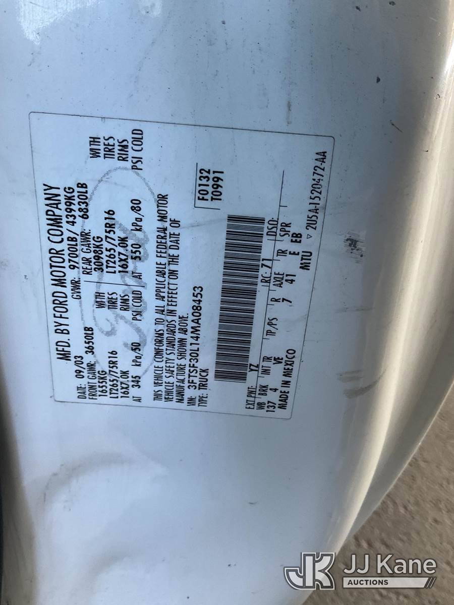 2004 Ford F-350 SD Pickup Truck, 8-cyl gas, Auto, A/C, with Tow package, Toolbox, (Exempt from Odometer Disclosure - Reads 117,786 miles) (Runs & Moves) This is a Titled Item NOTE: This unit is being sold AS IS/WHERE IS via Timed Auction and is located in Jurupa Valley, CA. Inspection & preview days for this unit are the 2 business days prior to the first day of items closing for this auction, item is located at 4510 Muth Way Jurupa Valley, CA 92509 and hours of operations are 8a-4p. For pre-sale questions, please contact please contact Office Staff @ (310) 353-7140. Dealer License Number 45696. (Buyer is responsible for removal. Assistance by consignor or JJ Kane Auctions is not assured.)