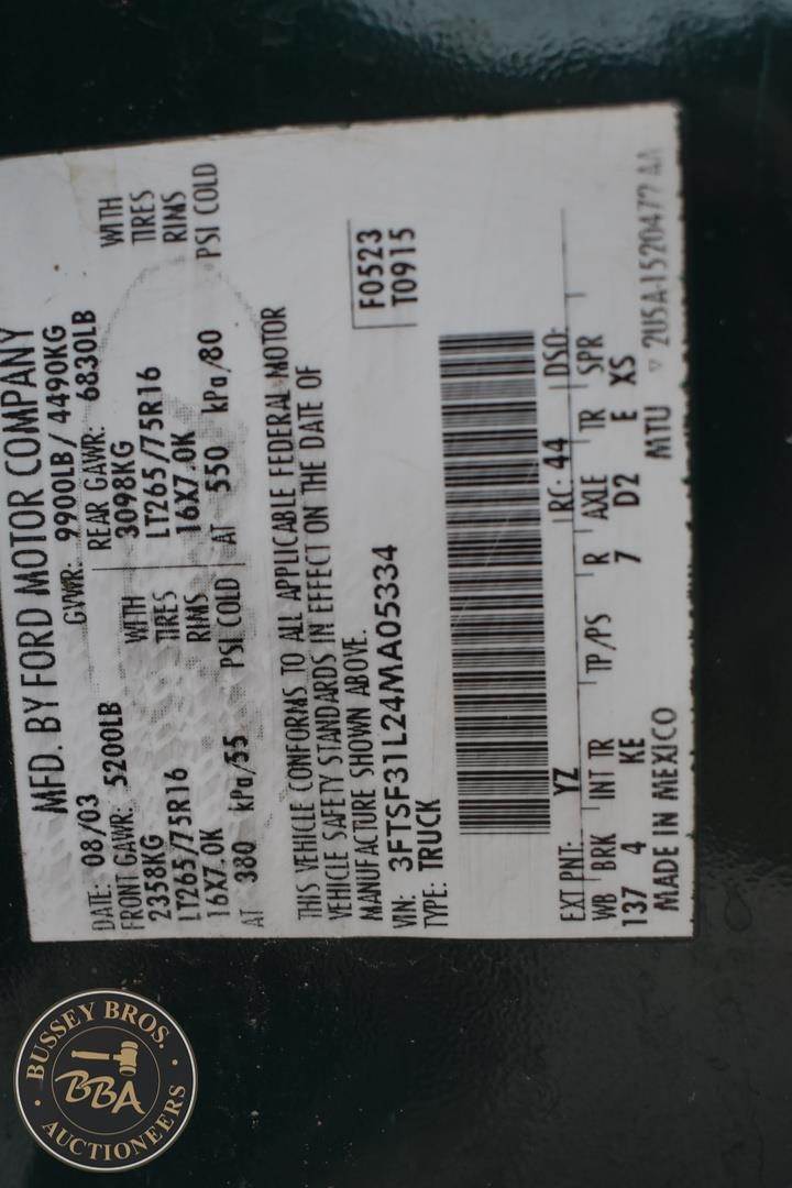 2004 Ford F350 4x4 Pickup Truck,5.4 liter triton V8 gas engine,Automatic transmission with overdriv ,9,900 lb GVWR Package, Trailer Tow package with electric brake controller, XL décor to include tilt, cruise, air, stereo, and more, Spray in bed liner, 94,501 miles ,VIN:3FTSF31L24MA05334