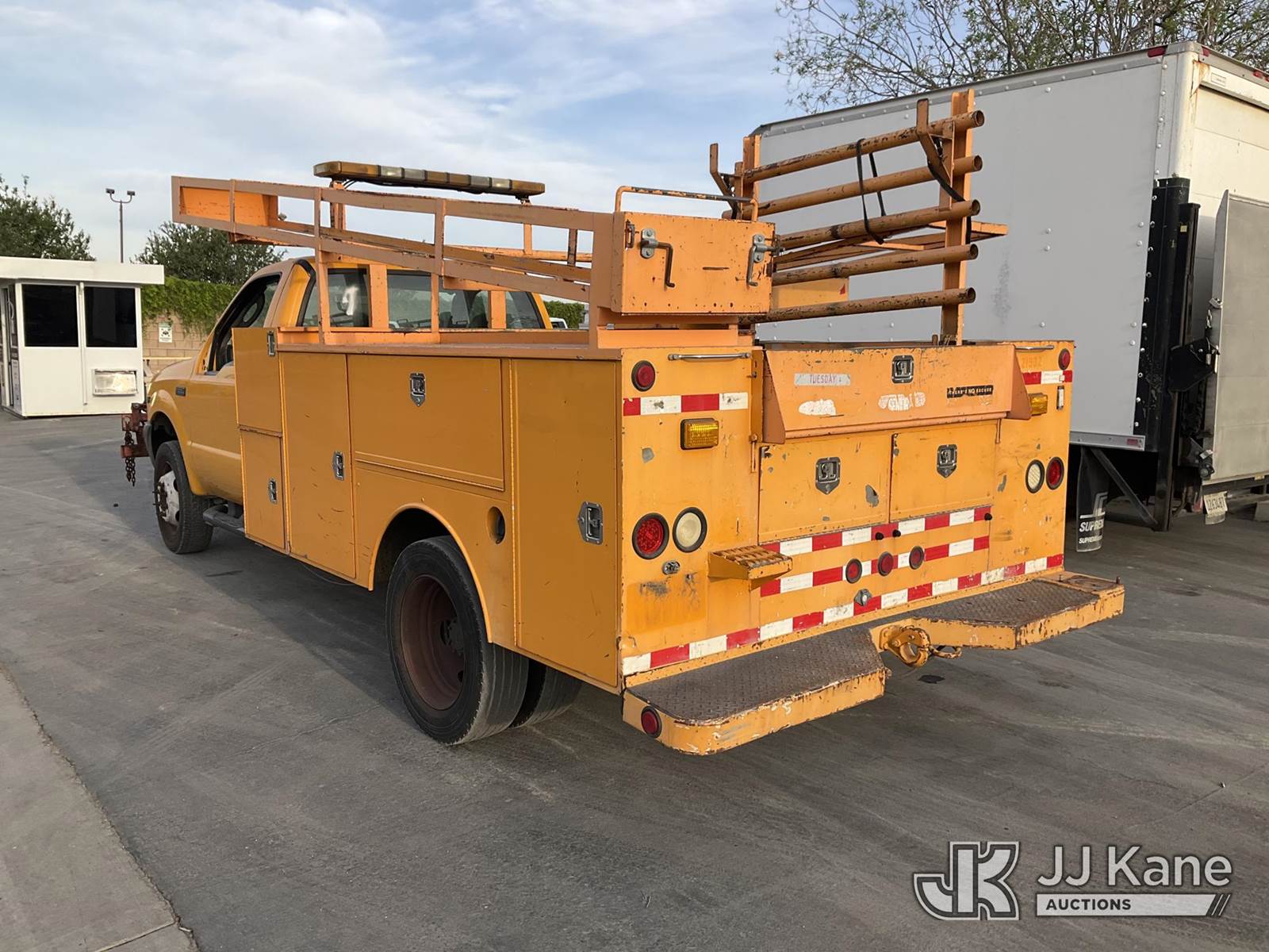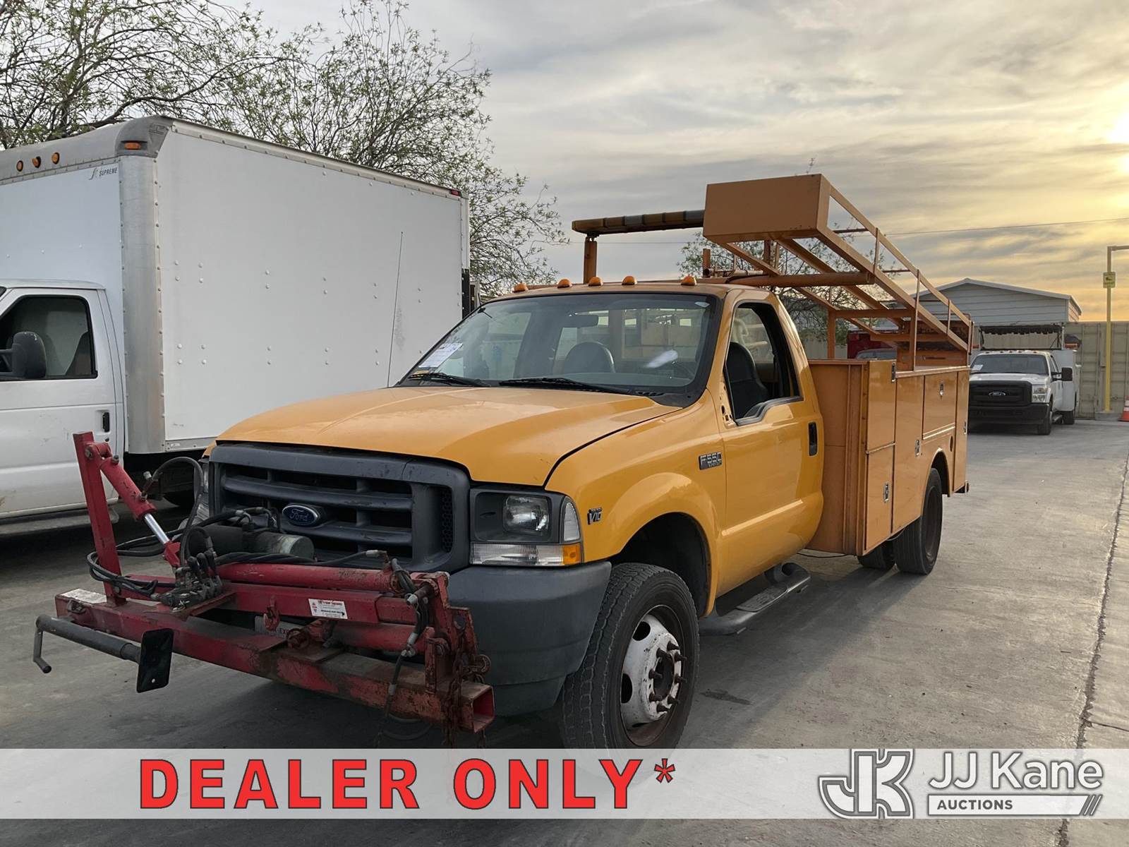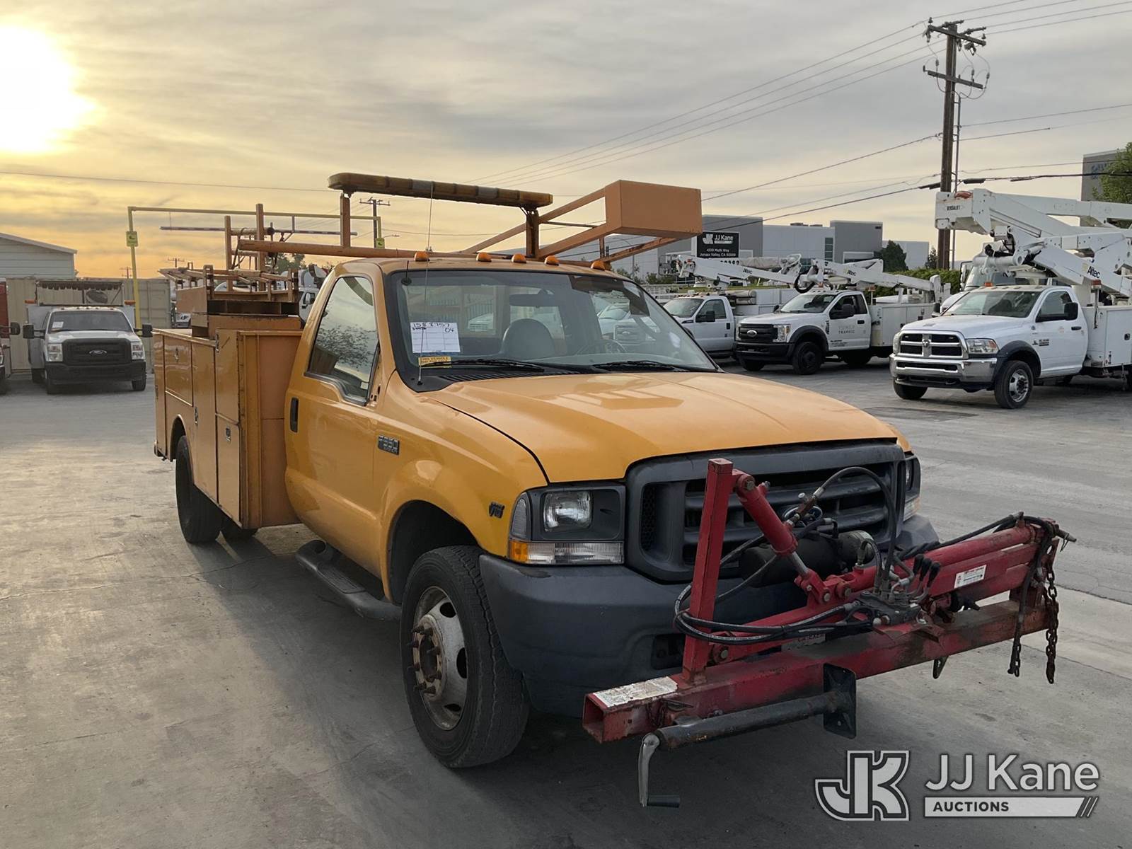 2004 Ford F-550 Regular Cab 2WD DRW Service Truck, s/n 1FDAF56S64ED34885, 6.8L V10 SOHC 20V RWD, GAS, Auto, A/C, with hydraulic post puller, tow package, ladder rack, utility bed, (Exempt from Odometer Disclosure - Reads 121,517 miles) (Runs & Moves, Right Turn Signal Is Out ) (Bidding Restricted to Licensed Vehicle Dealers Only), This is a Titled Item NOTE: This unit is being sold AS IS/WHERE IS via Timed Auction and is located in Jurupa Valley, CA. Inspection & preview days for this unit are the 2 business days prior to the first day of items closing for this auction, item is located at 4510 Muth Way Jurupa Valley, CA 92509 and hours of operations are 8a-4p. For pre-sale questions, please contact please contact Office Staff @ (310) 353-7140. Dealer License Number 45696. (Buyer is responsible for removal. Assistance by consignor or JJ Kane Auctions is not assured.)