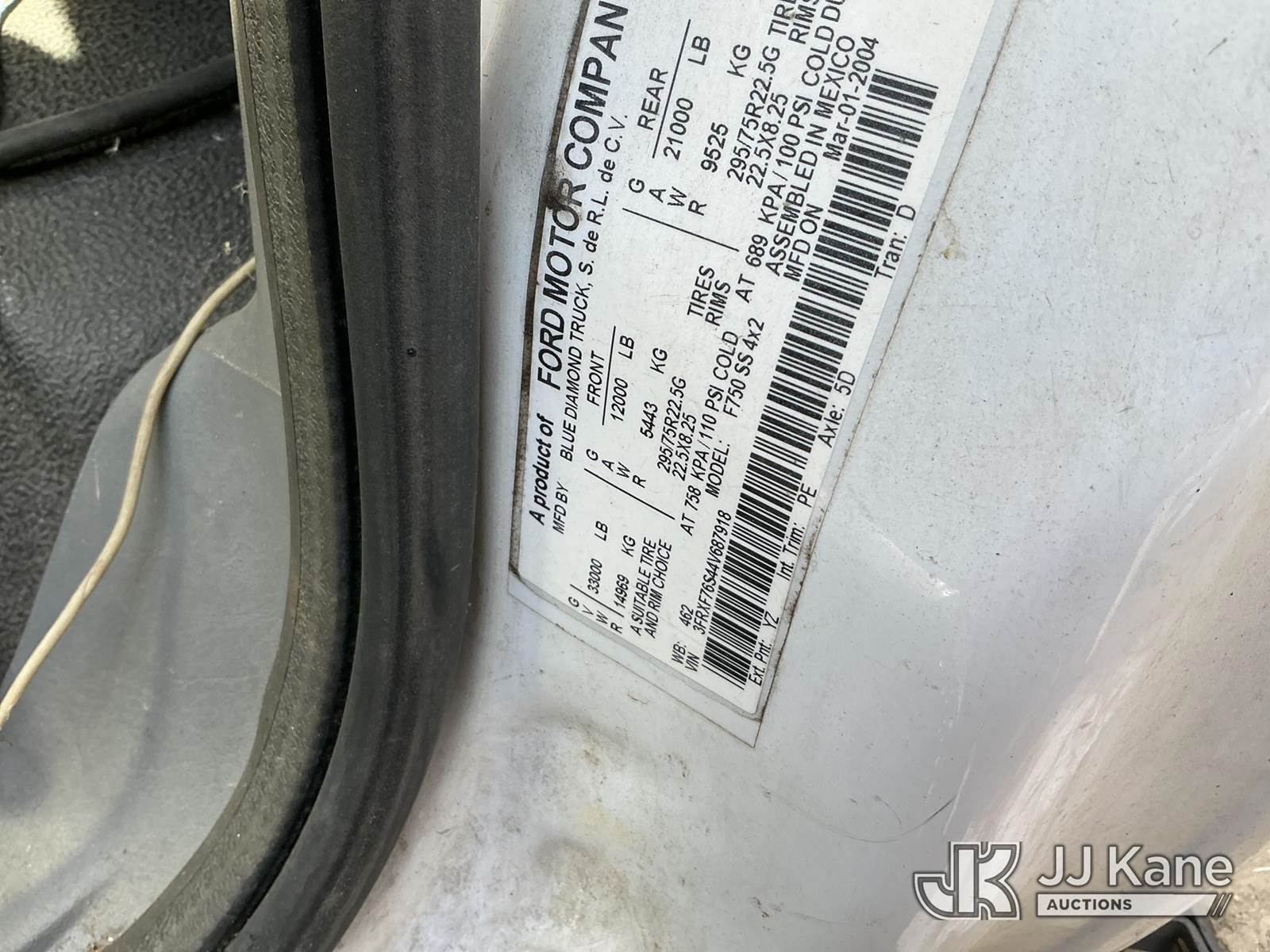 2004 Ford F-750 Chipper Dump Truck, 7.2L diesel, 4X2, Auto, A/C, (Exempt from Odometer Disclosure - Reads 134,209 miles) (Not Running, Dead Battery, Condition Unknown, Debris in Bed) This is a Titled Item NOTE: This unit is being sold AS IS/WHERE IS via Timed Auction and is located in Enoree, SC. For more information & removal arrangements please contact, Pete Klimek @ (843) 323-6538. (Buyer is responsible for removal. Assistance by consignor or JJ Kane Auctions is not assured.)