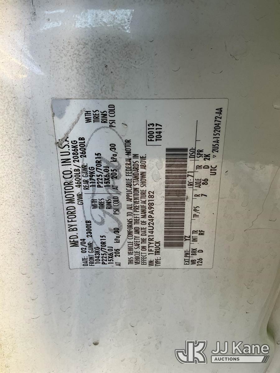 2004 Ford Ranger Extended-Cab Pickup Truck, s/n 1FTYR14U24PA98182, 3.0L V6 OHV 12V RWD, GAS, 5-Speed Automatic, A/C, with Tow package, (Exempt from Odometer Disclosure - Reads 113,968 miles) (Runs & Moves, Missing Tail Light, Shaking In Idle/Drive, Engine Light On) (Bidding Restricted to Licensed Vehicle Dealers Only), This is a Titled Item NOTE: This unit is being sold AS IS/WHERE IS via Timed Auction and is located in Jurupa Valley, CA. Inspection & preview days for this unit are the 2 business days prior to the first day of items closing for this auction, item is located at 4510 Muth Way Jurupa Valley, CA 92509 and hours of operations are 8a-4p. For pre-sale questions, please contact please contact Office Staff @ (310) 353-7140. Dealer License Number 45696. (Buyer is responsible for removal. Assistance by consignor or JJ Kane Auctions is not assured.)