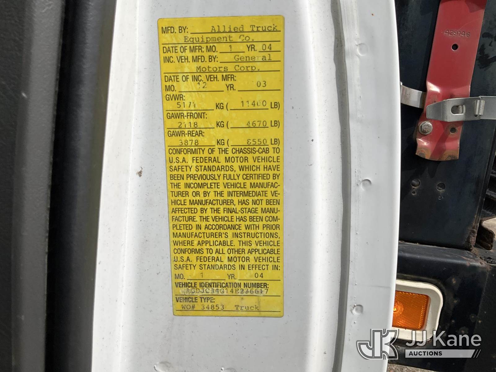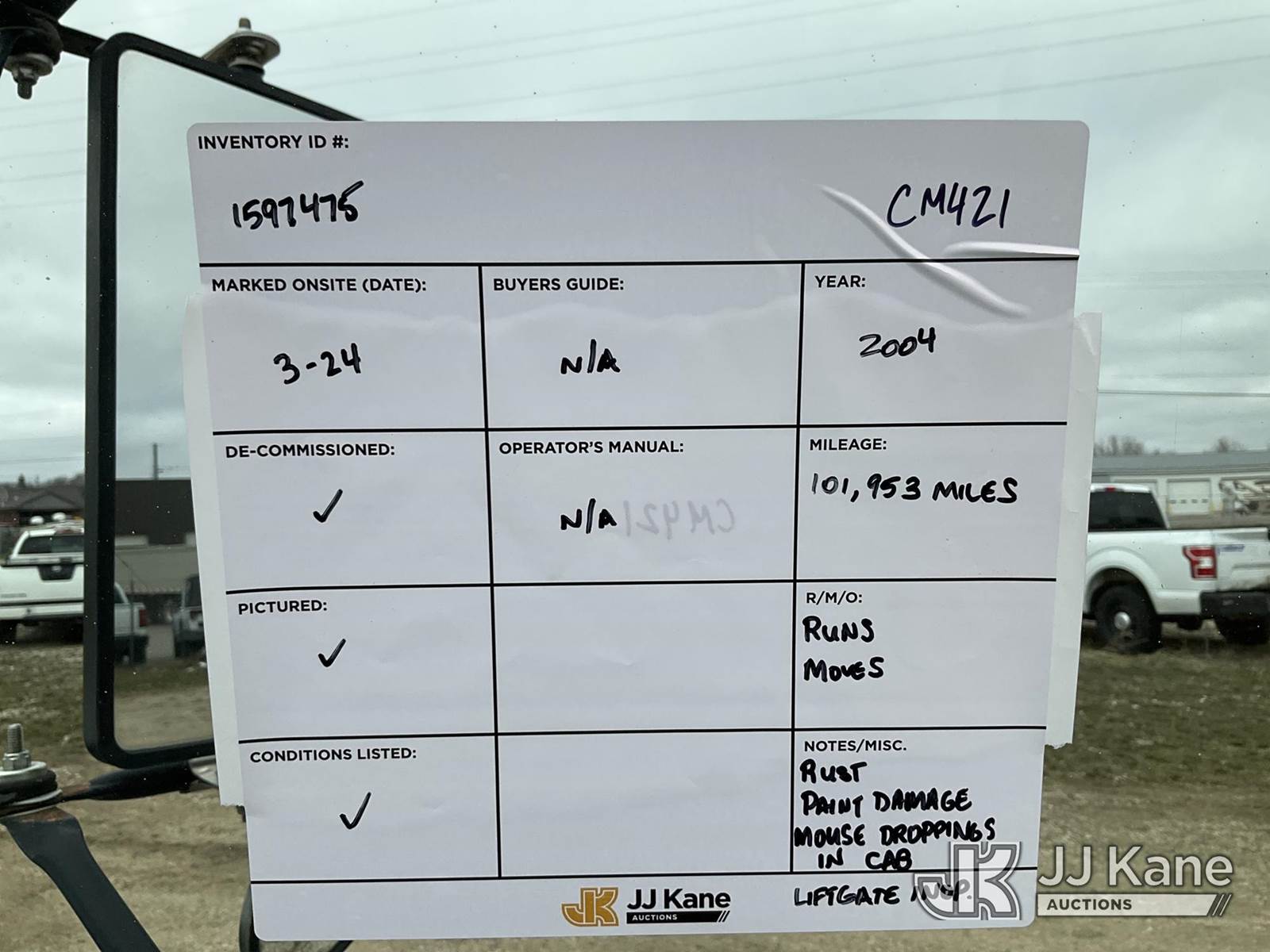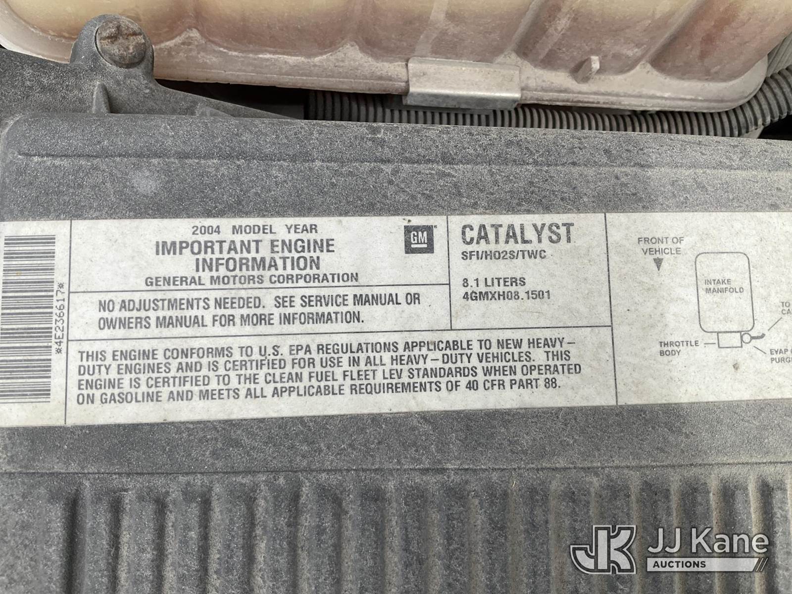 2004 GMC Sierra 3500 Flatbed Truck, 8-cyl gas, Auto, A/C, with stake sides, lift gate (inoperable), (Exempt from Odometer Disclosure - Reads 101,953 miles) (Runs & Moves) (Rust, Paint Damage, Mouse Droppings in Cab) This is a Titled Item NOTE: This unit is being sold AS IS/WHERE IS via Timed Auction and is located in Charlotte, MI. Inspection & preview days for this unit are the 2 business days prior to the first day of items closing for this auction, item is located at 750 Island Hwy Charlotte, MI 48813 and hours of operations are 8a-4p. For pre-sale questions, please contact Corey Cook at (517) 983-0796 or corey.cook@jjkane.com (Buyer is responsible for removal. Assistance by consignor or JJ Kane Auctions is not assured.)