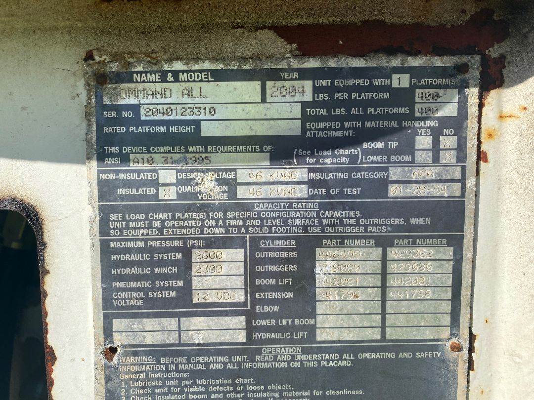 2004 GMC T7500 Bucket Truck, 7.8-L L-6 Turbo Diesel, Automatic Transmission, Air, GVWR 33,000 pounds, Fiberglass service body. Terex Command All - Crane, Bucket, Hydraulic Drill. Front winch, Good tires and runs well.