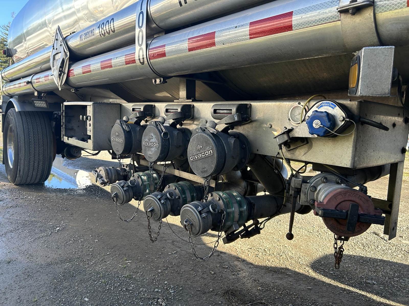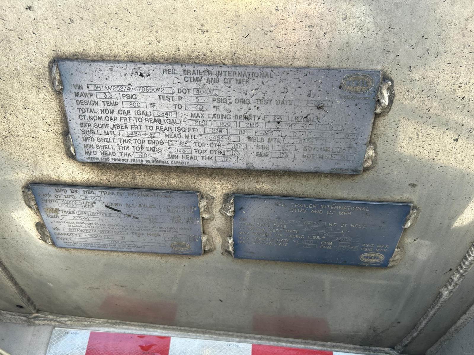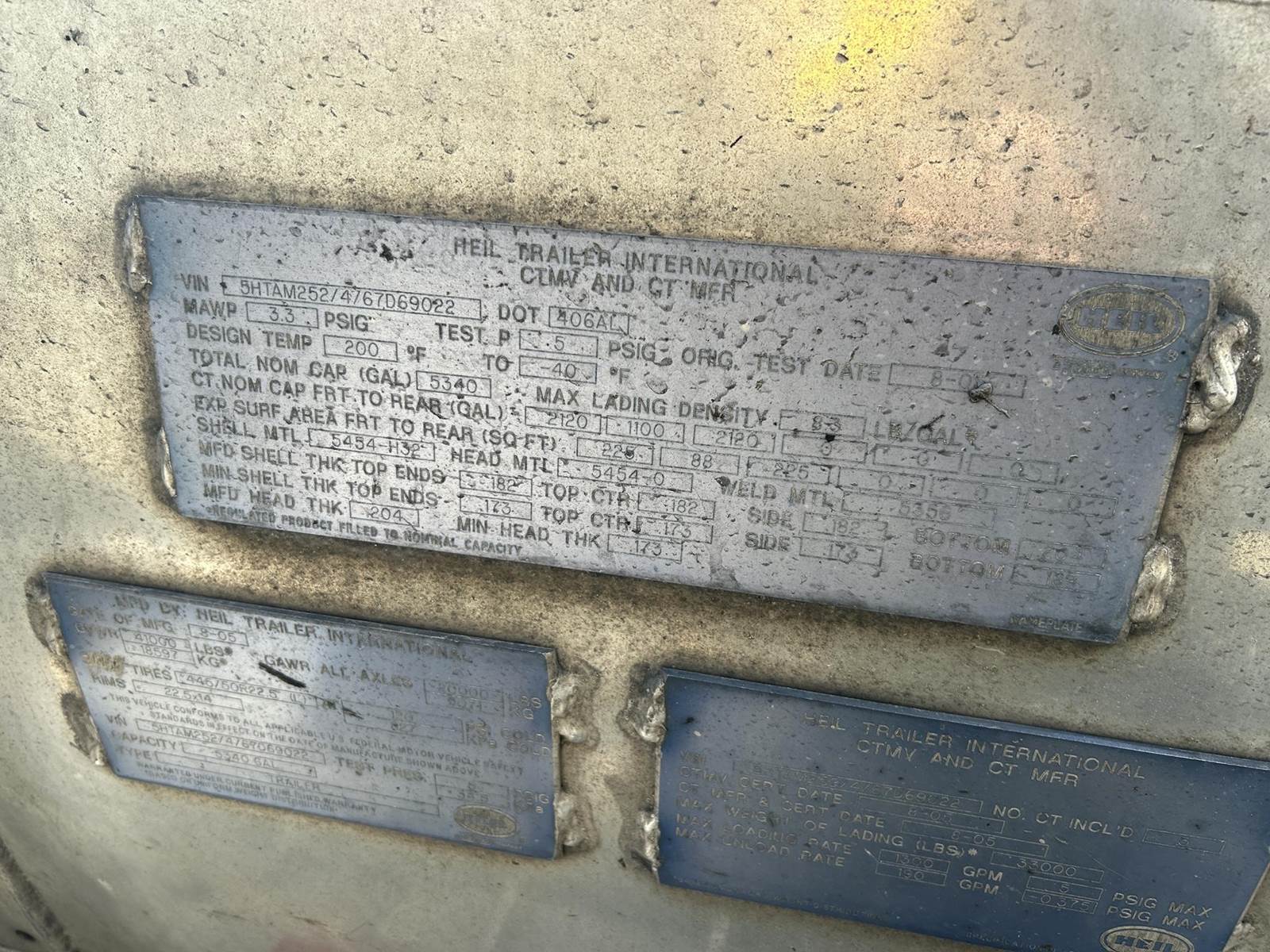 (Mfg. 08/2005), DOT406AL, Aluminum Construction, 5,340 Gallons, 3-Compartment (2120, 1100, 2120), Air Operated Internals, 'Y' Bottom Load Heads w/ Brake Interlocks & Sight Glasses, Roto Tags, Dual Vapor Recoveries w/ Brake Interlocks, Optics Socket w/ Brake Interlock, Dixon FloTech OverFill Monitor, Air Ride Suspension, Cam Style Drum Brakes, 455/55R22.5 Super Single Tires On Aluminum Wheels, (2) R/H Side Stacked Hose Tubes w/ Fitting Box @ Front, Aluminum Ladder @ Front Of Trailer, Cone Holder In Tongue...