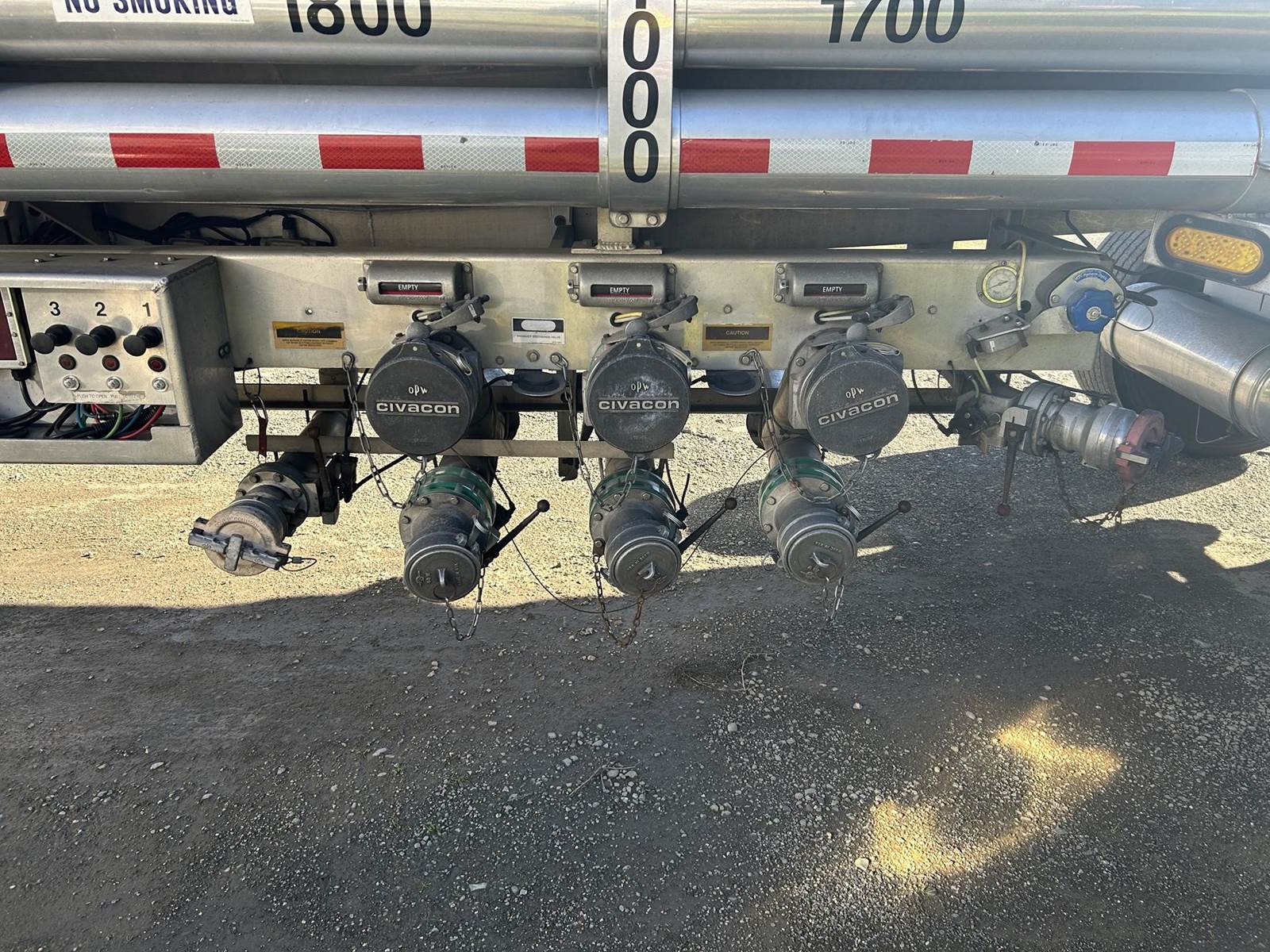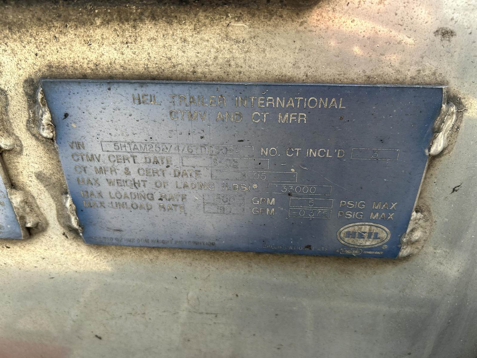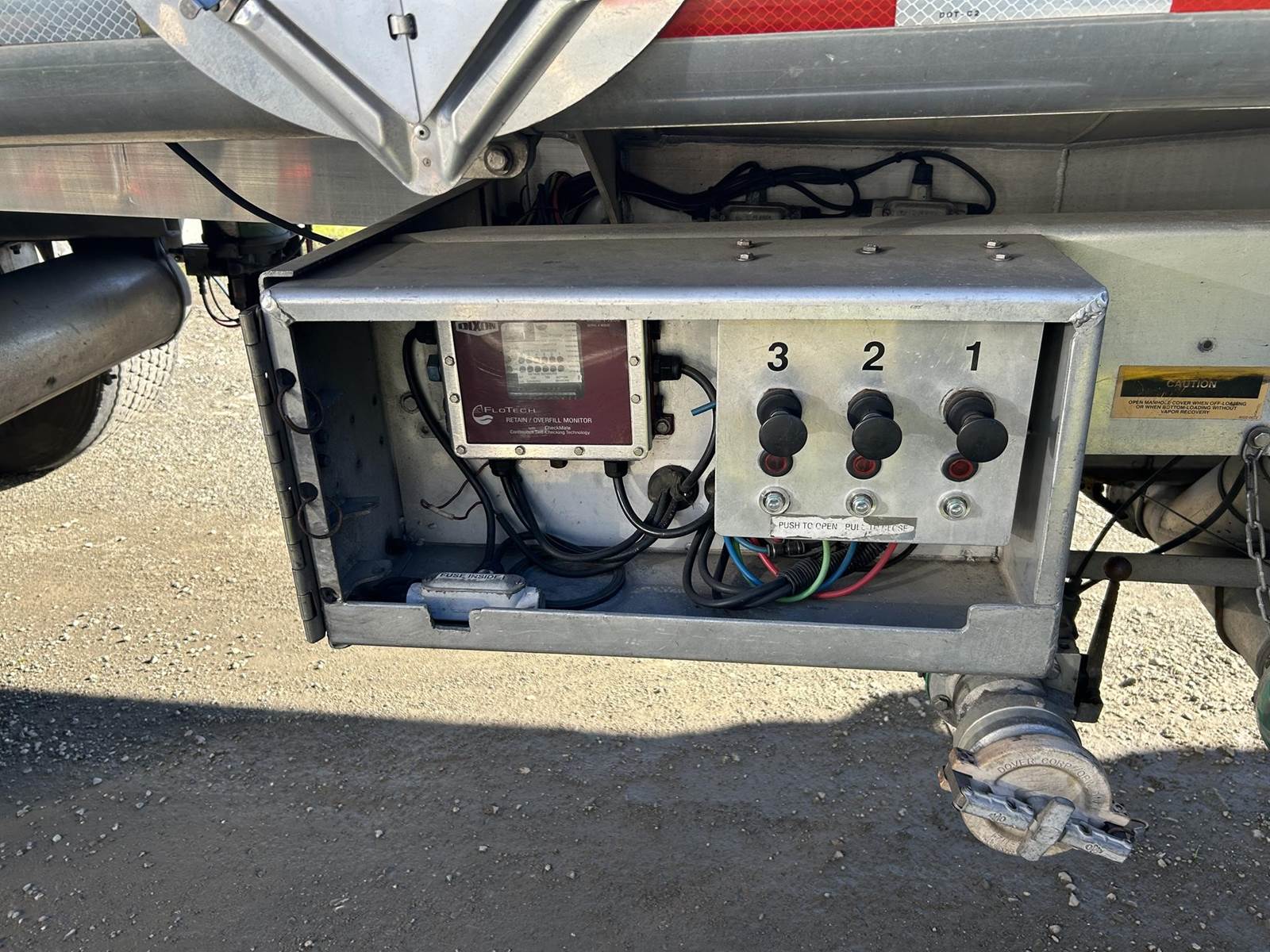 (Mfg. 08/2005), DOT406AL, Aluminum Construction, 5,340 Gallons, 3-Compartment (2120, 1100, 2120), Air Operated Internals, 'Y' Bottom Load Heads w/ Brake Interlocks & Sight Glasses, Roto Tags, Dual Vapor Recoveries w/ Brake Interlocks, Optics Socket w/ Brake Interlock, Dixon FloTech OverFill Monitor, Air Ride Suspension, Cam Style Drum Brakes, 455/55R22.5 Super Single Tires On Aluminum Wheels, (2) R/H Side Stacked Hose Tubes w/ Fitting Box @ Front, Aluminum Ladder @ Front Of Trailer, Cone Holder In Tongue...